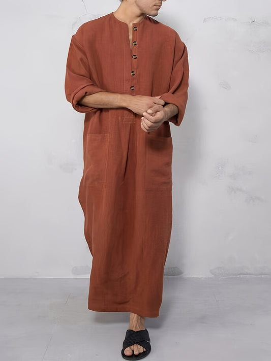 Southeast Asian Men's Loose Striped Round Neck Long Sleeve Muslim Robe Hoodie Pocket Middle Eastern Abaya