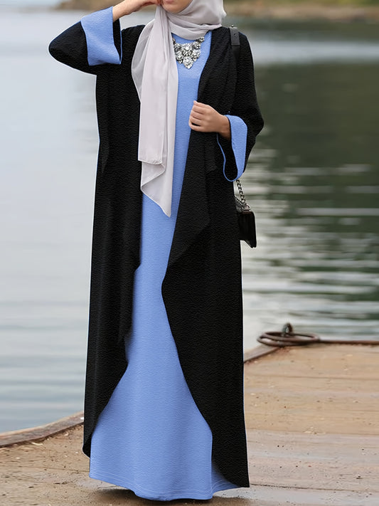 Women's Middle Eastern Muslim Solid Color Long Dress + Robe Jacket Two-Piece Set