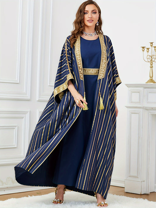 Oriented Spot Middle East Dubai Muslim Women's Abaya Four Seasons Round Neck Ramadan New Long Dress Regular Fit Ultra Thick Texture Super Soft Fabric Open Front Two-Piece Set Golden Belt Craft Flared Sleeve Lightweight Elegan