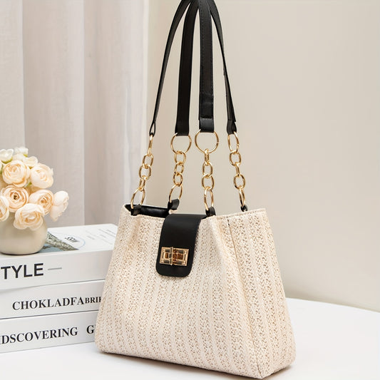Women'S 2025 New Year Handwoven Straw Tote Bag - Black Accents, Honeycomb Pattern, Adjustable Shoulder Strap, Kiss Lock Closure, Machine Washable, Beach & Casual Style, Casual Tote Bag|Honeycomb Pattern Bag|Durable Handle Bag