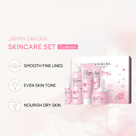 【7pcs Skin Care Set: Toner 5.41oz; Essence 1.01oz; Facial Cleanser 100g; Face Cream 50g; Eye Cream 30g; Hairband; Cleansing Sponge】LAIKOU JAPAN SAKURA SKINCARE SET With Hairband And Cleansing Sponge