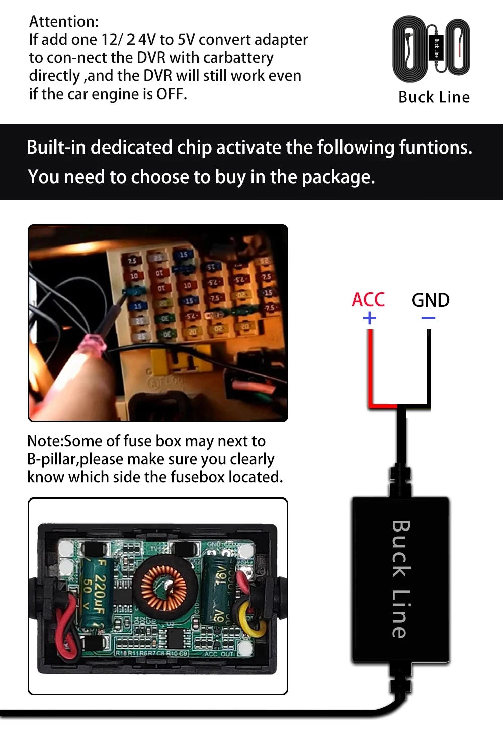 Si vous avez besoin de la fonction de surveillance du stationnement 24 heures sur 24, vous pouvez commander les accessoires Buck Line correspondants pour remplacer le chargeur de voiture.Grâce à la ligne Buck, l'alimentation du DVR peut être obtenue directement à partir de la batterie de la voiture ou de l'ACC de la voiture, de sorte que le DVR puisse maintenir un travail d'enregistrement normal même lorsque la voiture est éteinte.(Étant donné que différents modèles de voitures ont des interfaces de batterie ou des interfaces ACC différentes, il n'est pas recommandé de l'installer vous-même.Il est recommandé de trouver un professionnel pour installer la ligne Buck.)