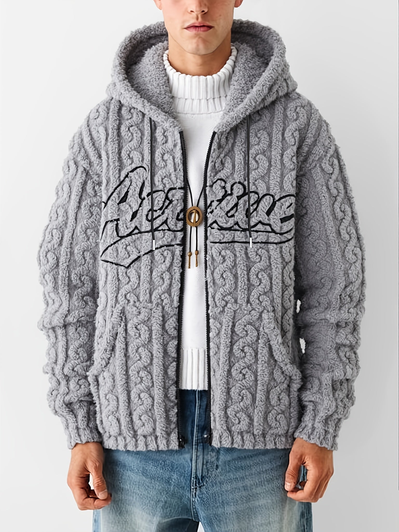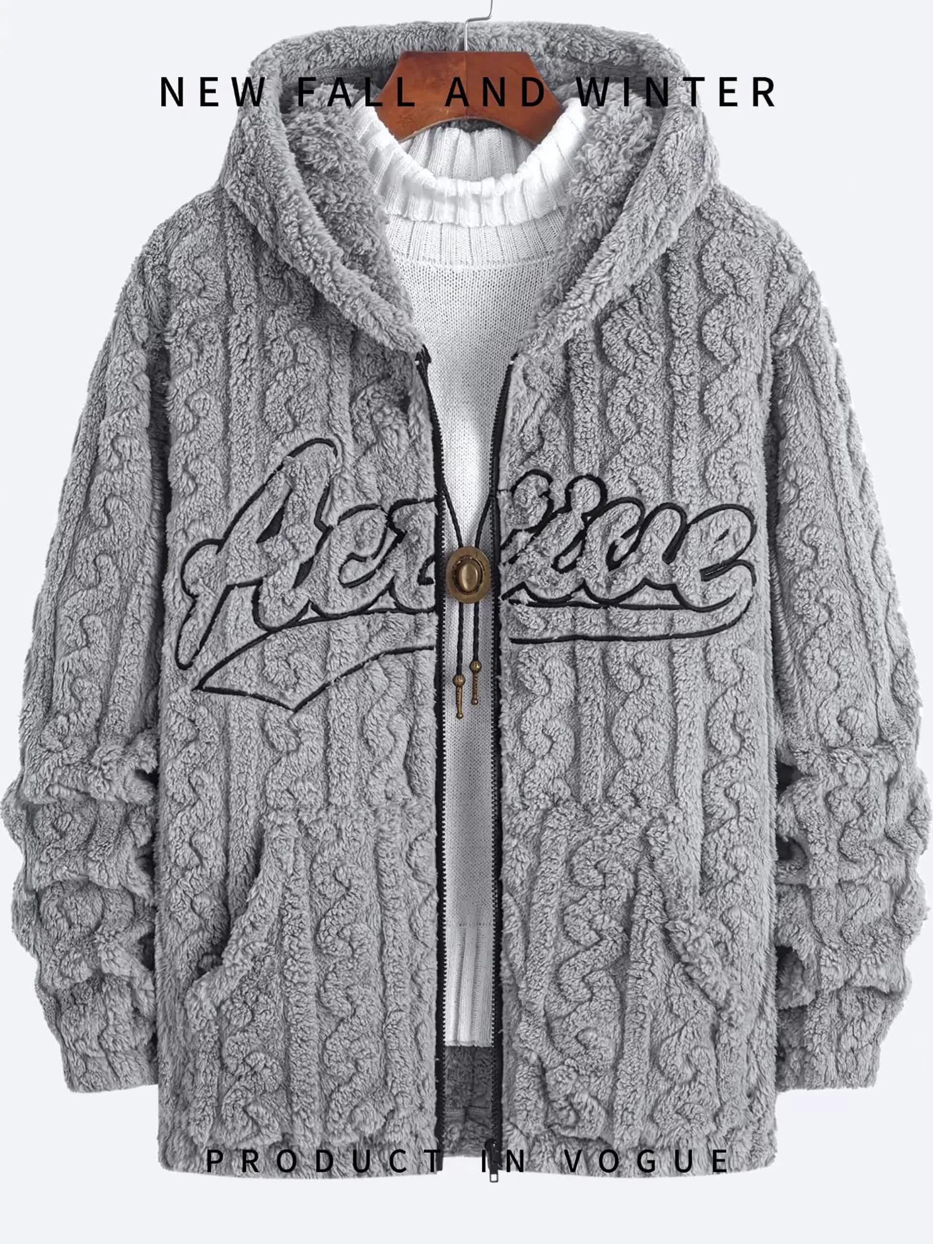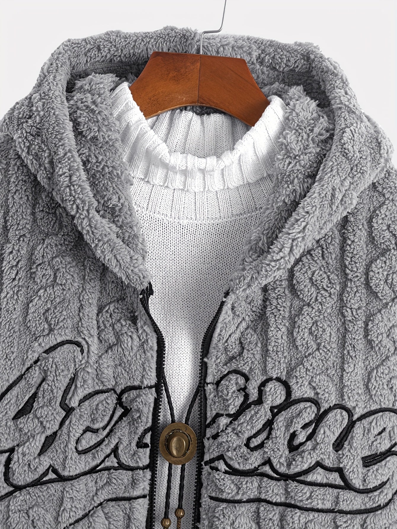 1pc Men'S Fleece Hooded Zip-Up Jacket with Embroidered Lettering - Cozy Double-Sided Plush, Long Sleeve, Regular Fit, Fall/Winter Casual Outerwear, Casual Winter Wear | Embroidered Lettering Jacket | Plush Fleece Jacket, Thic