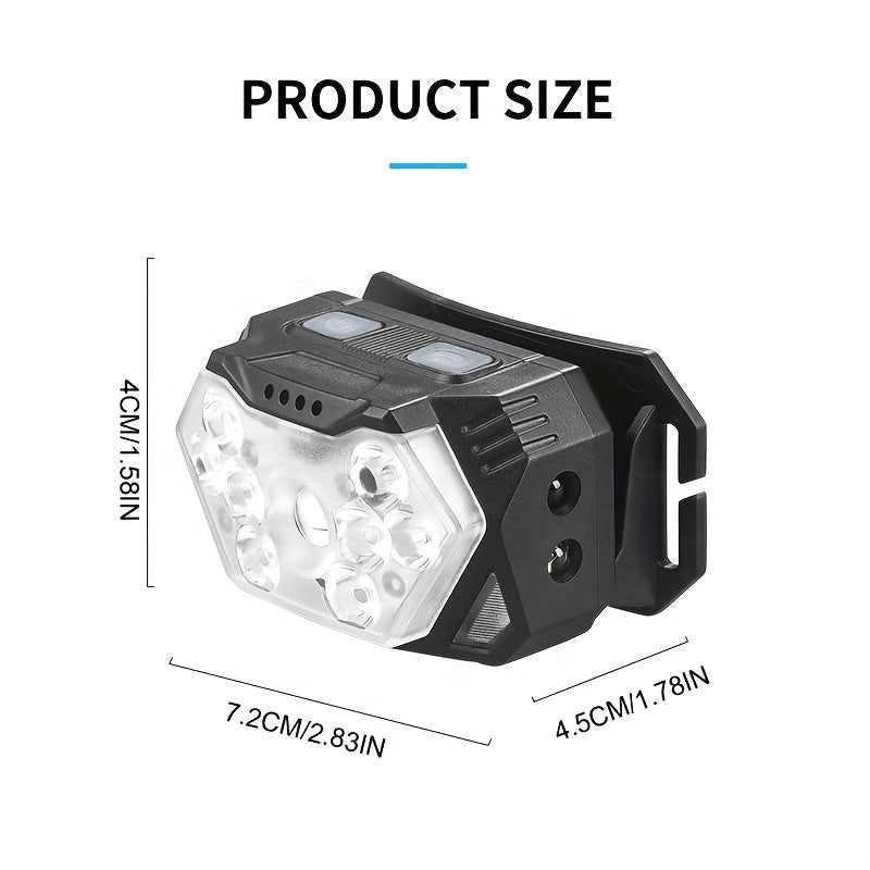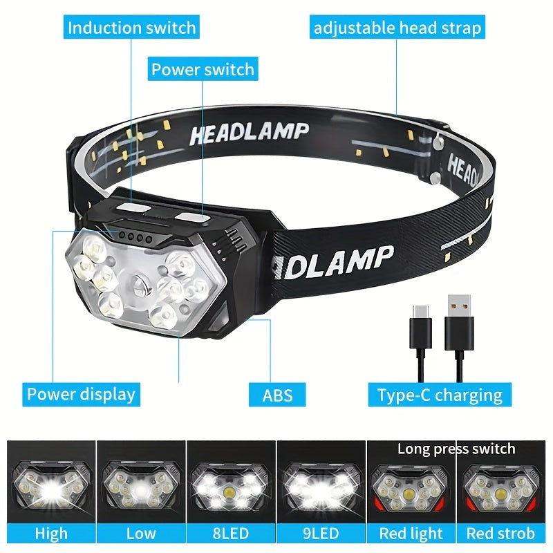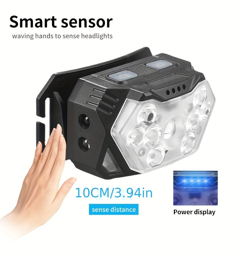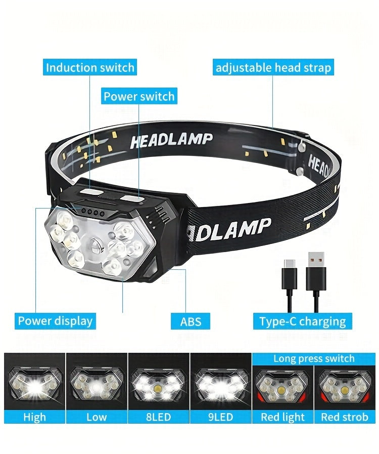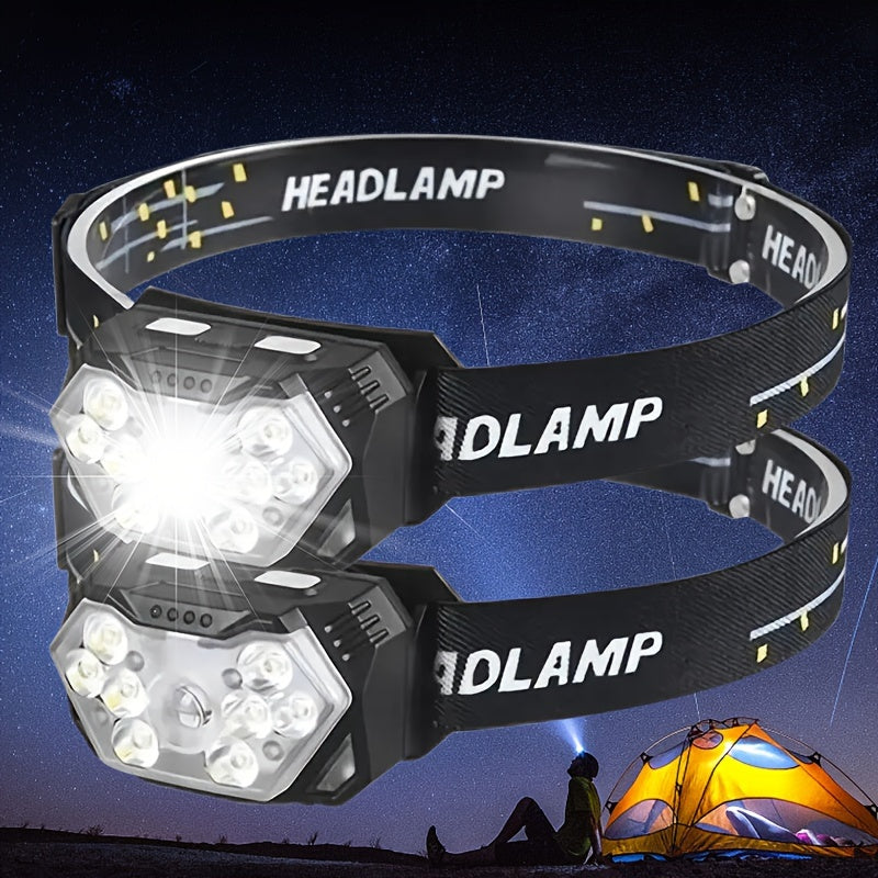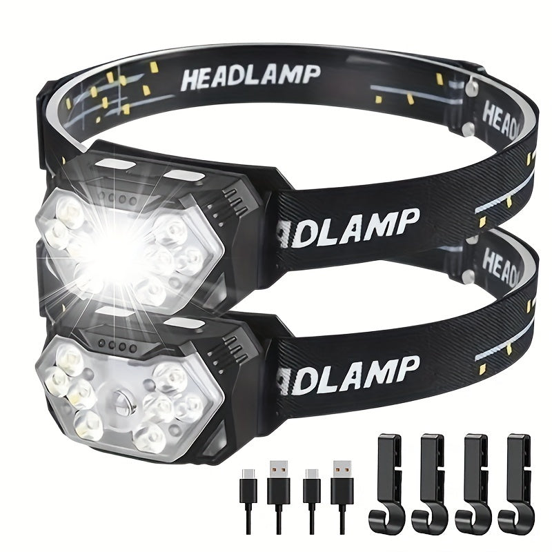 2pcs Super Bright 11000LUMEN Rechargeable Headlamp, Motion Sensor with 6 Lighting Modes for Outdoor Fishing & Camping, 9LED, White Red Light Flashlights