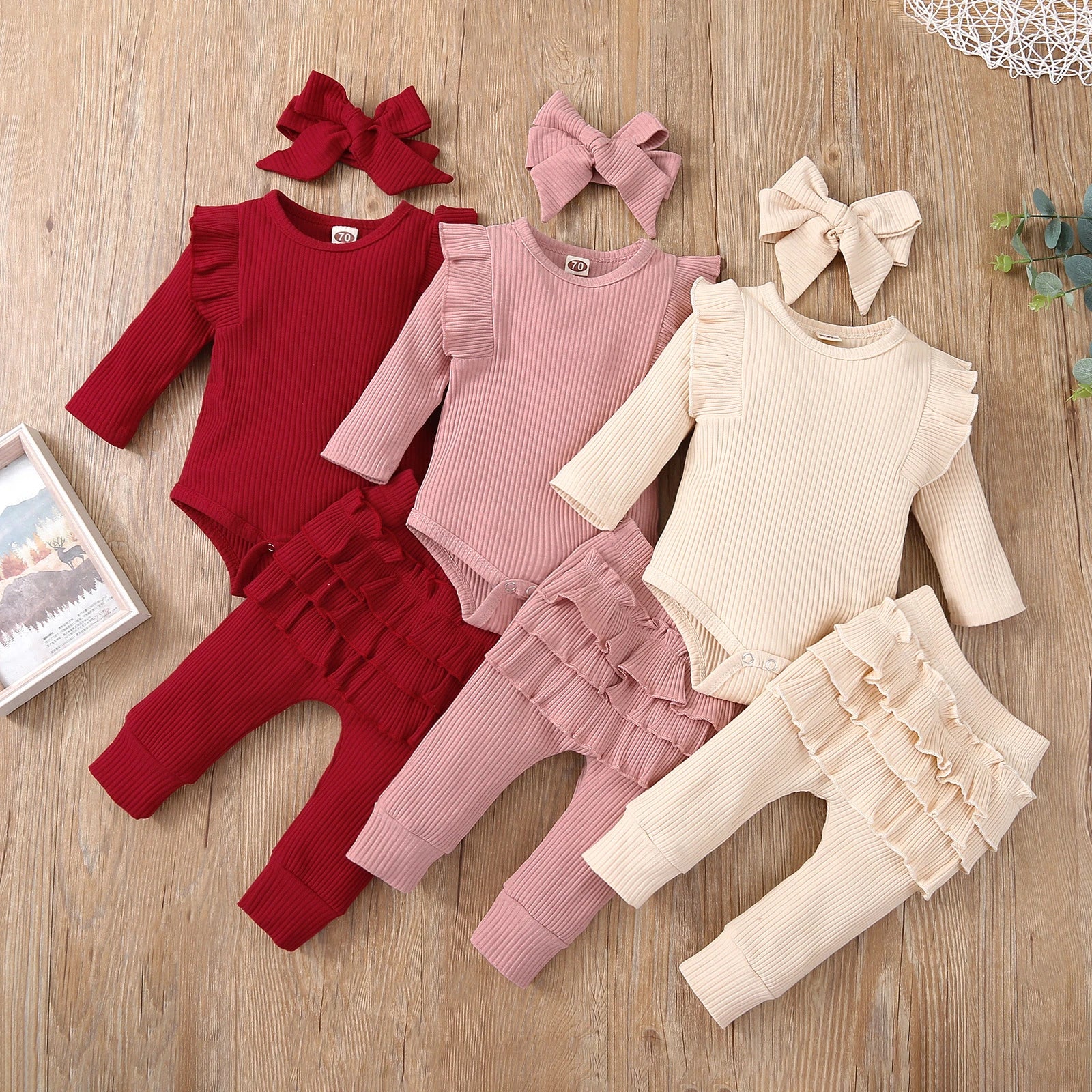 3 pièces bébé fille tenue ensemble nouveau-né enfant en bas âge enfants ensemble de vêtements bébé filles dentelle volants coton body + pantalon + bandeau vêtements