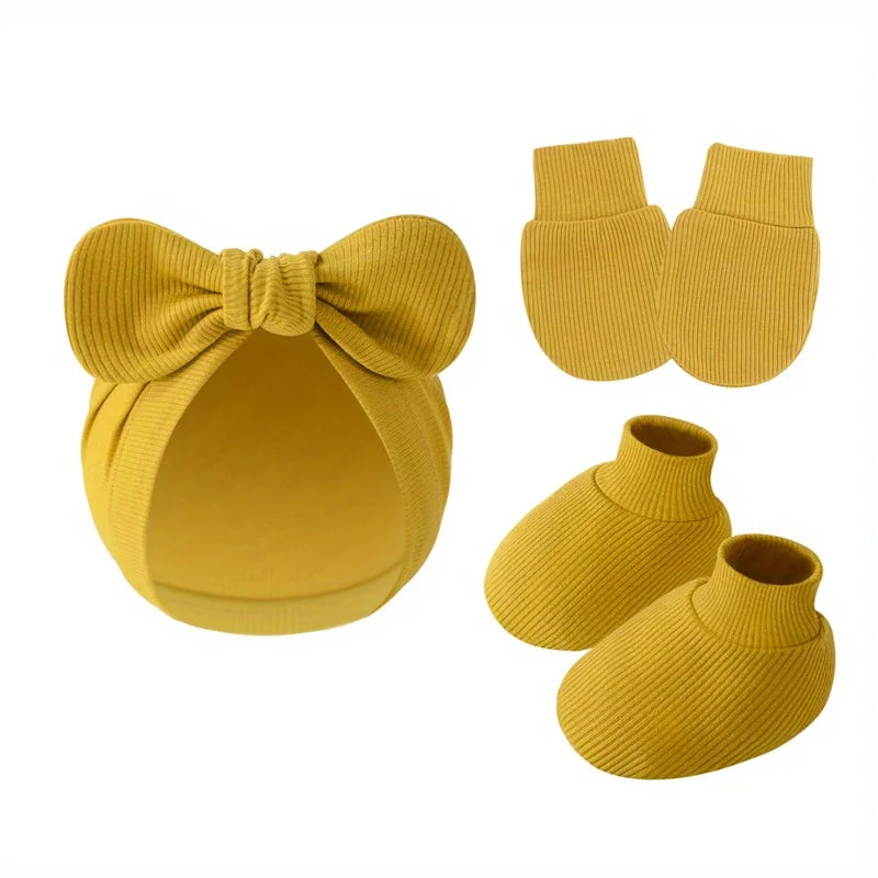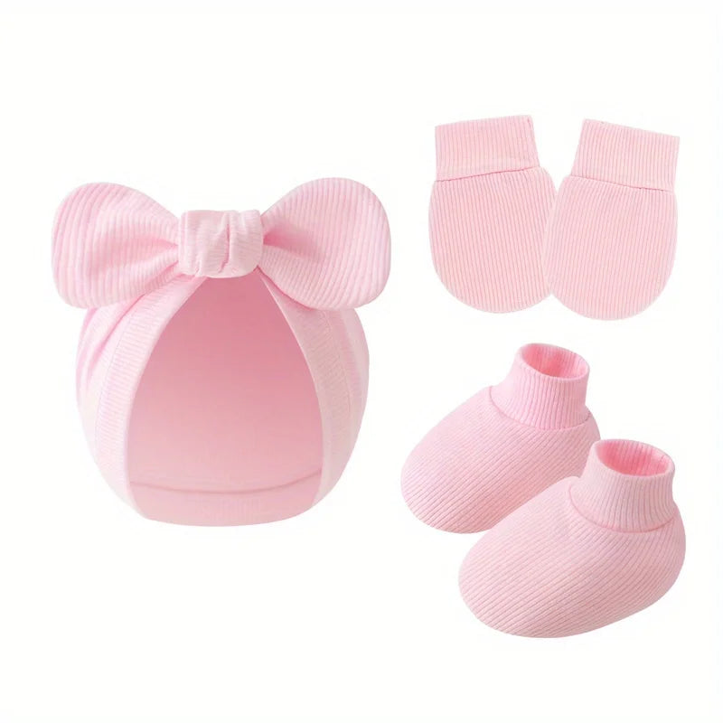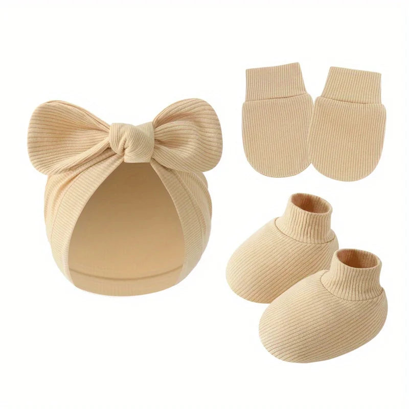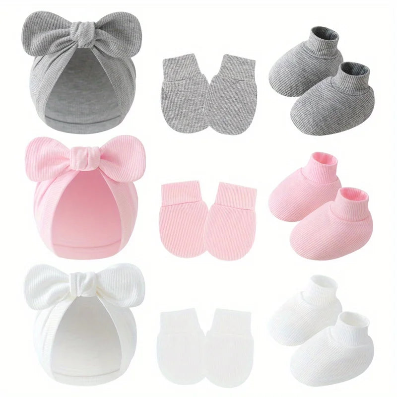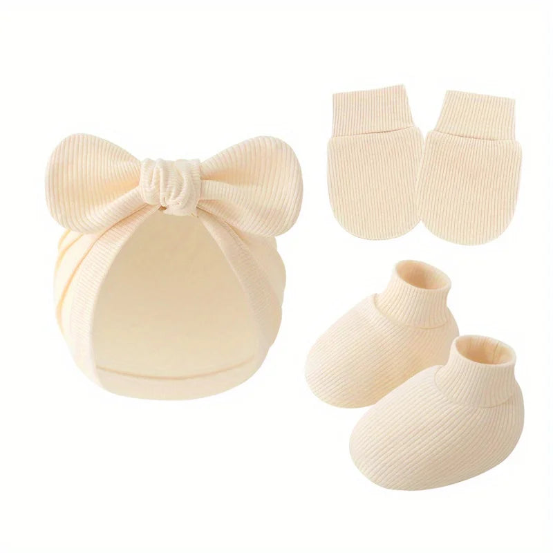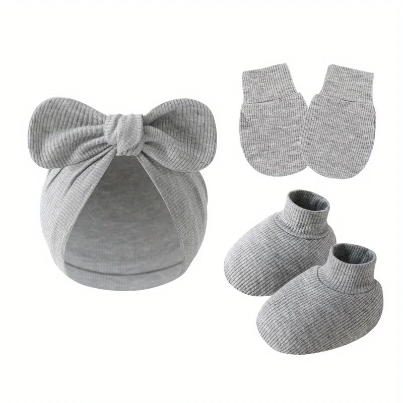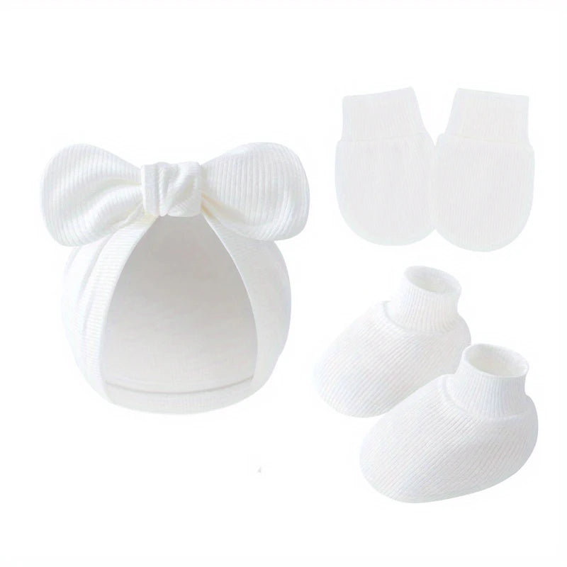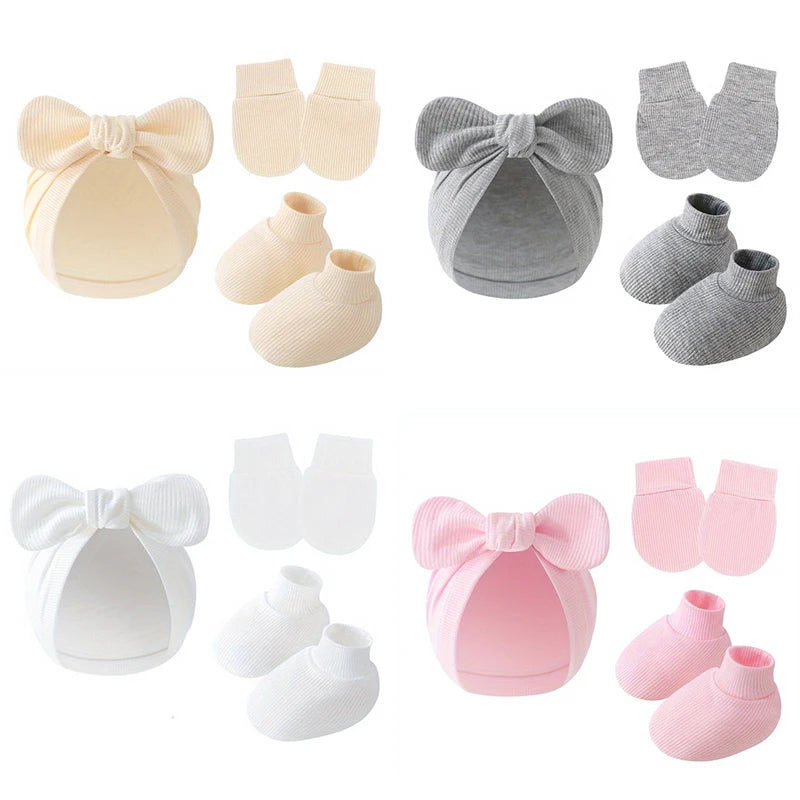 3 pièces/ensemble bébé nœud chapeau gants chaussettes coton nouveau-né Bonnet couleur unie Bonnet pour filles garçons infantile douche cadeaux 0-6M