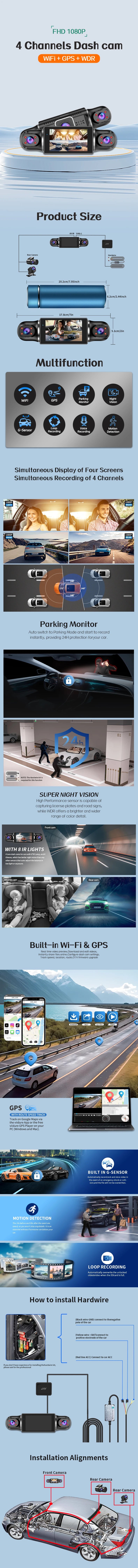Caméra de tableau de bord DVR pour voiture, 64 go, 360 degrés, WiFi, GPS, moniteur de stationnement 24h, 4 objectifs * HD 1080P, enregistreur vidéo, contrôle par application, outil filaire