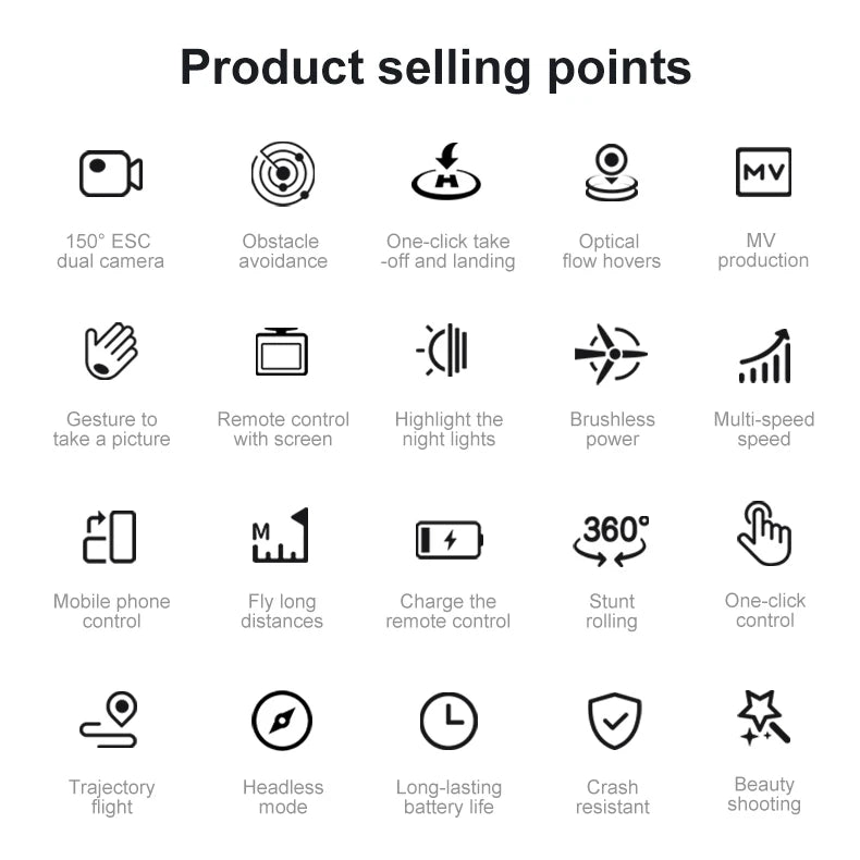 Fonction : haut/bas/avant/arrière, virage à gauche/droite, vol latéral, lumière LED, 360°° Roll de cascade, mode sans tête, retour automatique en un clic, mode de maintien de la hauteur, WiFi FPV, double objectif commutable, prend en charge la prise de vue horizontale/verticale/pronée, objectif réglable manuellement 150°.