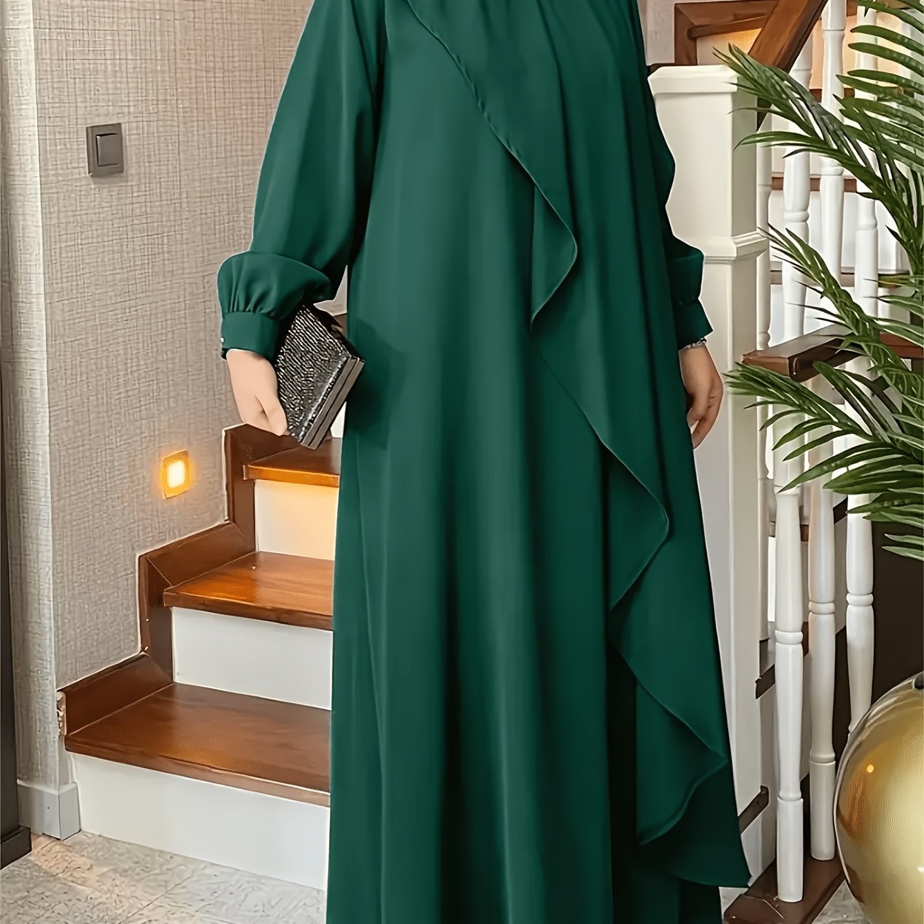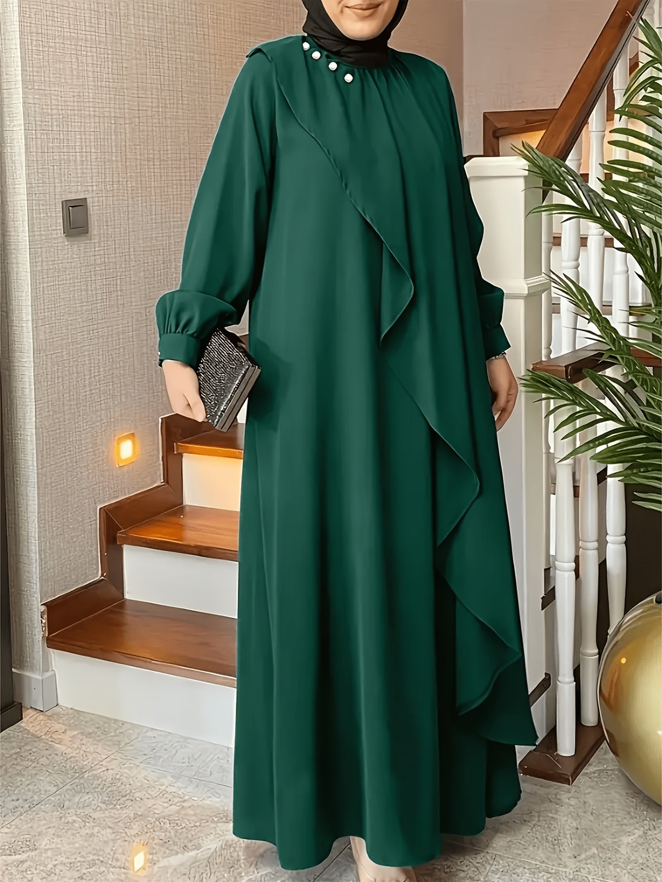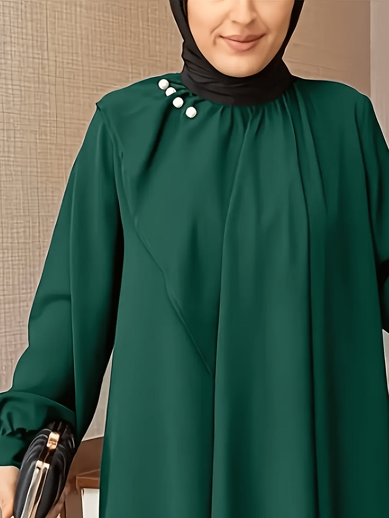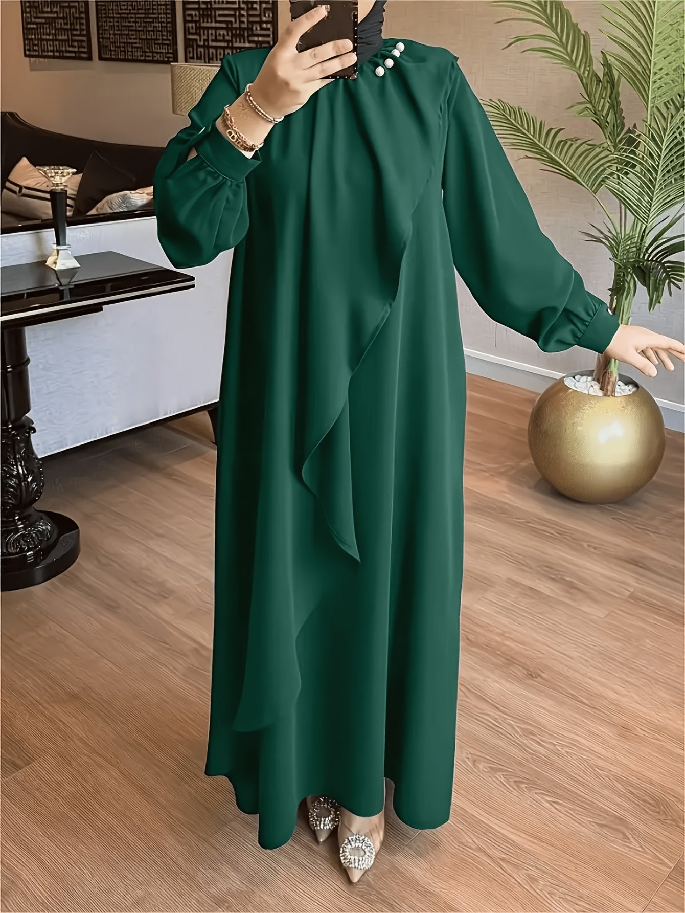 Elegant Green Long Skirt Dress for Women - Loose Fit, Round Neck, Lantern Sleeves, Embellished with Pearls, Perfect for Casual or Formal Occasions, Casual Elegant Wear | Embellished Dress | Flowing Skirt