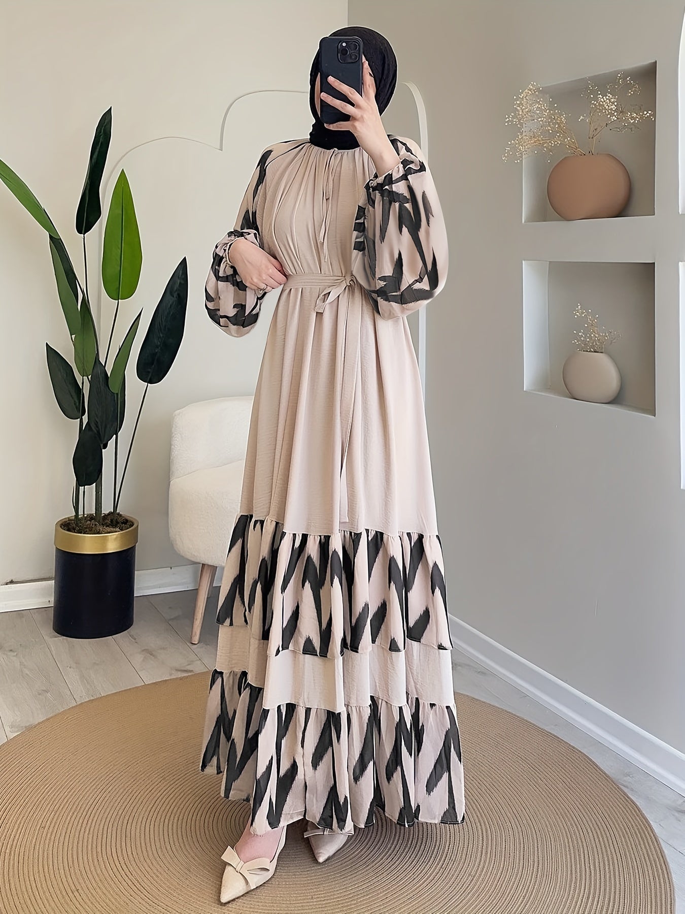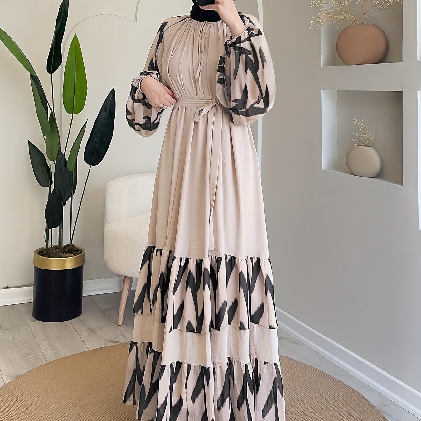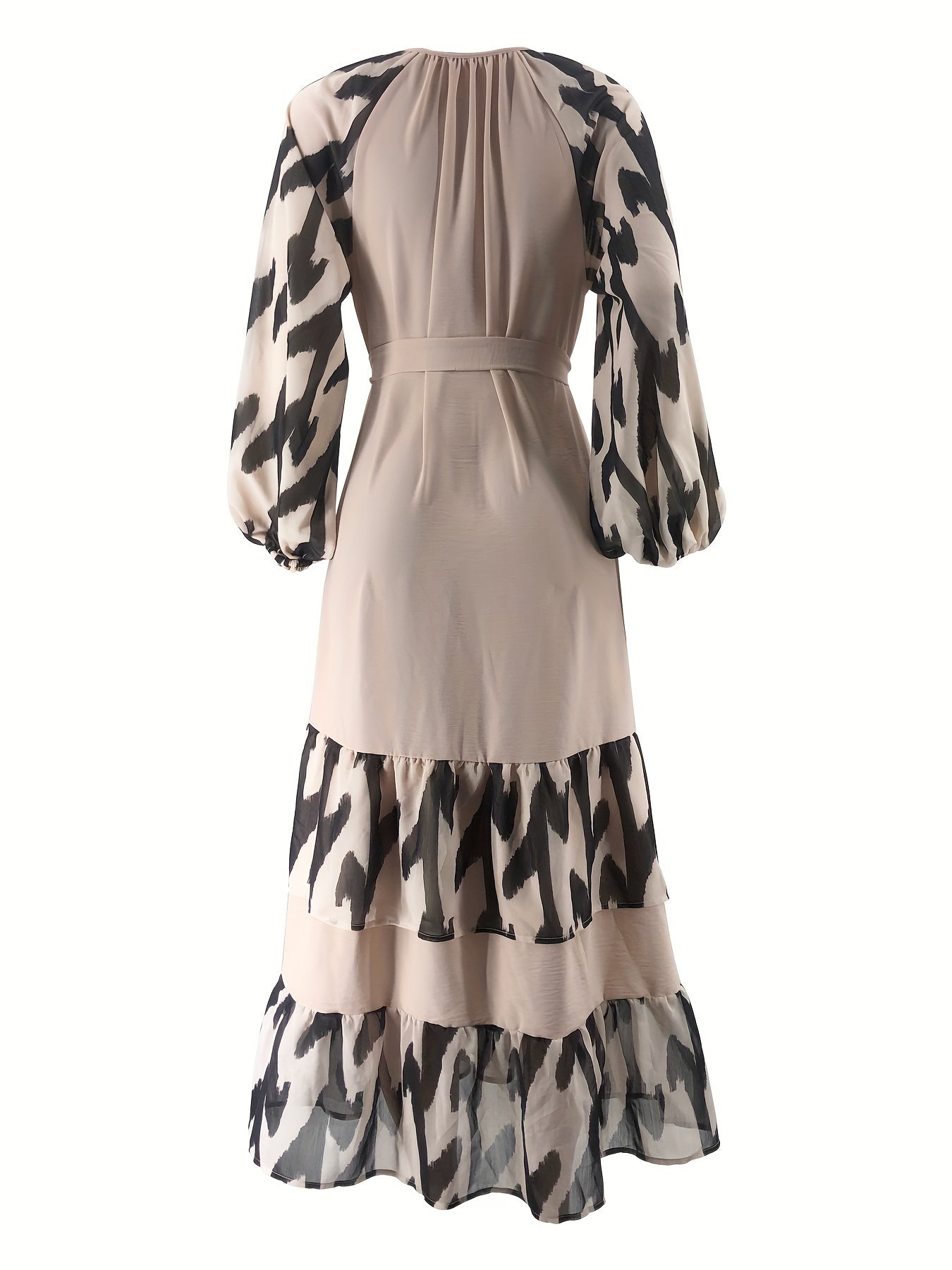 Elegant Women's Long Dress with Belt - Color Block, Lantern Sleeves, Ruffle Hem, Machine Washable - Perfect for Ramadan & Casual Attire
