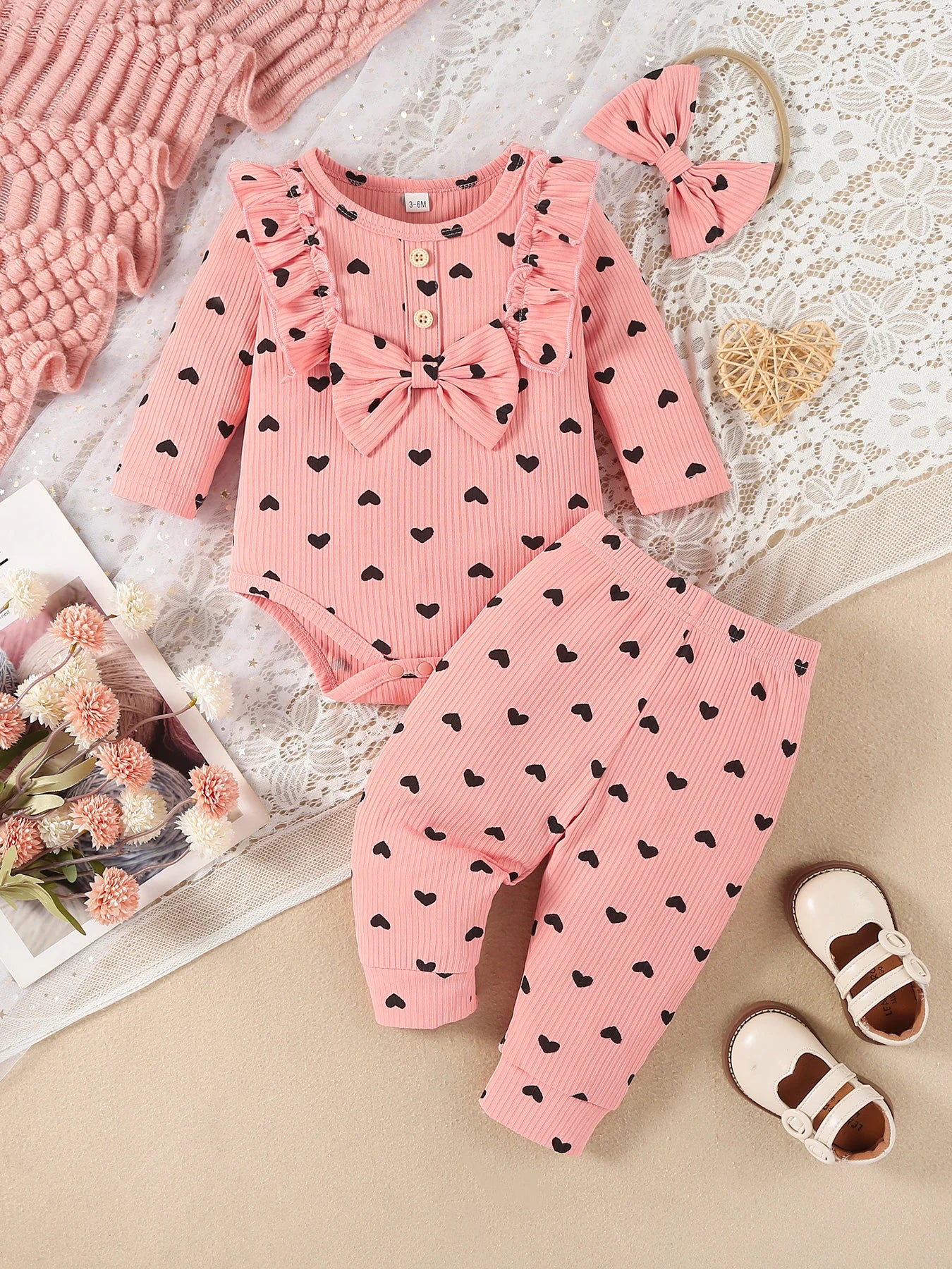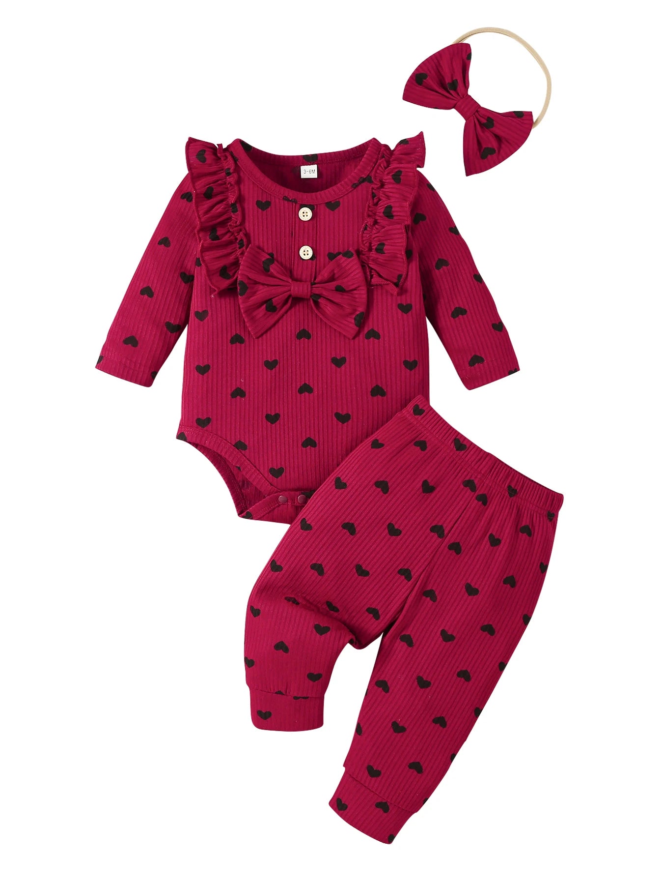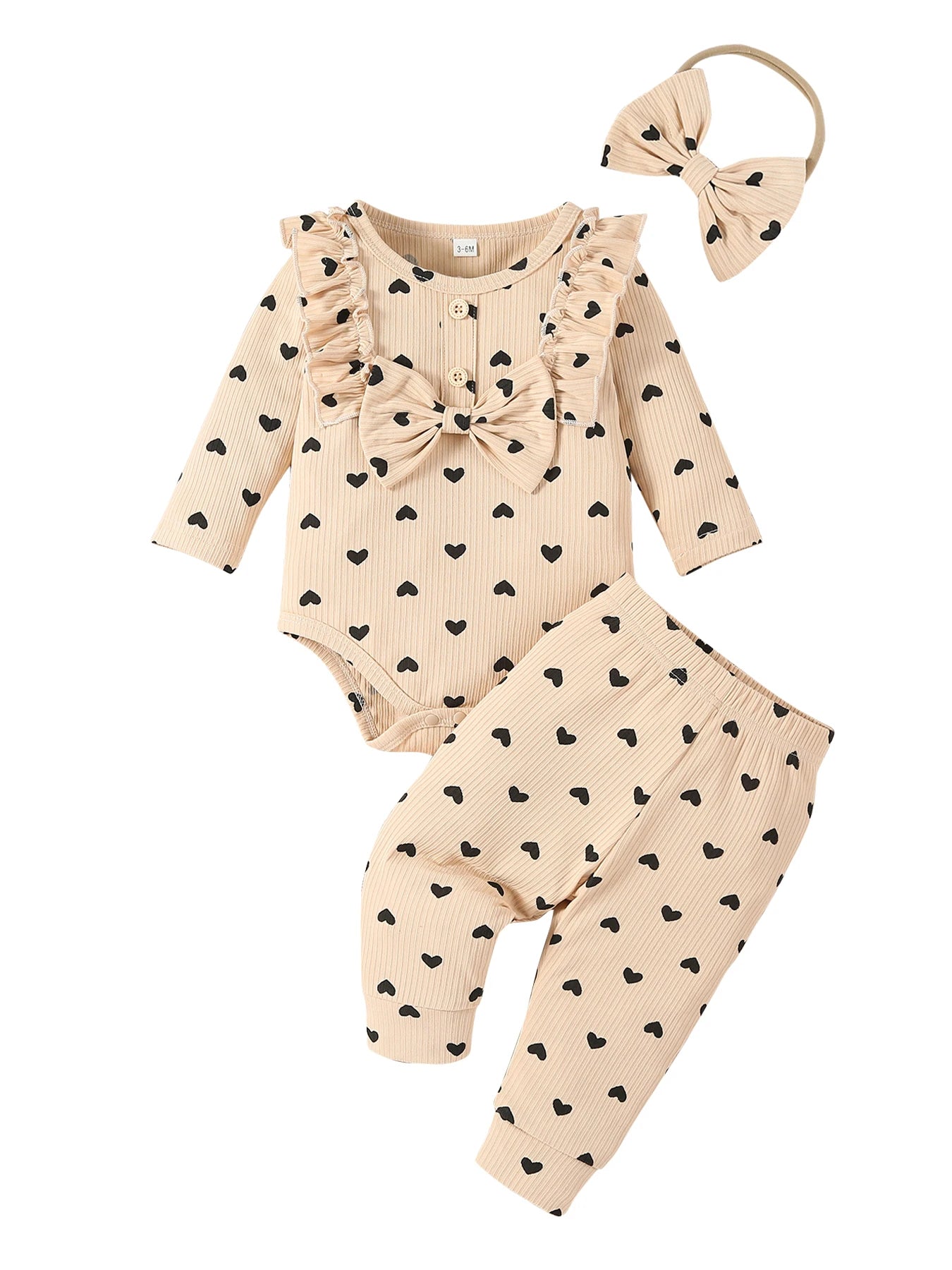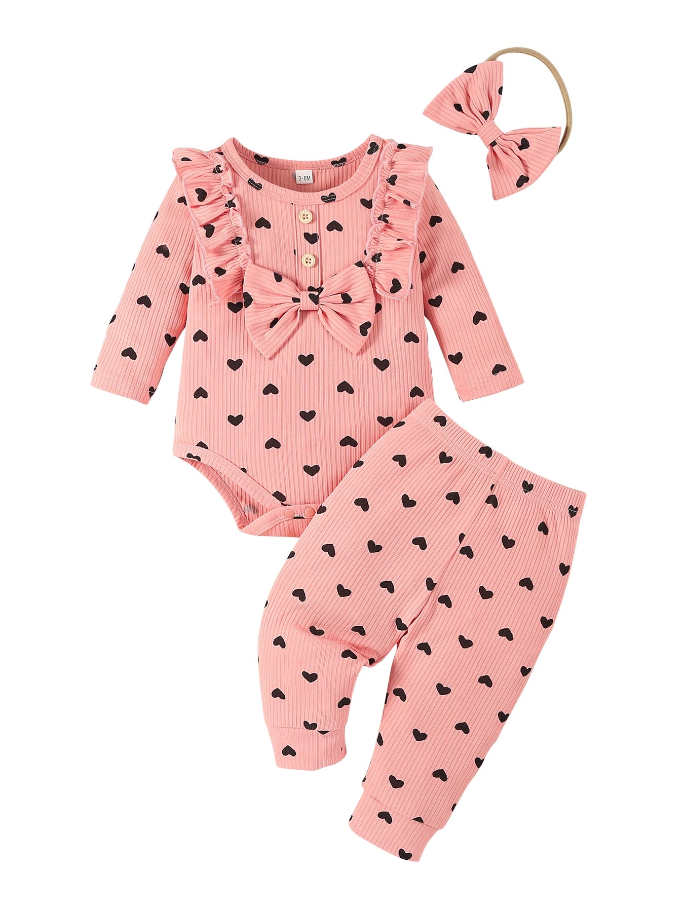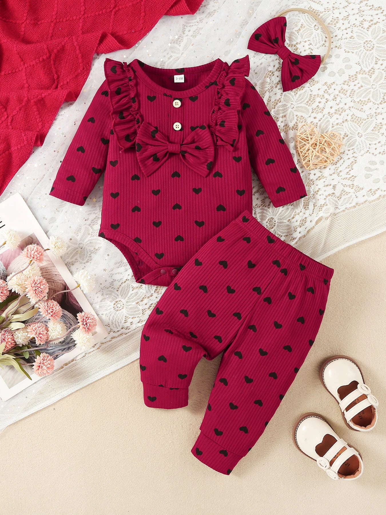 Kukitty – ensemble de vêtements 3 pièces pour nouveau-né fille, barboteuse à manches longues, imprimé cœur, haut et pantalon, bandeau, tenues en tricot