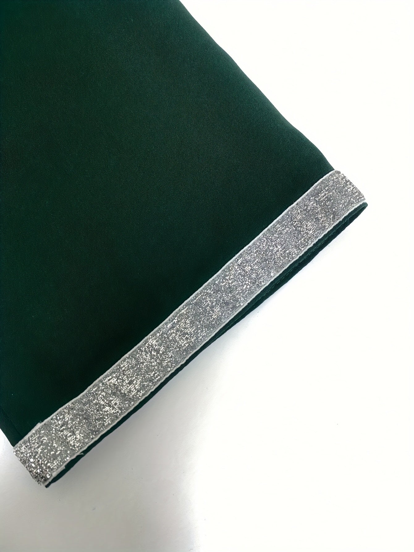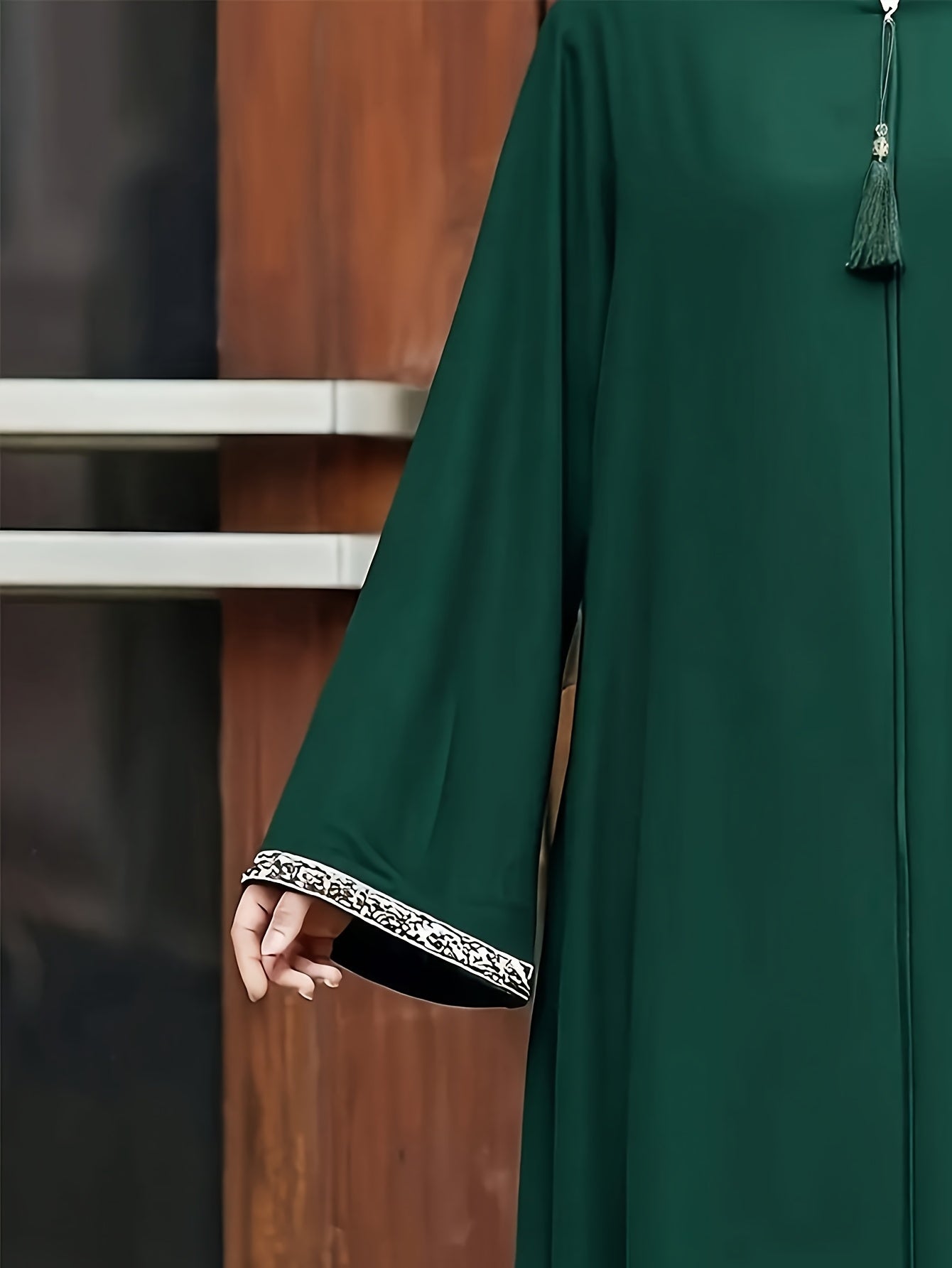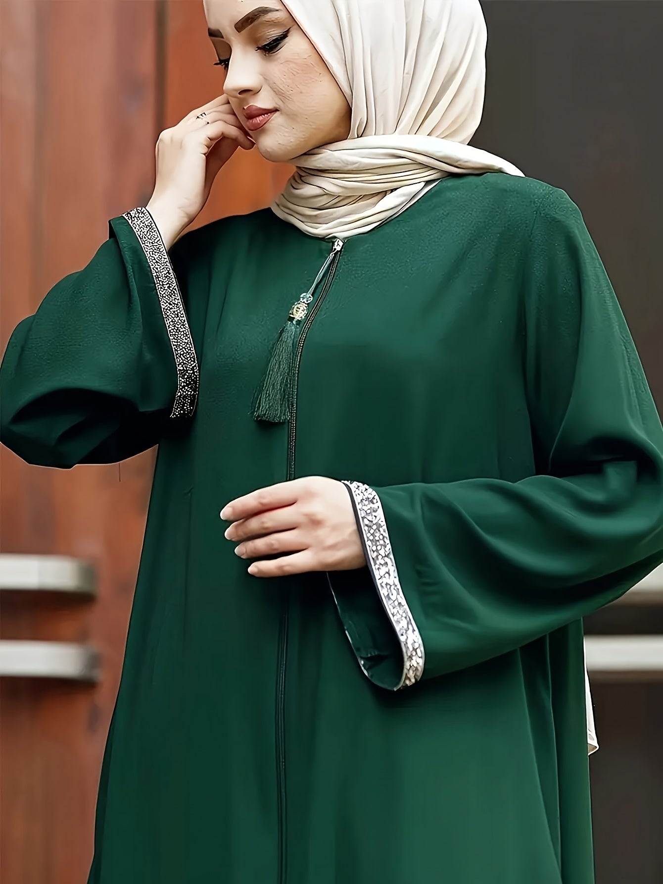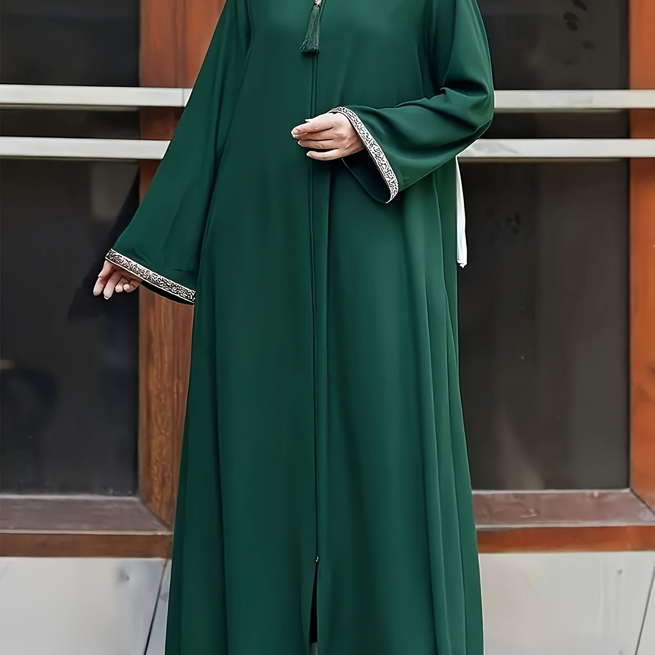 Long-sleeve zip-up kaftan dress, elegant maxi dress with contrast trim and fringe