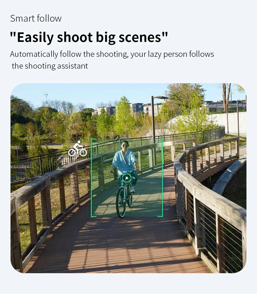 10.Mode Suivez-moi. Le drone vous suivra et vous capturera automatiquement partout où vous vous déplacez.Vous gardant dans le cadre à tout moment, plus facile pour obtenir des photos complexes, permet de voler et de selfie mains libres.