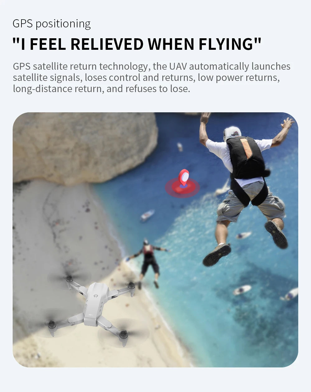 4.Vol assisté par GPS.Vous fournit des détails de positionnement précis.Le drone reviendra automatiquement à la maison lorsque sa batterie est faible ou que le signal est faible ou en volant hors de portée.Ne craignez plus de perdre le drone.