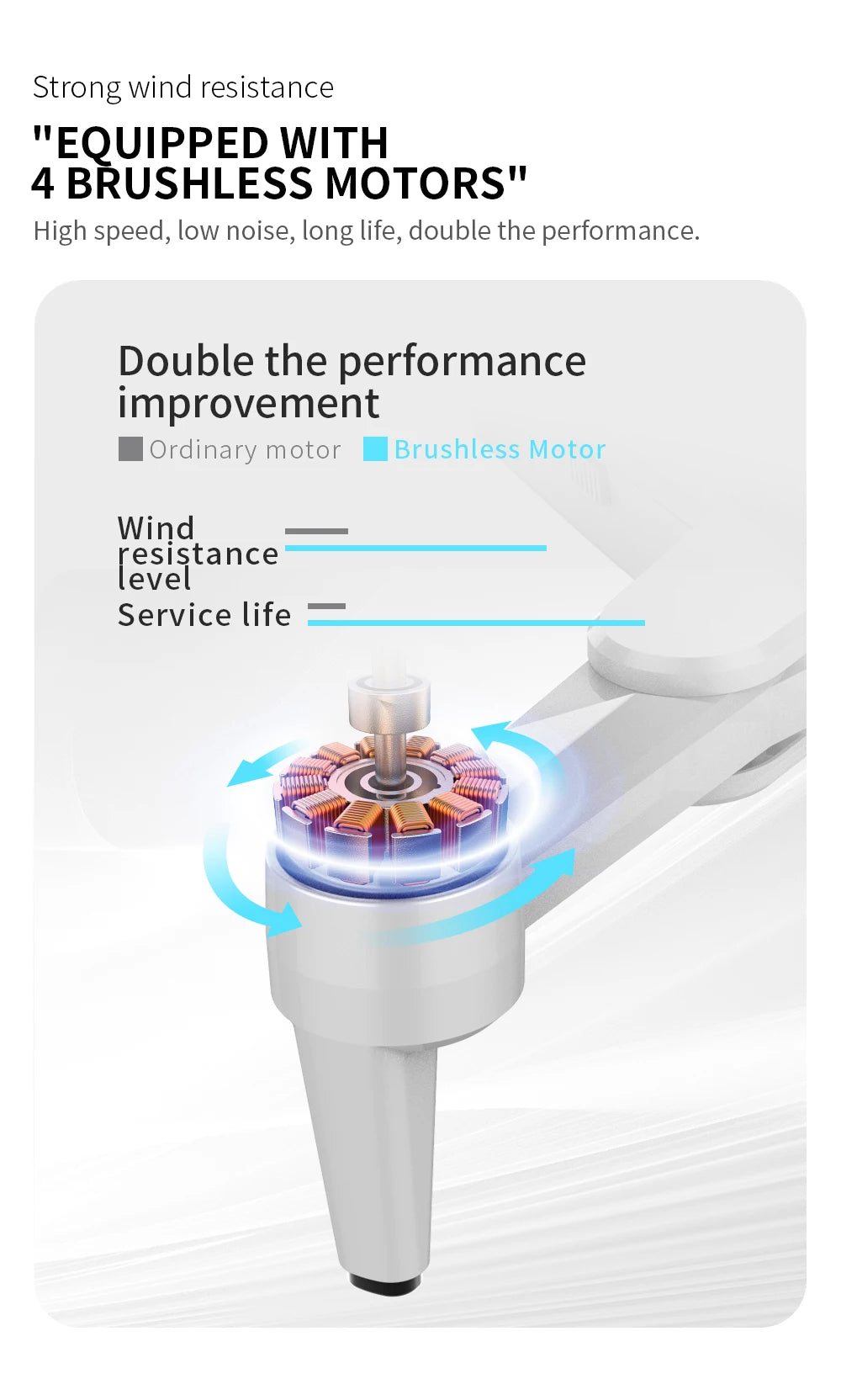 9.Moteur sans balais.Il est si silencieux mais très puissant en courant.Une panne se produit rarement et un remplacement du moteur est rarement nécessaire, ce qui rend votre vol plus agréable.