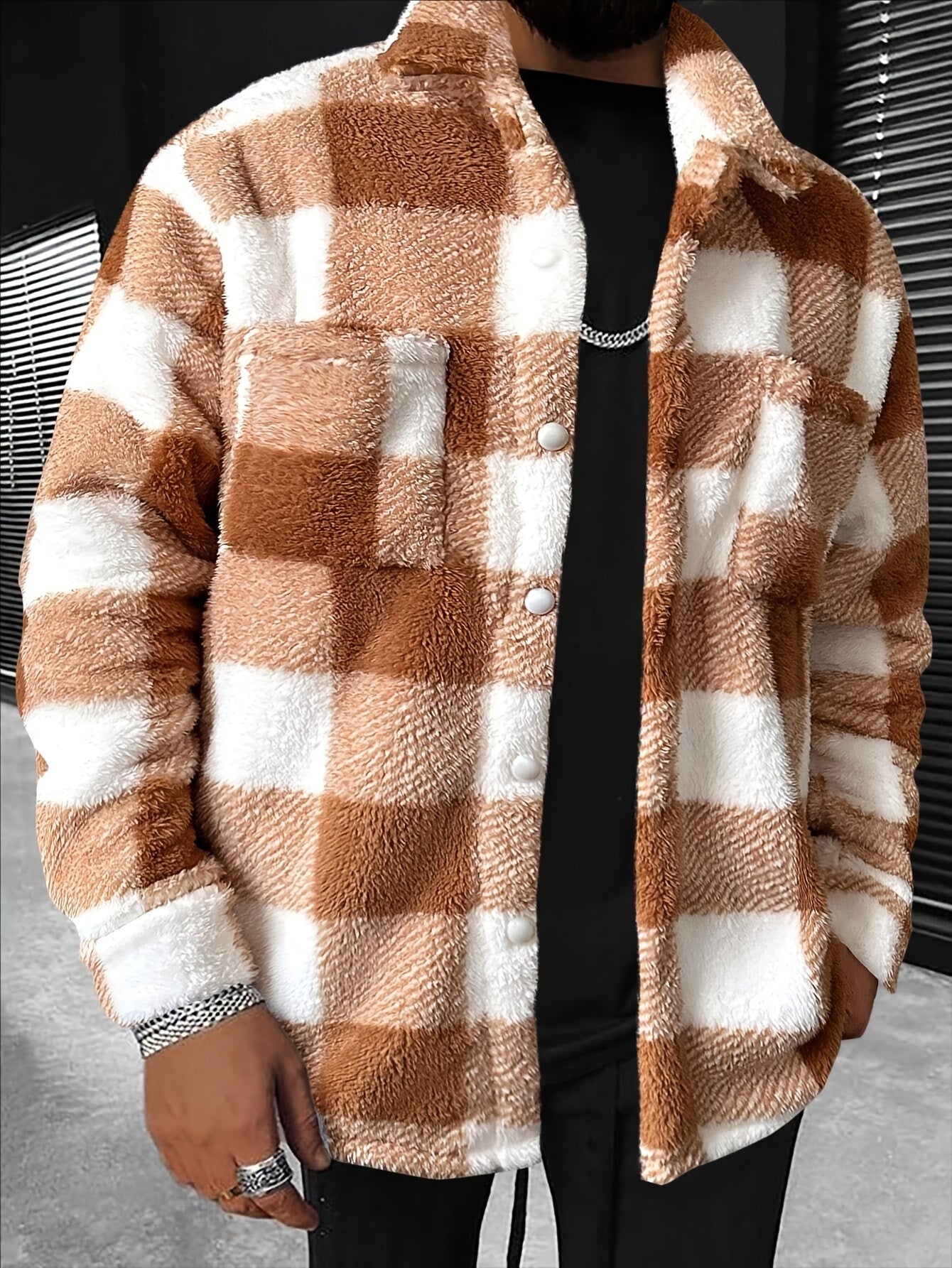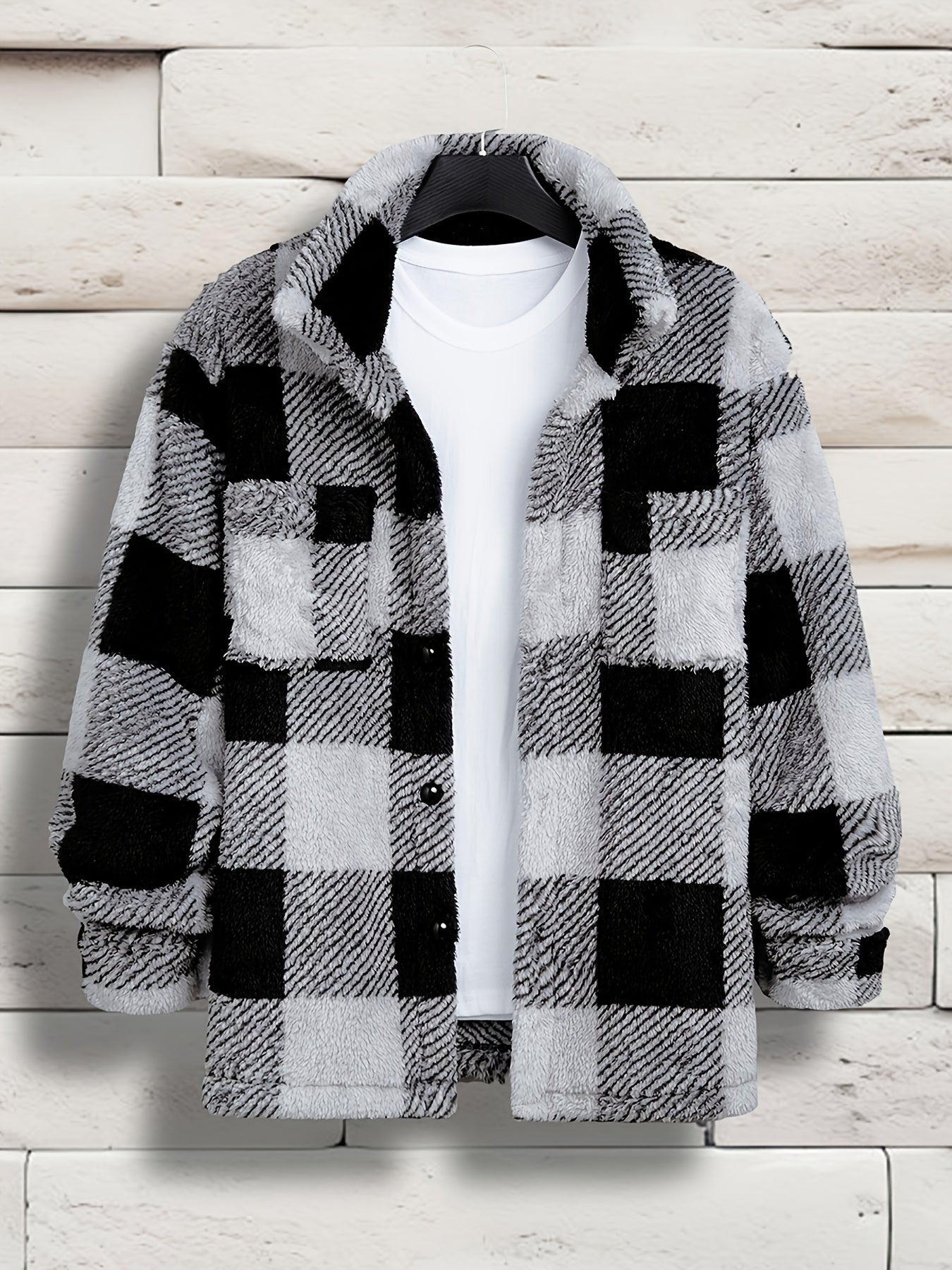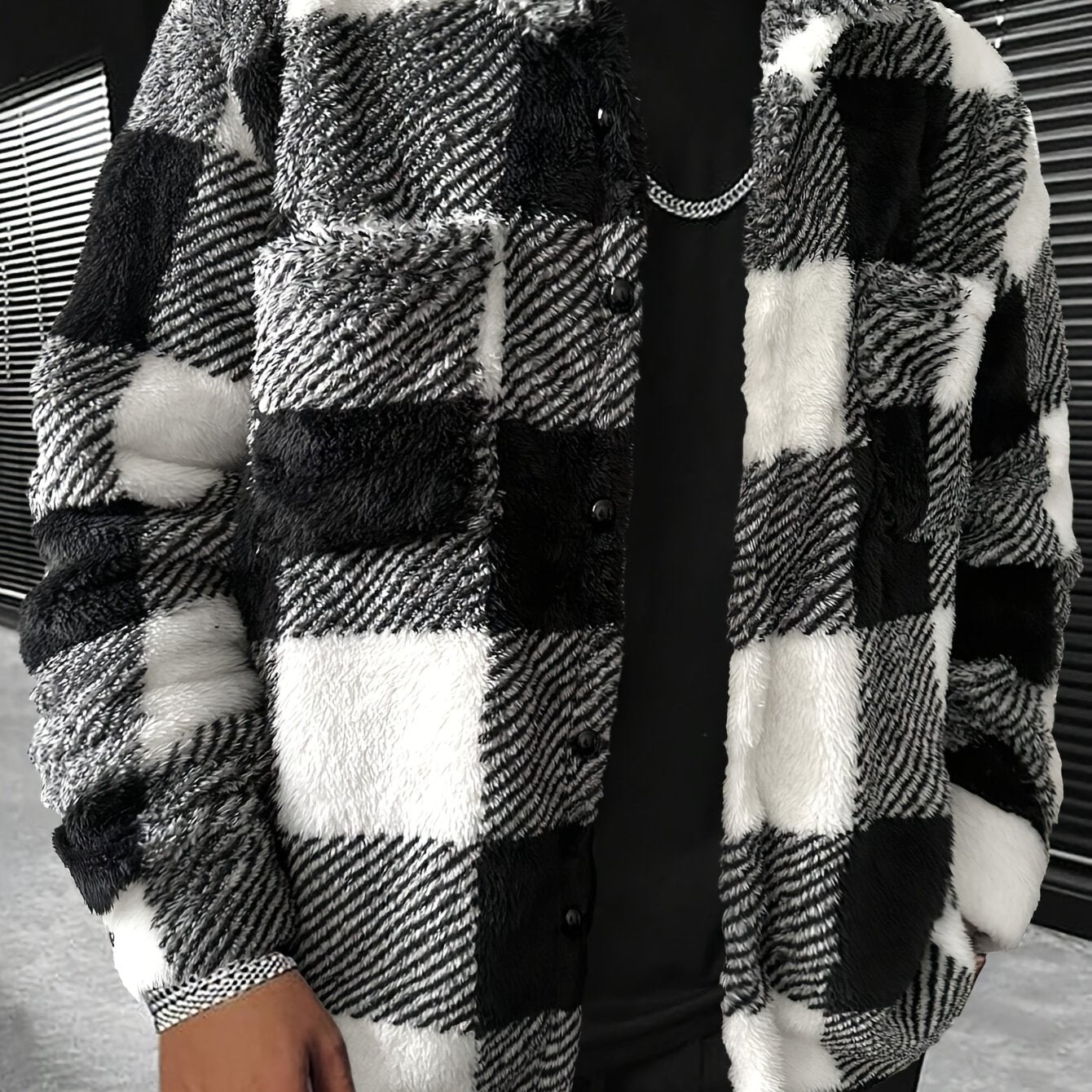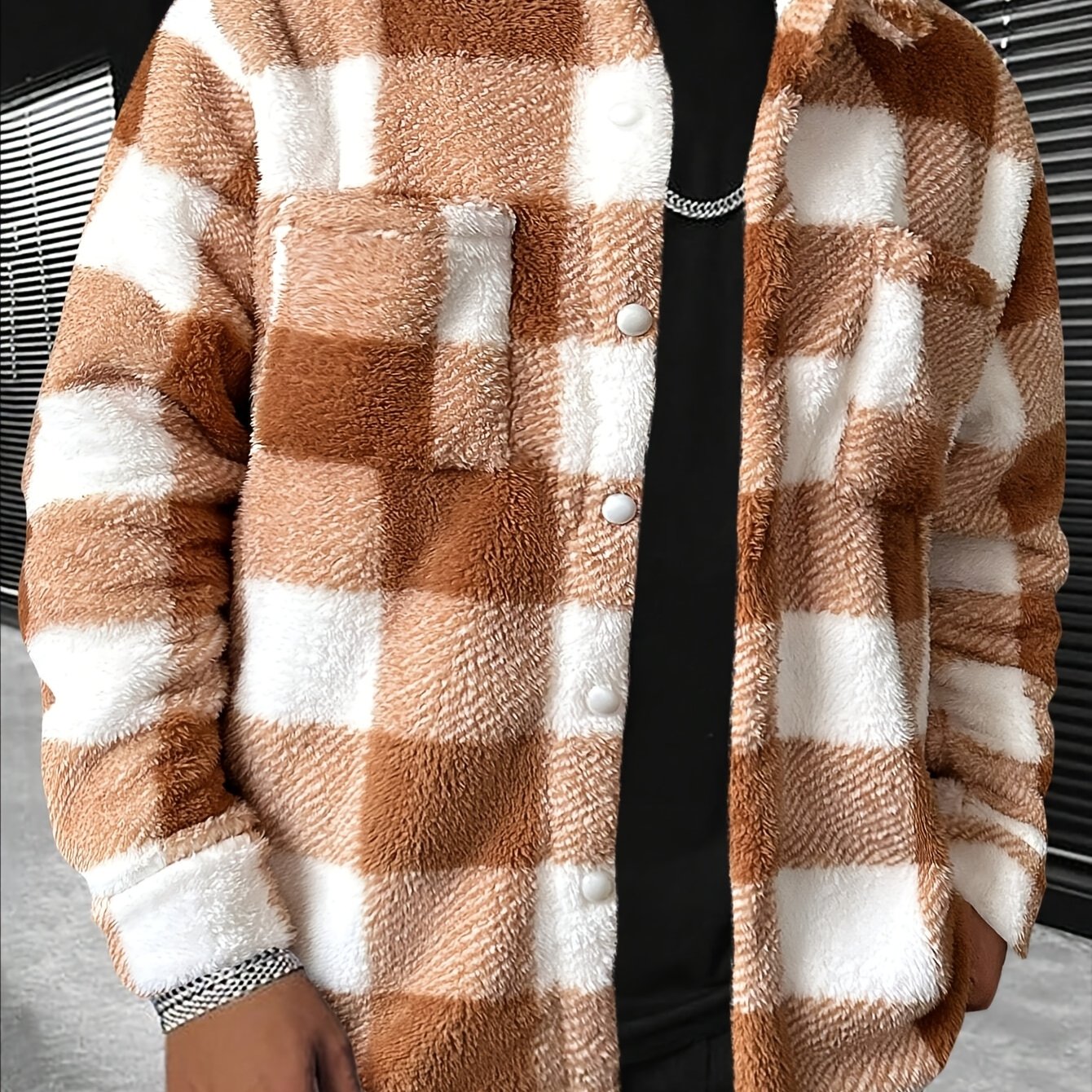 Men's Cozy Plaid Fleece Jacket - Casual Button-Up with Lapel Collar, Long Sleeves for Winter Warmth