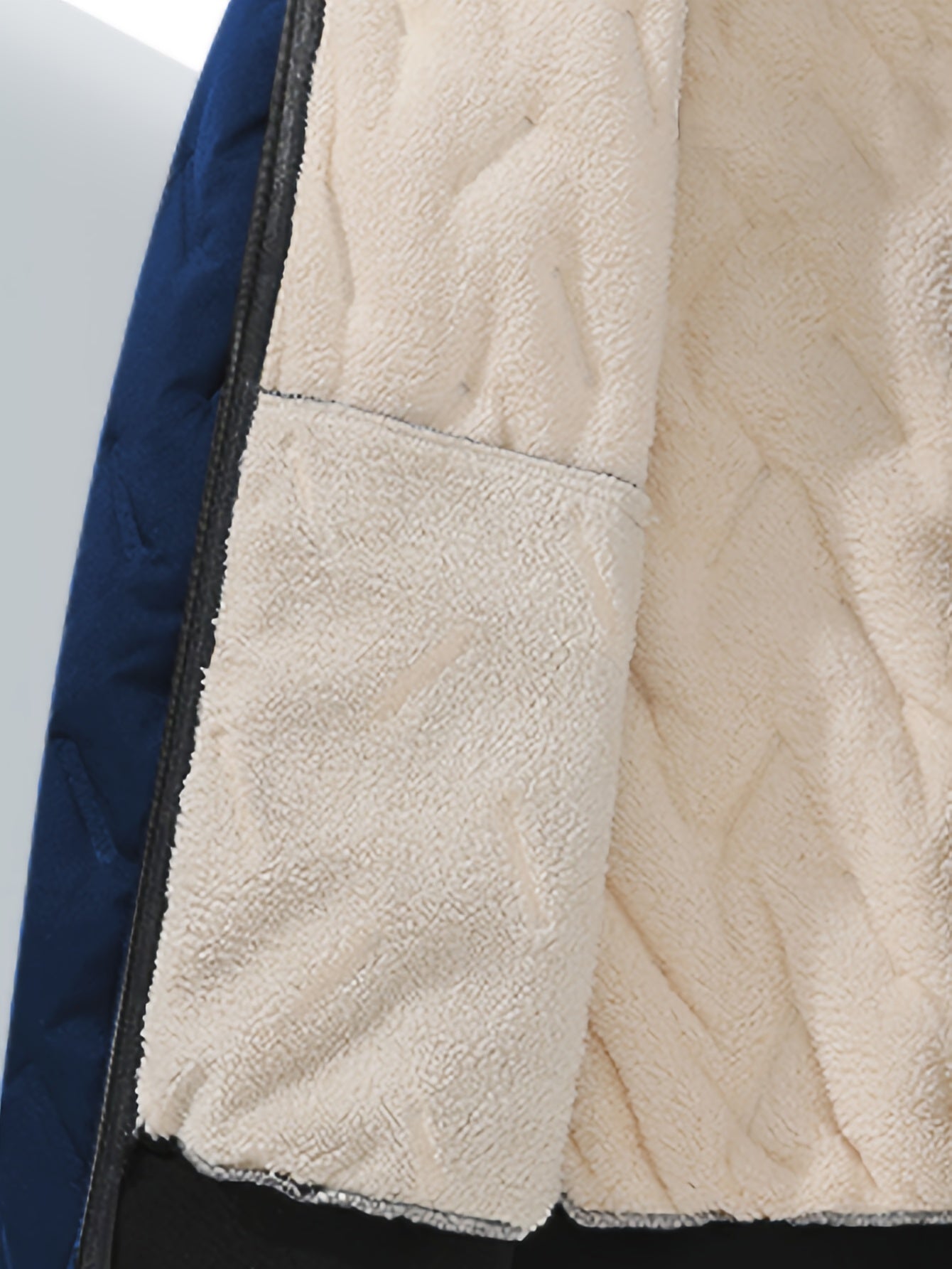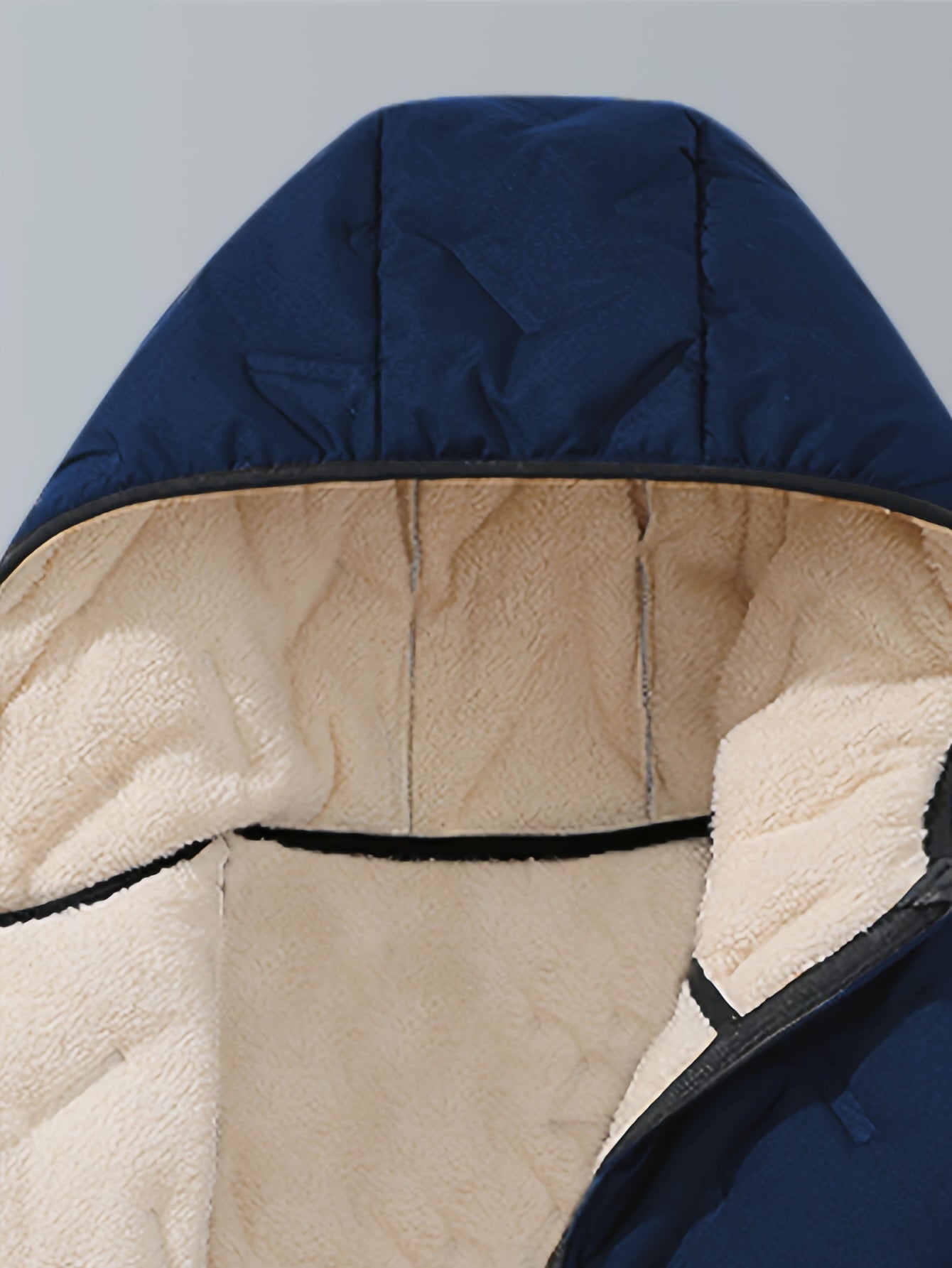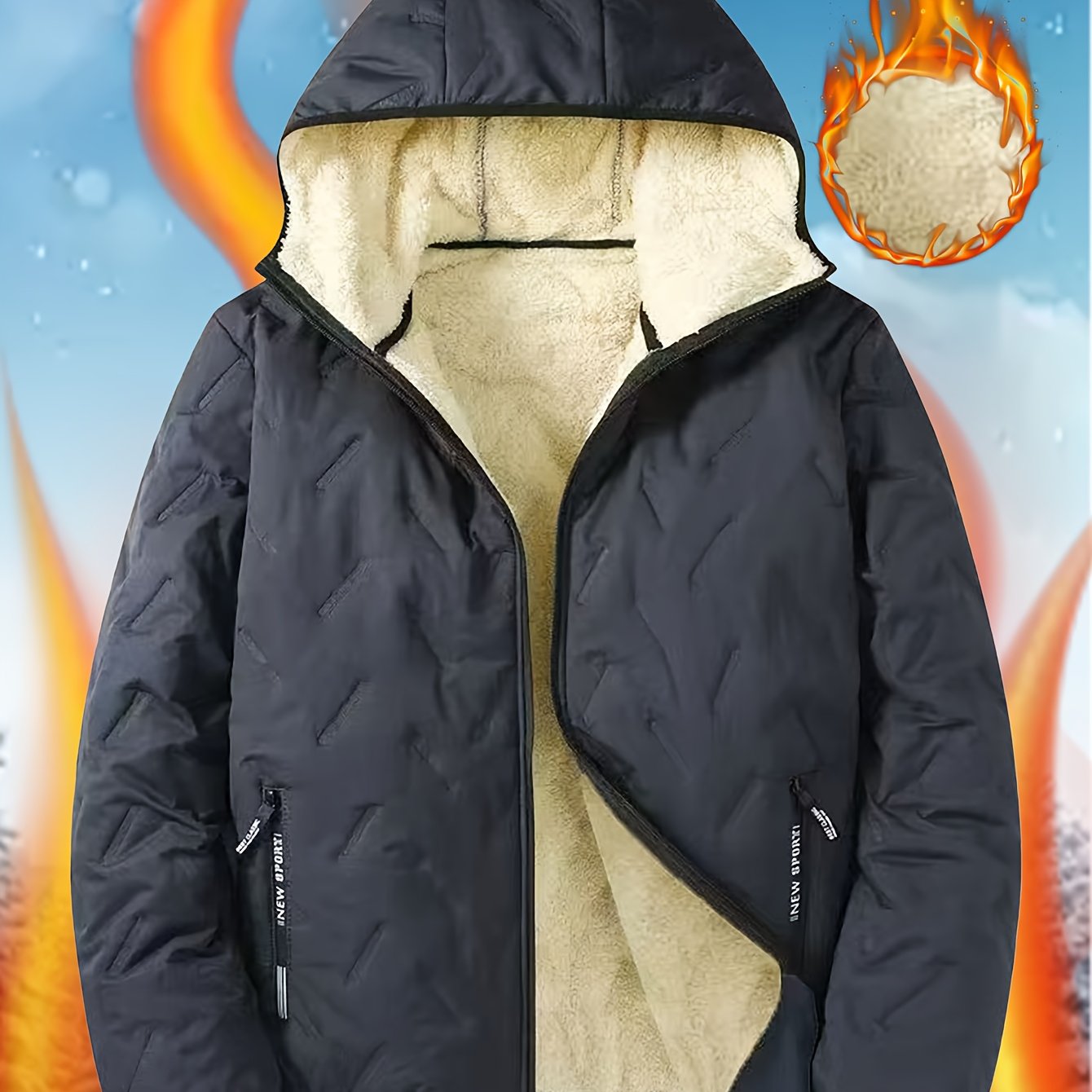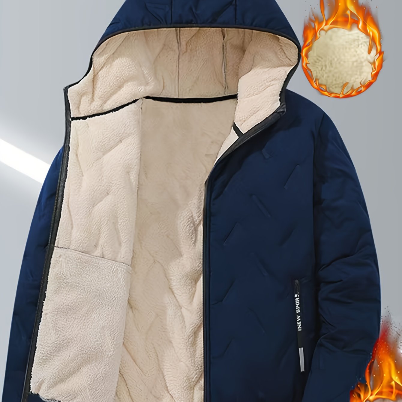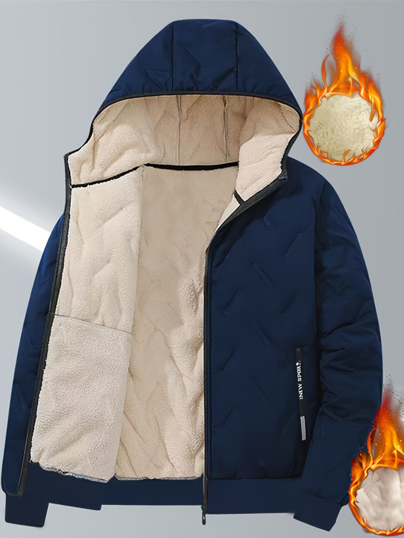 Men'S Winter Warm Fleece-Lined Zip-Up Hooded Jacket with Pockets - Navy Blue & Beige Color Block, Comfortable Polyester Fabric, Ideal for Outdoor Activities, Running, and Casual Wear, Winter Jacket