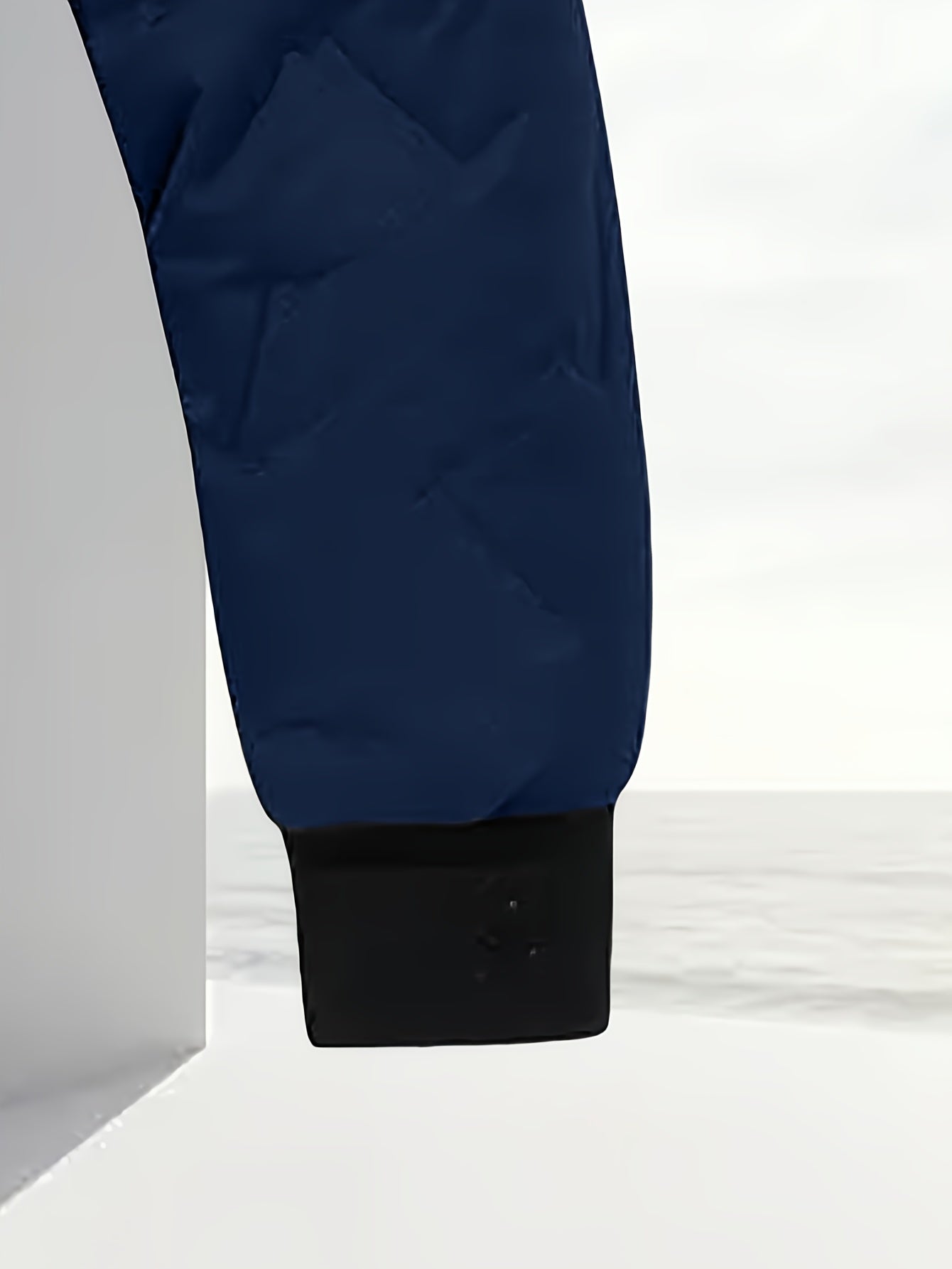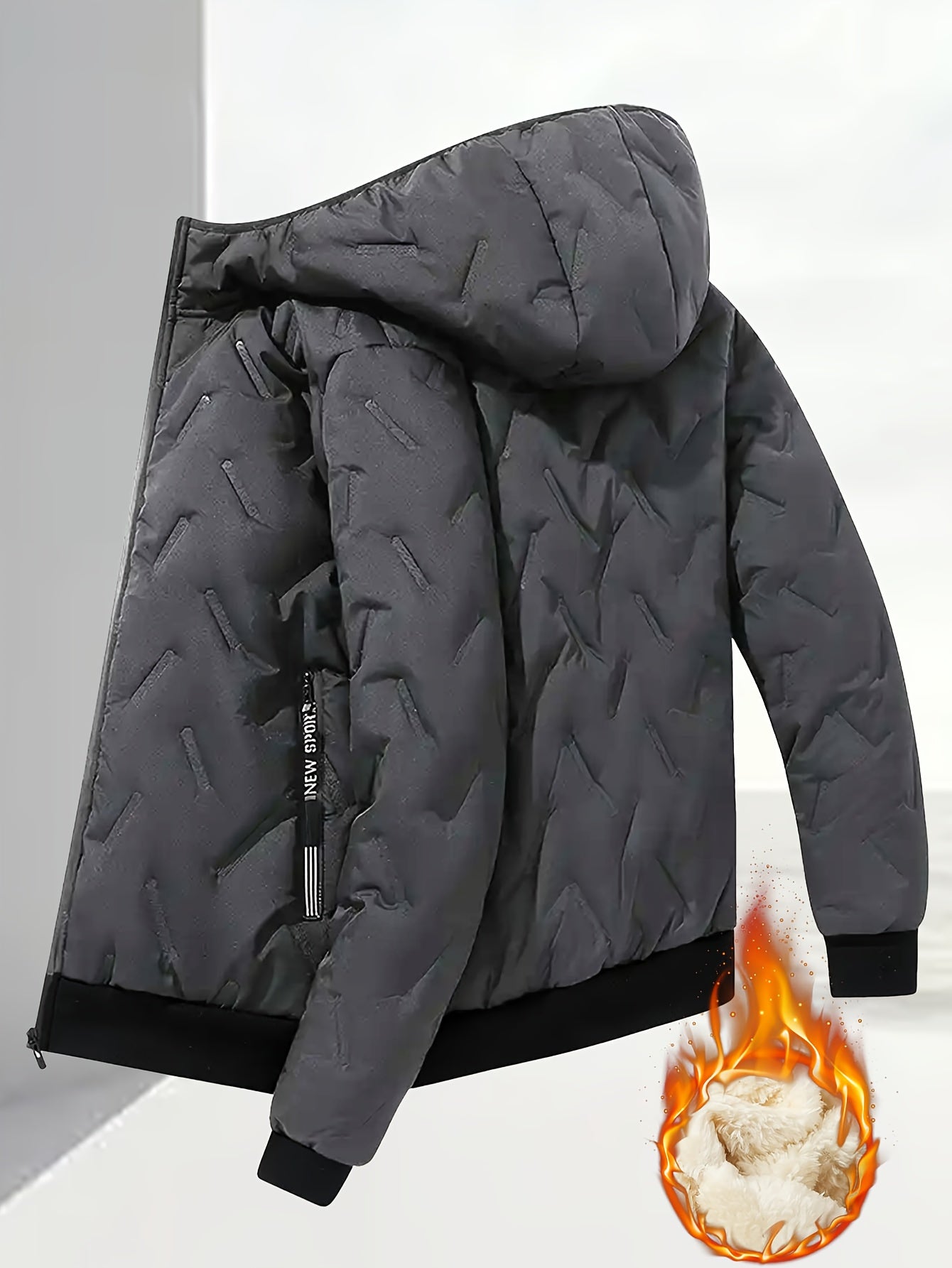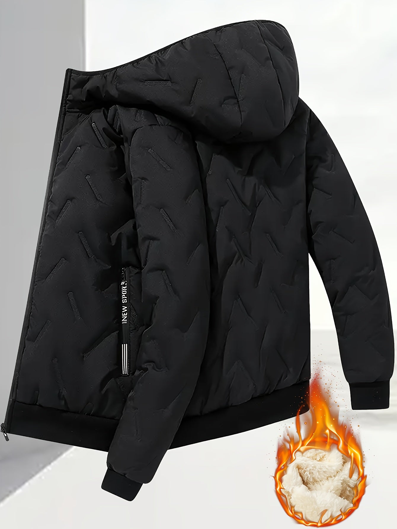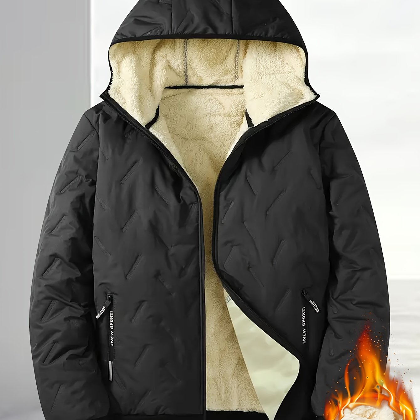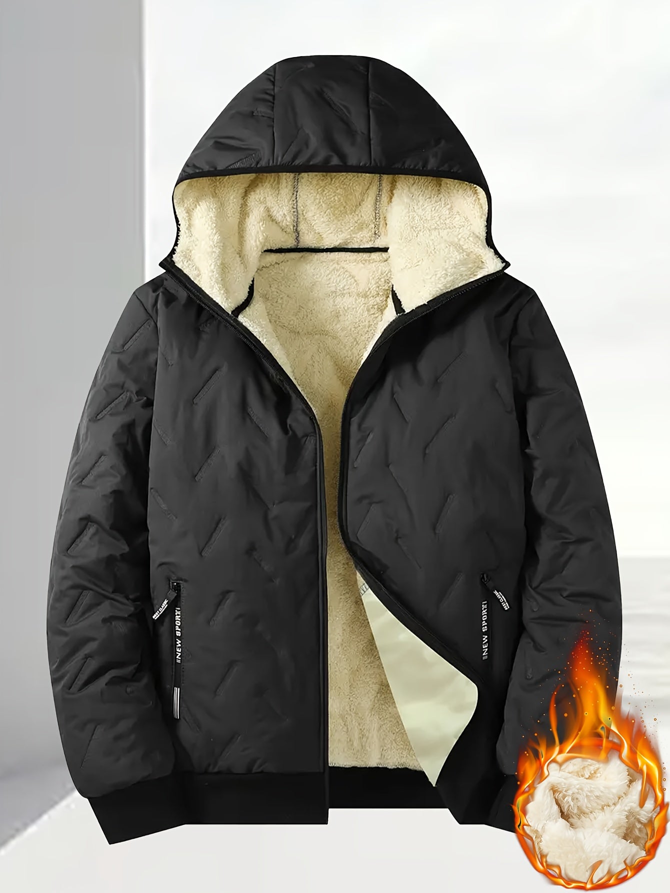 Men'S Winter Warm Fleece-Lined Zip-Up Hooded Jacket with Pockets - Navy Blue & Beige Color Block, Comfortable Polyester Fabric, Ideal for Outdoor Activities, Running, and Casual Wear, Winter Jacket