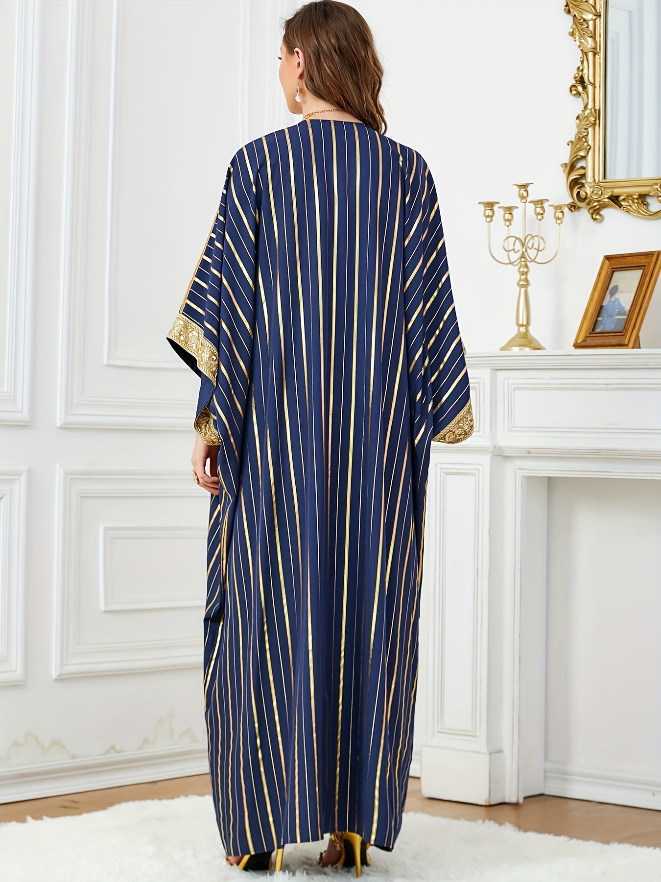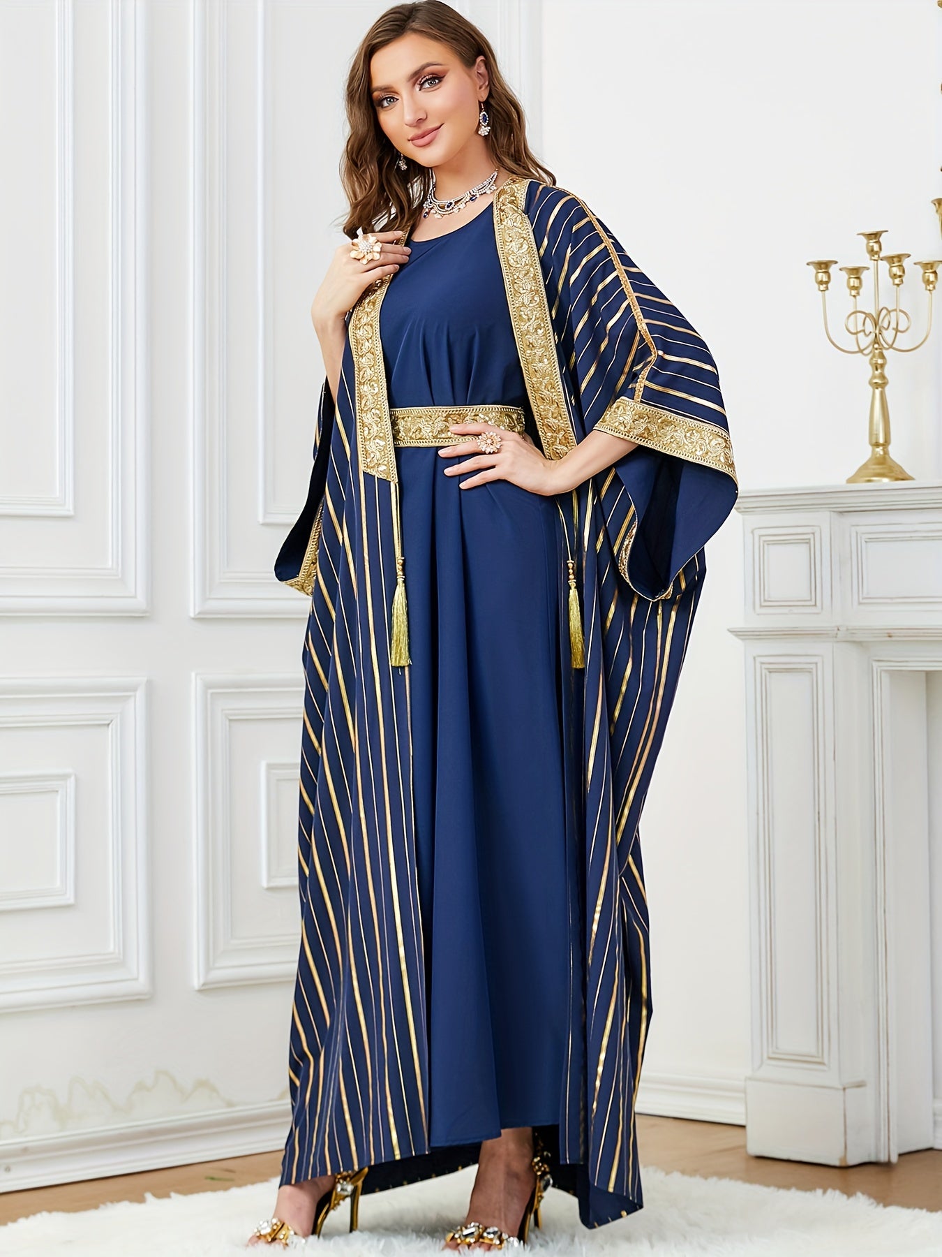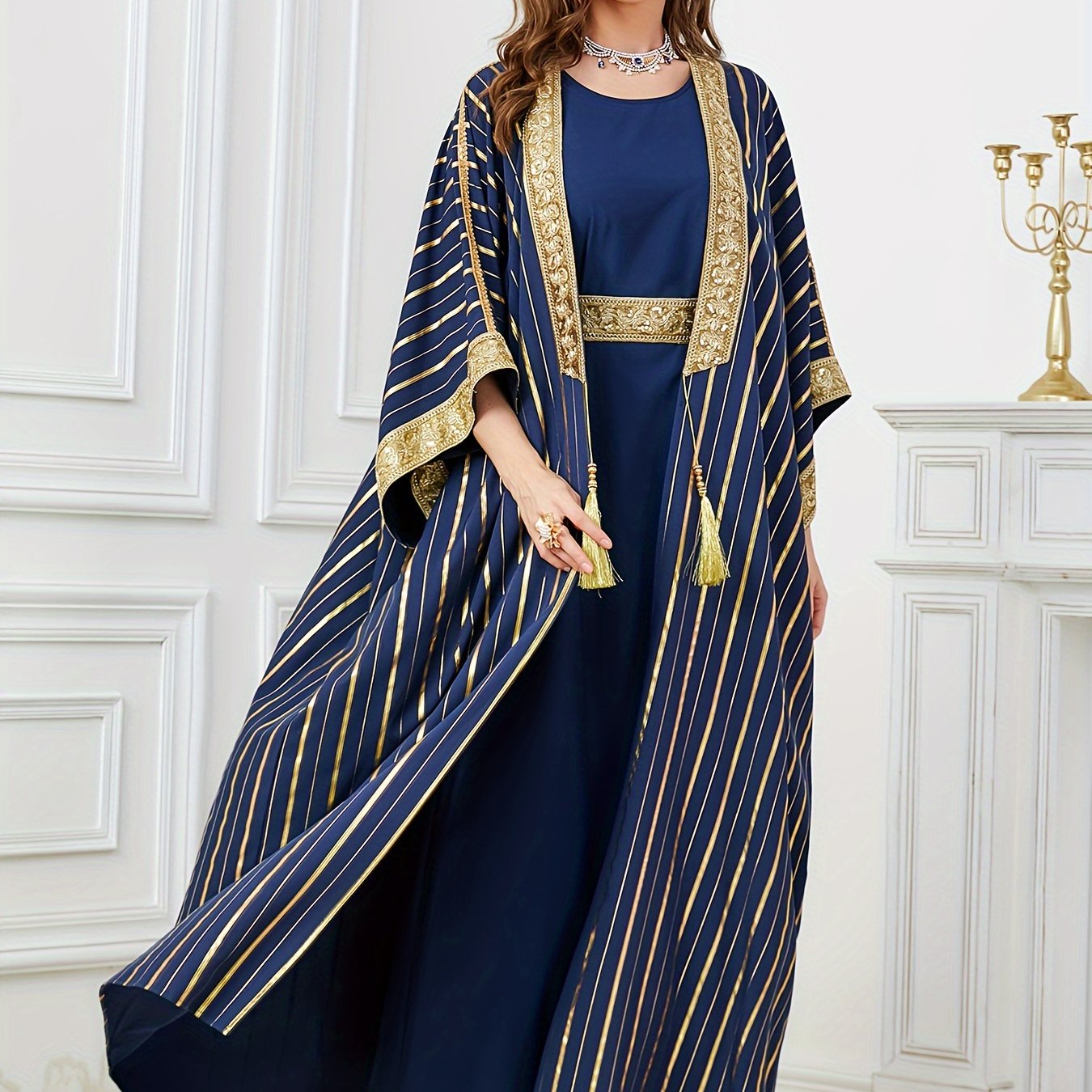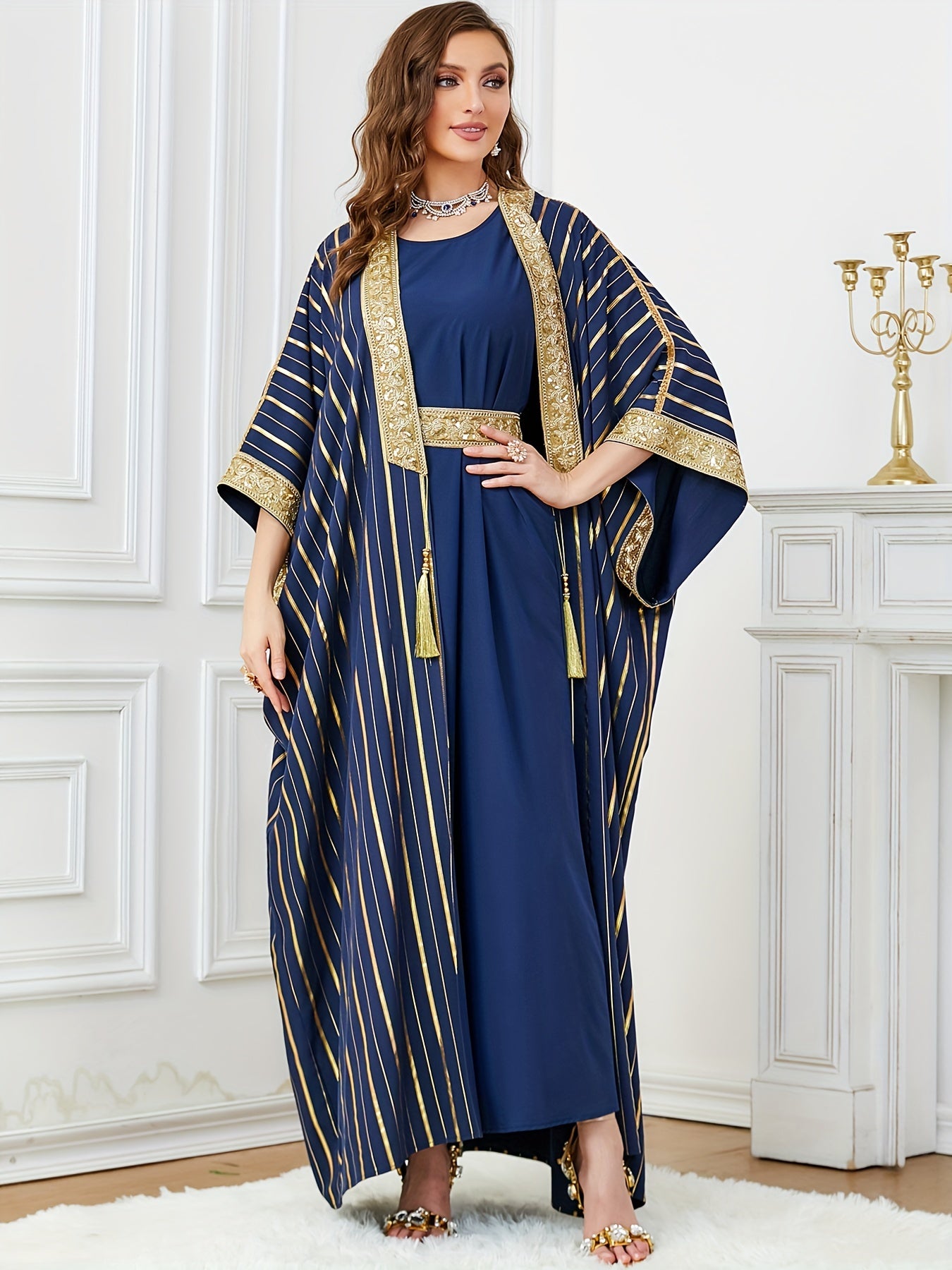 Oriented Spot Middle East Dubai Muslim Women's Abaya Four Seasons Round Neck Ramadan New Long Dress Regular Fit Ultra Thick Texture Super Soft Fabric Open Front Two-Piece Set Golden Belt Craft Flared Sleeve Lightweight Elegan