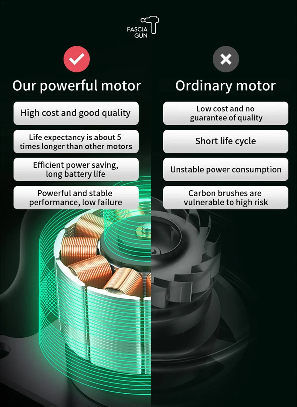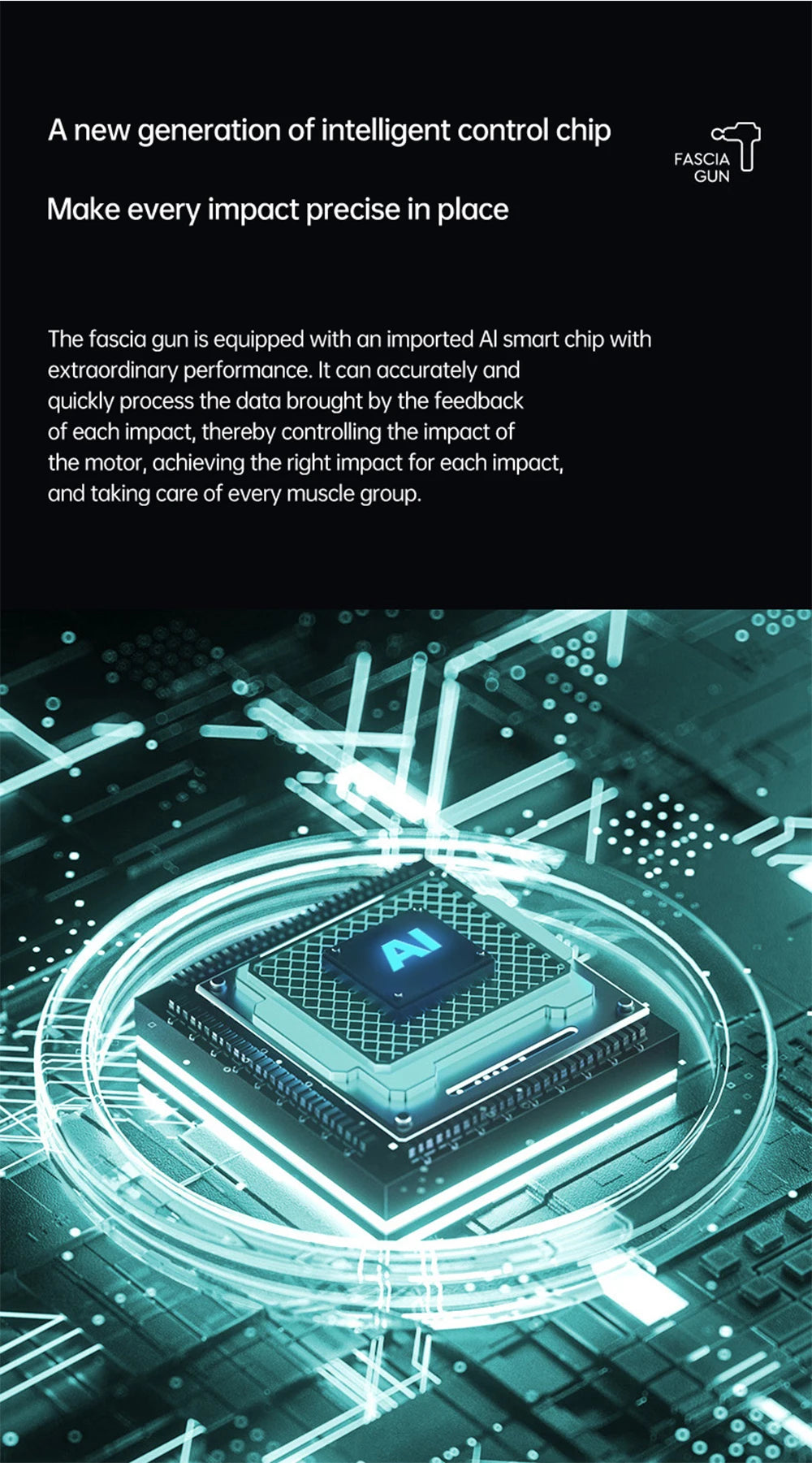 Le pistolet fascia est équipé d'une puce intelligente Al importée avec des performances extraordinaires.Il peut traiter avec précision et rapidité les données apportées par le retour de chaque impact, contrôlant ainsi l'impact du moteur, obtenant le bon impact pour chaque impact et prenant soin de chaque groupe musculaire.