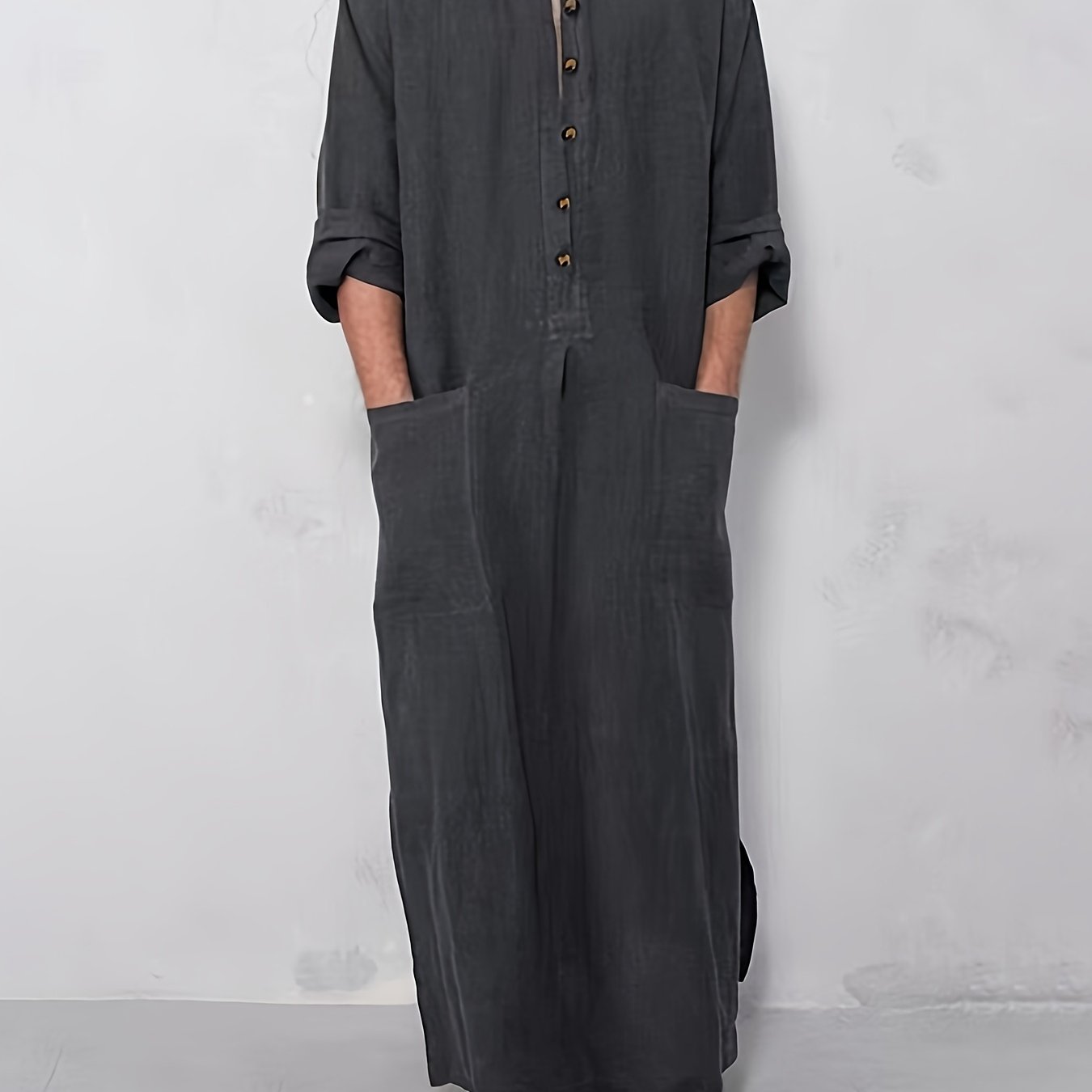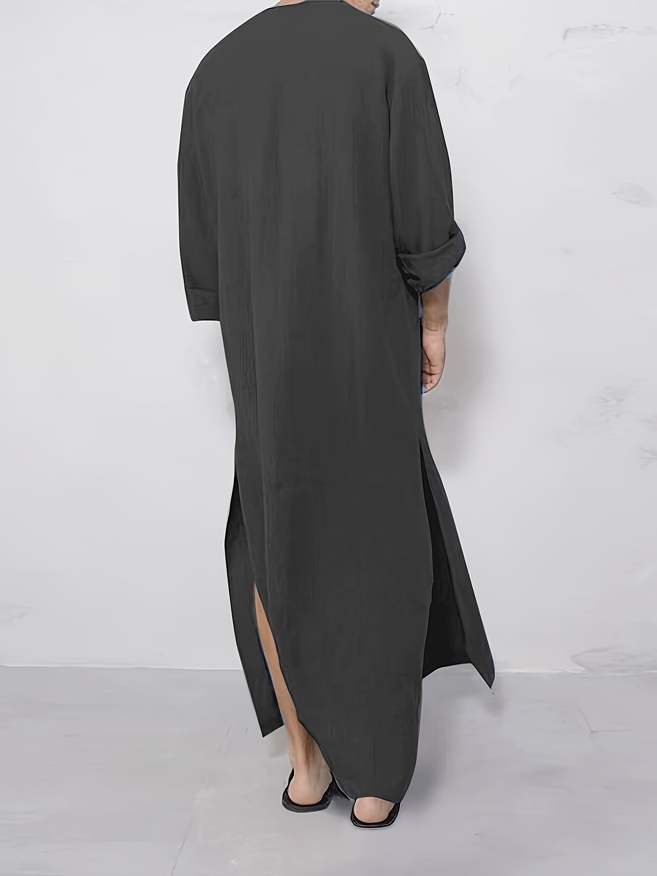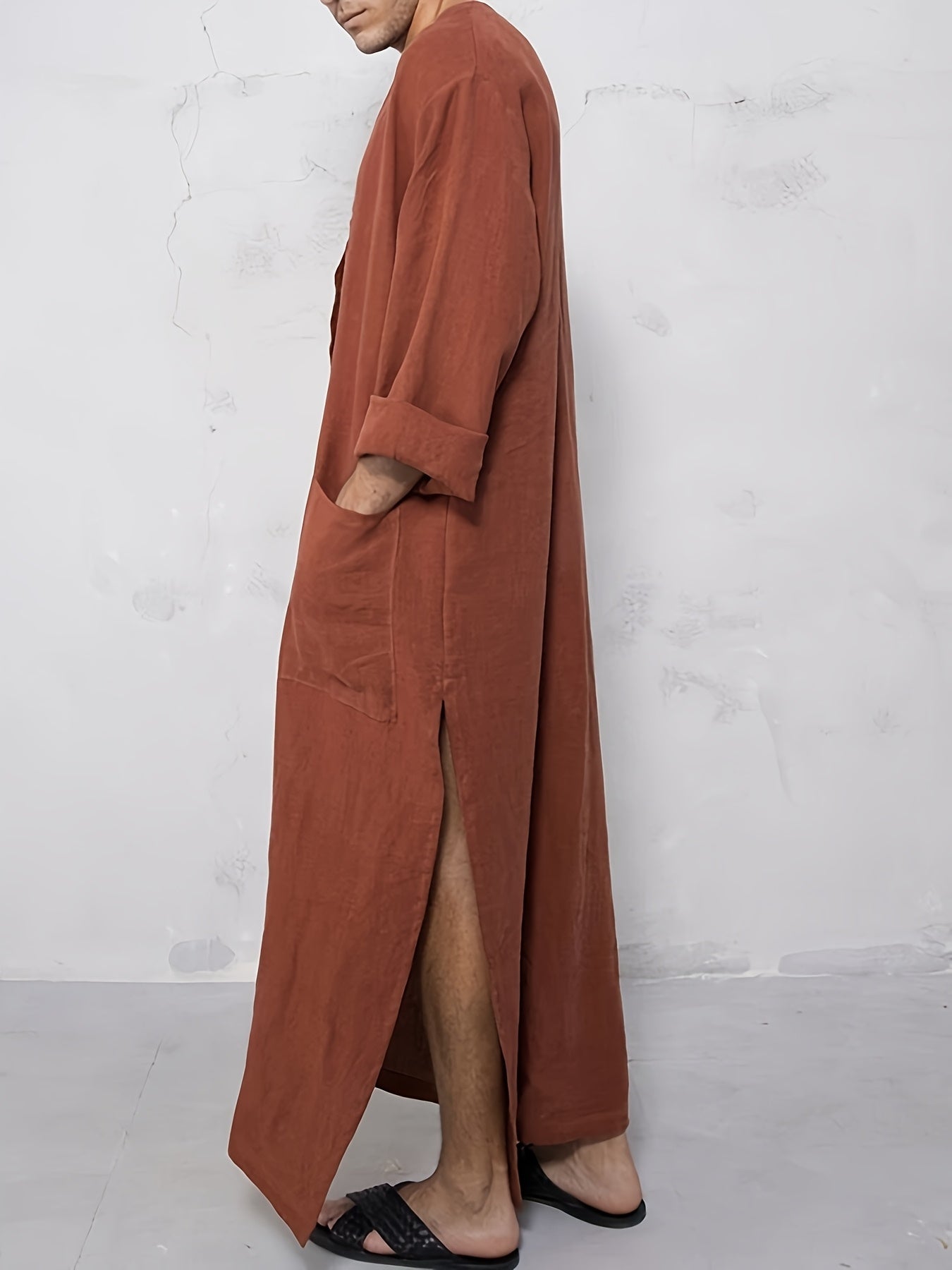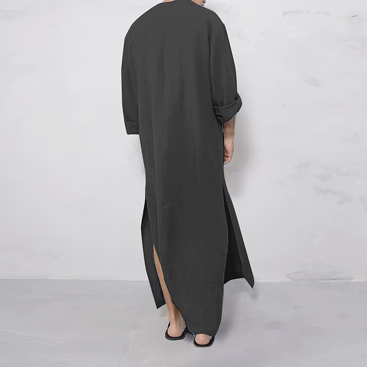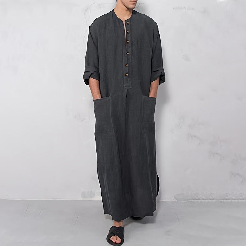 Southeast Asian Men's Loose Striped Round Neck Long Sleeve Muslim Robe Hoodie Pocket Middle Eastern Abaya