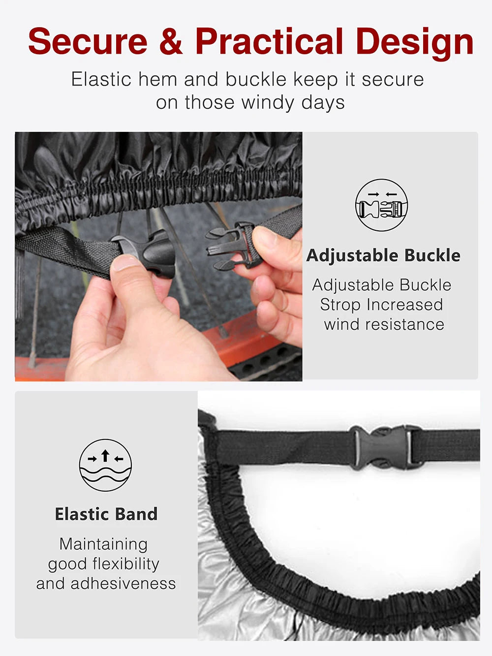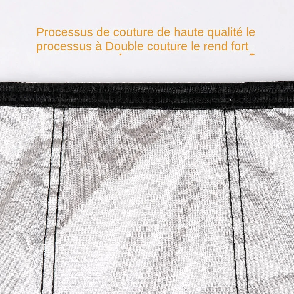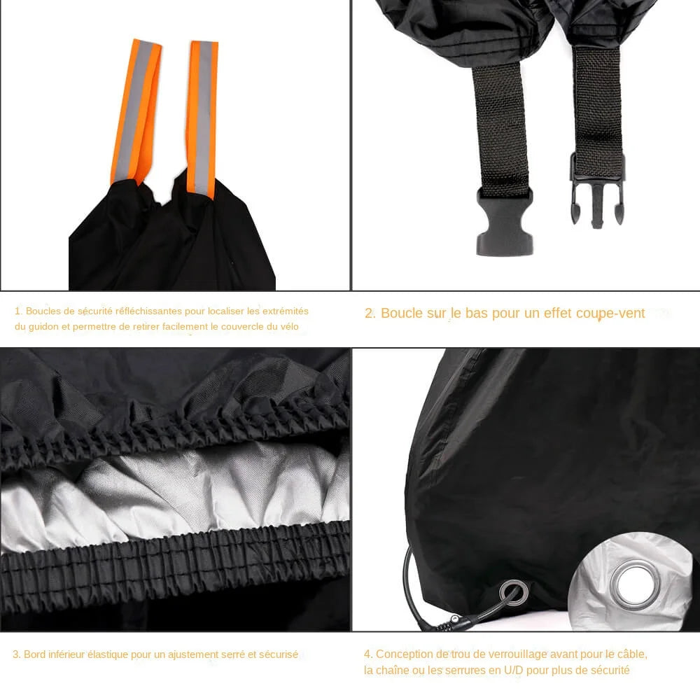 Conception--- Les boucles de sécurité réfléchissantes dans la zone du guidon permettent un retrait rapide et facile de la housse de protection du vélo, équipée de attaches coupe-vent (faciles à installer) et de cordes élastiques (s'adapte mieux aux carrosseries de la voiture), Un trou sur le bord inférieur de la la bâche est idéale pour un cadenas de vélo.