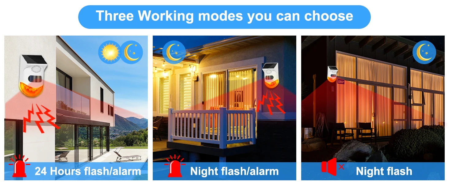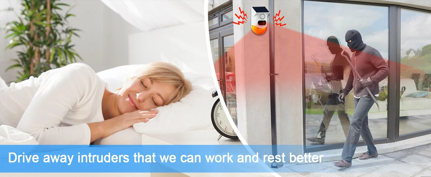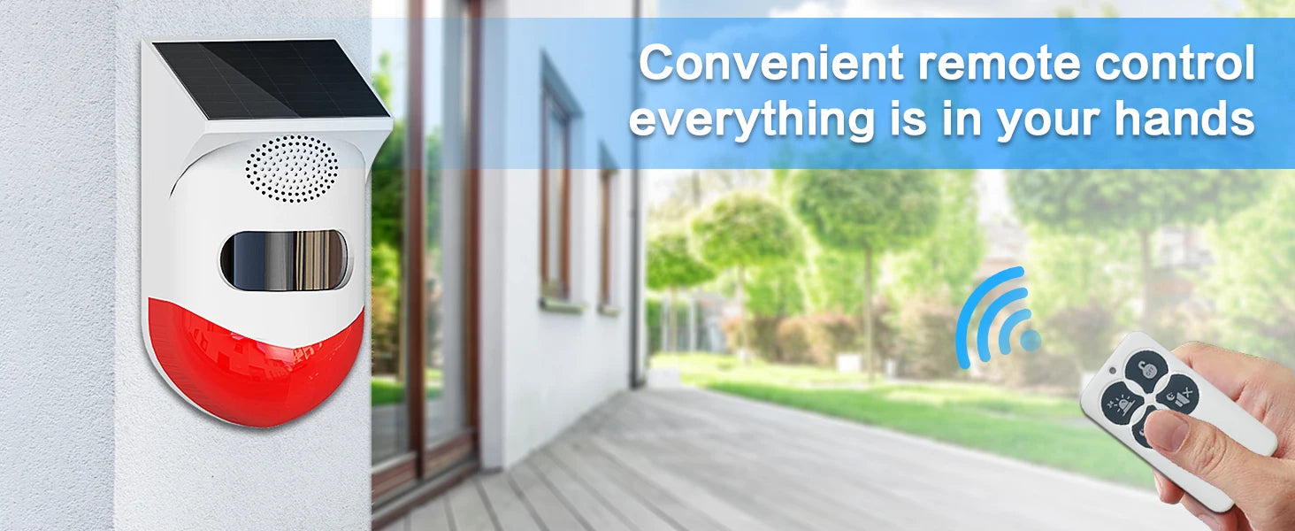 Cette sirène stroboscopique activée par le mouvement solaire peut rester en veille pendant 60 jours avec une seule charge et convient à la sécurité résidentielle, aux fermes, aux villas, aux hôtels, aux marchés, aux pensions et à d'autres endroits nécessitant des alarmes de sécurité.