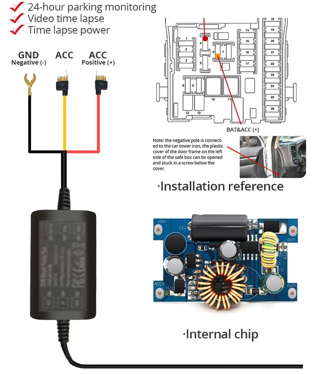 La voiture s'arrête, la sécurité ne s'arrête jamais.Le mode Time-Lapse permet un enregistrement 24 heures sur 24 ; Le mode G-Sensor enregistre automatiquement lorsqu'un mouvement et un impact sont détectés.Laissez votre voiture entre les mains en toute sécurité dans les deux modes.(Besoin d'utiliser la ligne Buck)