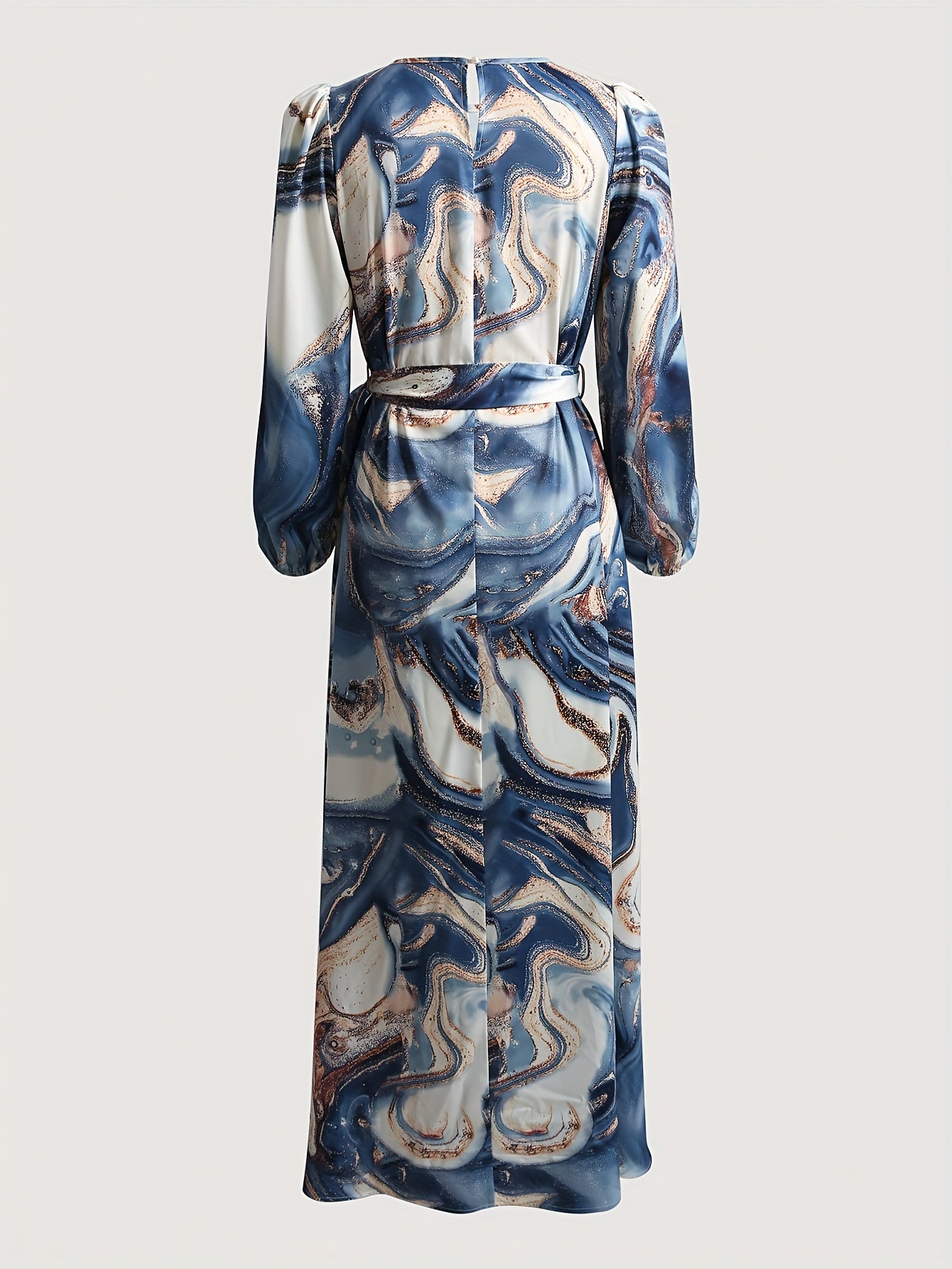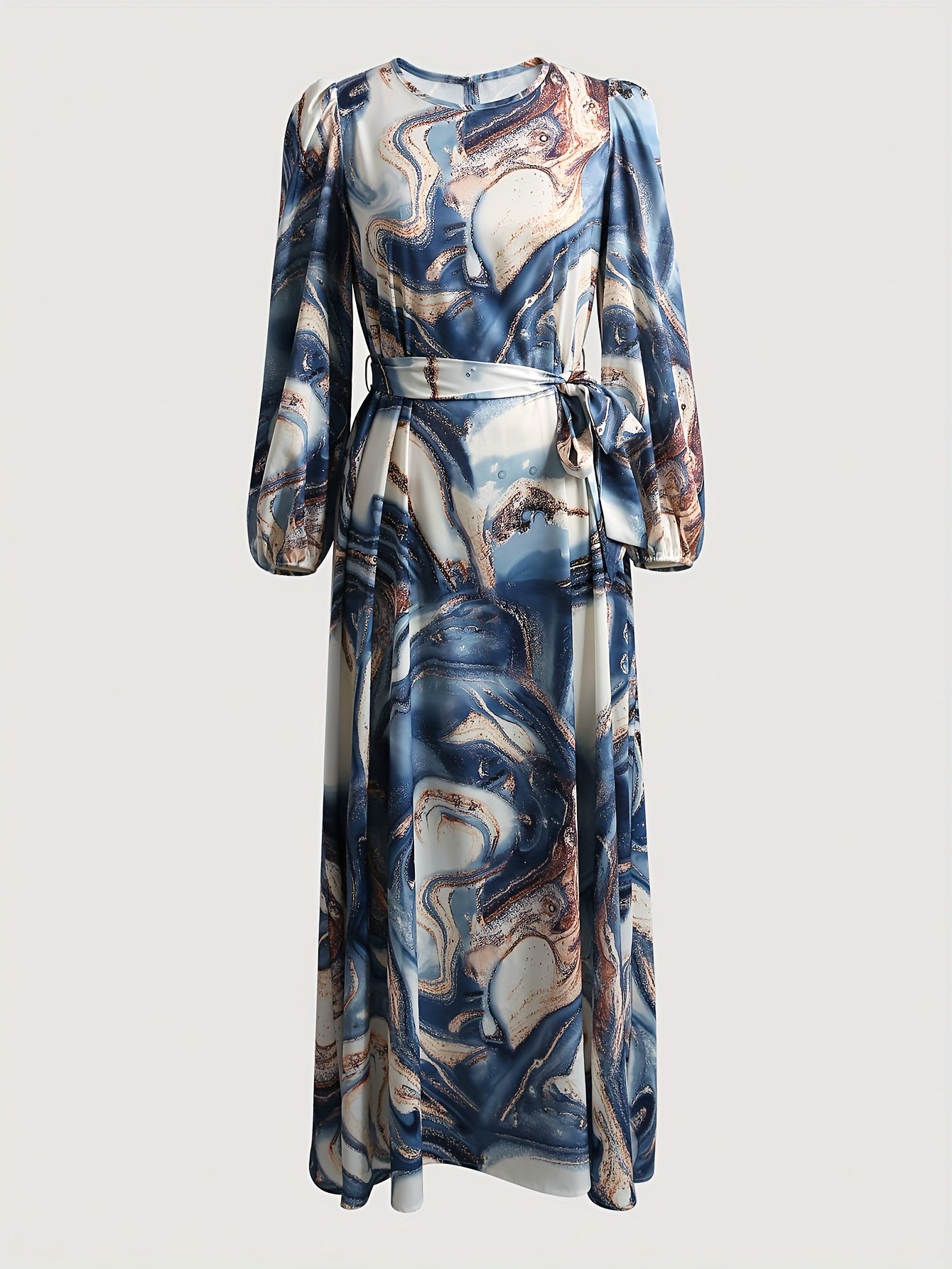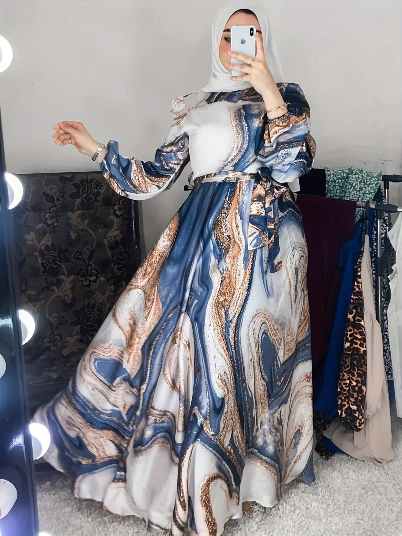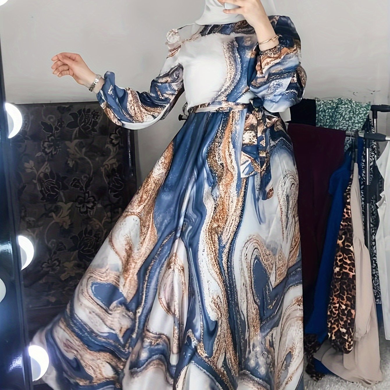 Vibrant Middle Eastern Inspired Print Long Dress - Dresses for Women - Polyester Woven Fabric, Round Neck, A-Line Skirt, Color Block Design, Comfortable and Stylish for All Seasons and Occasions