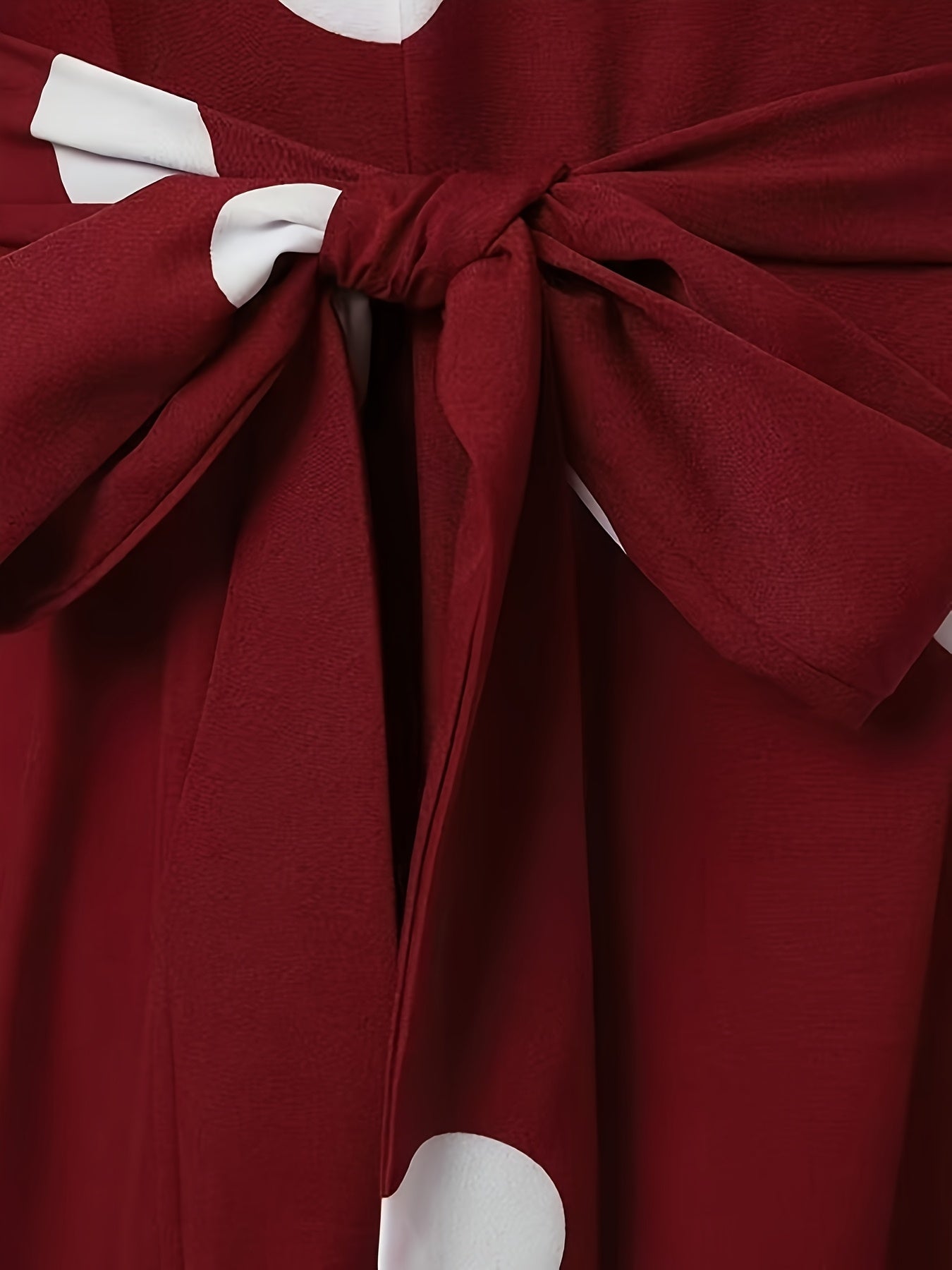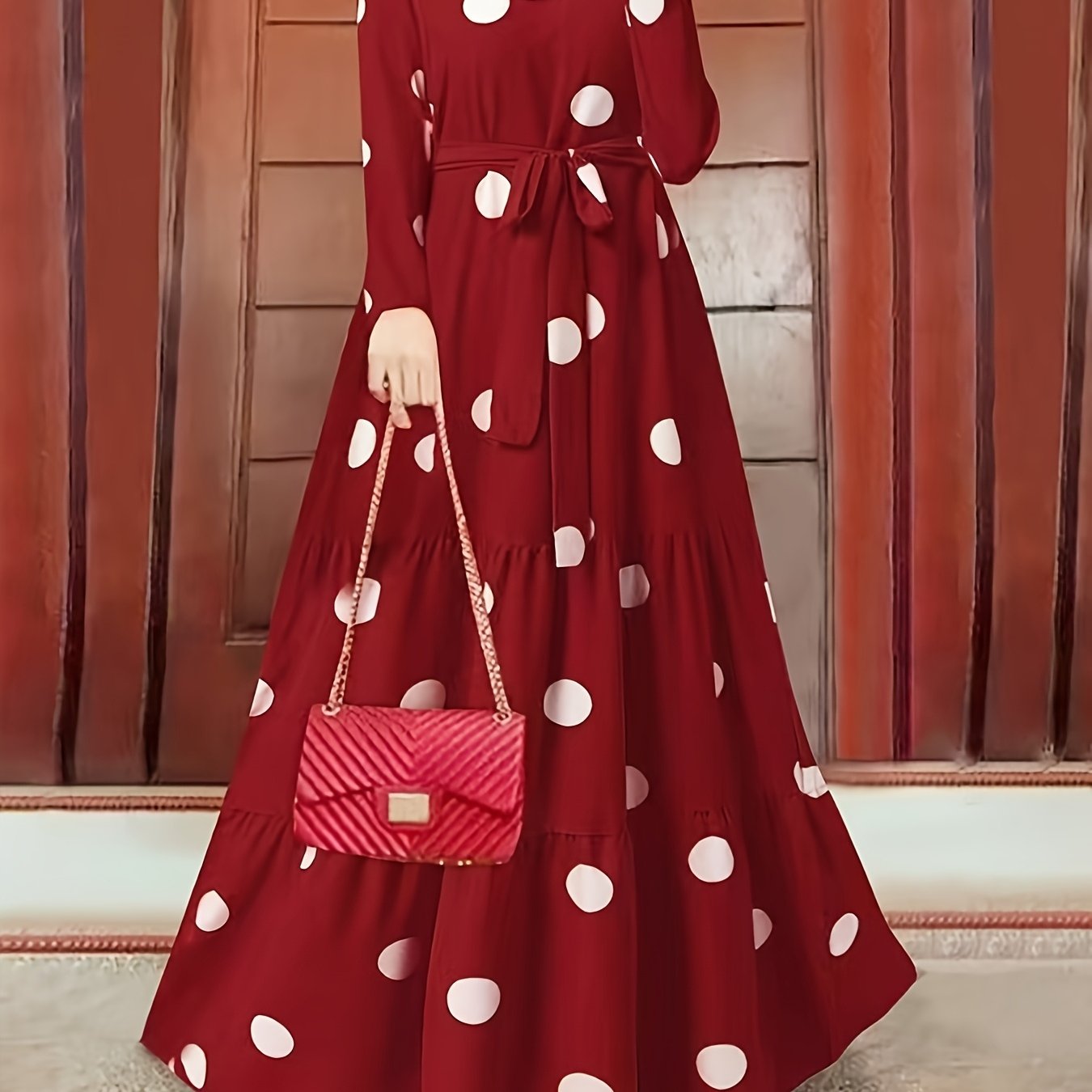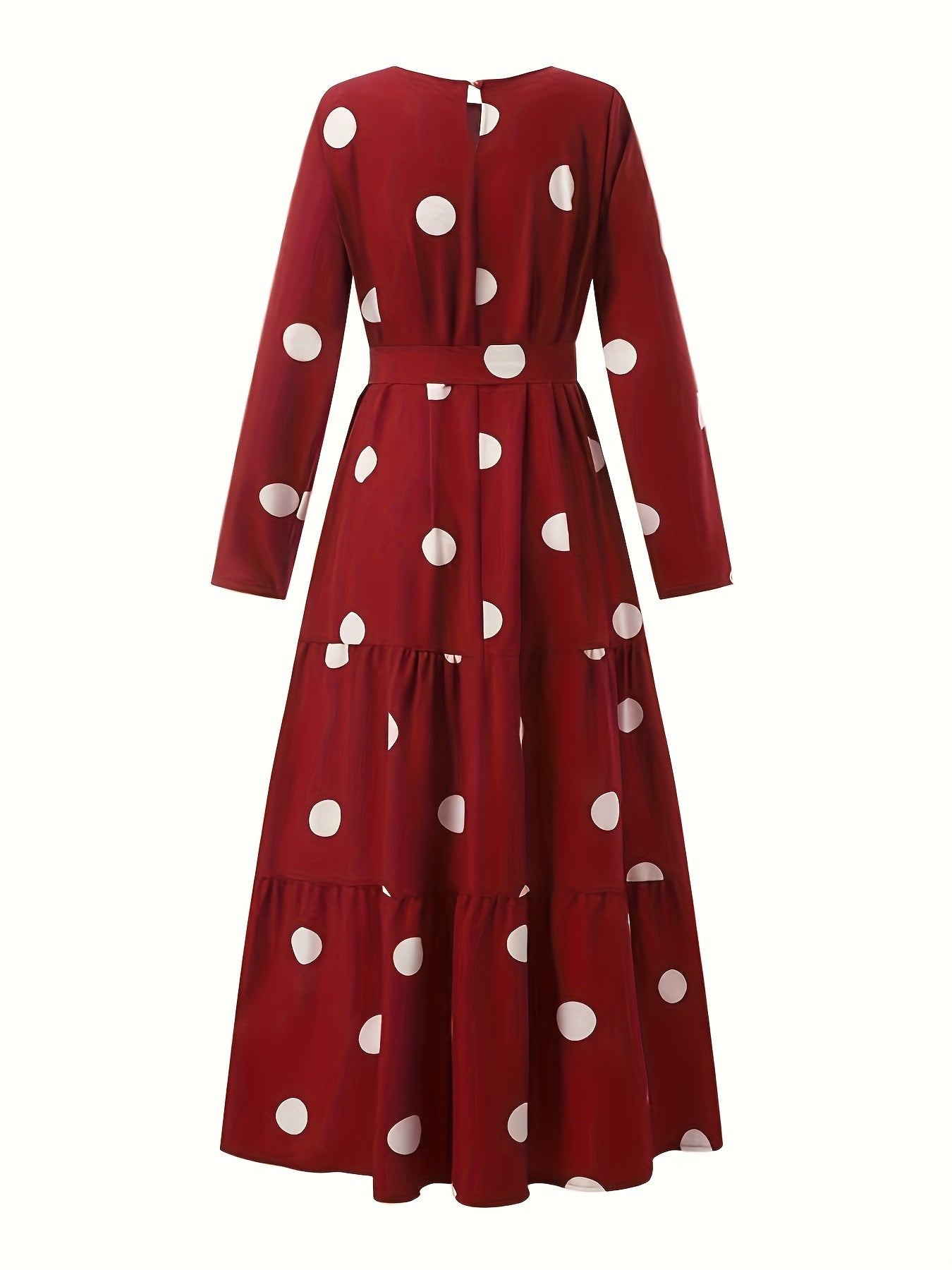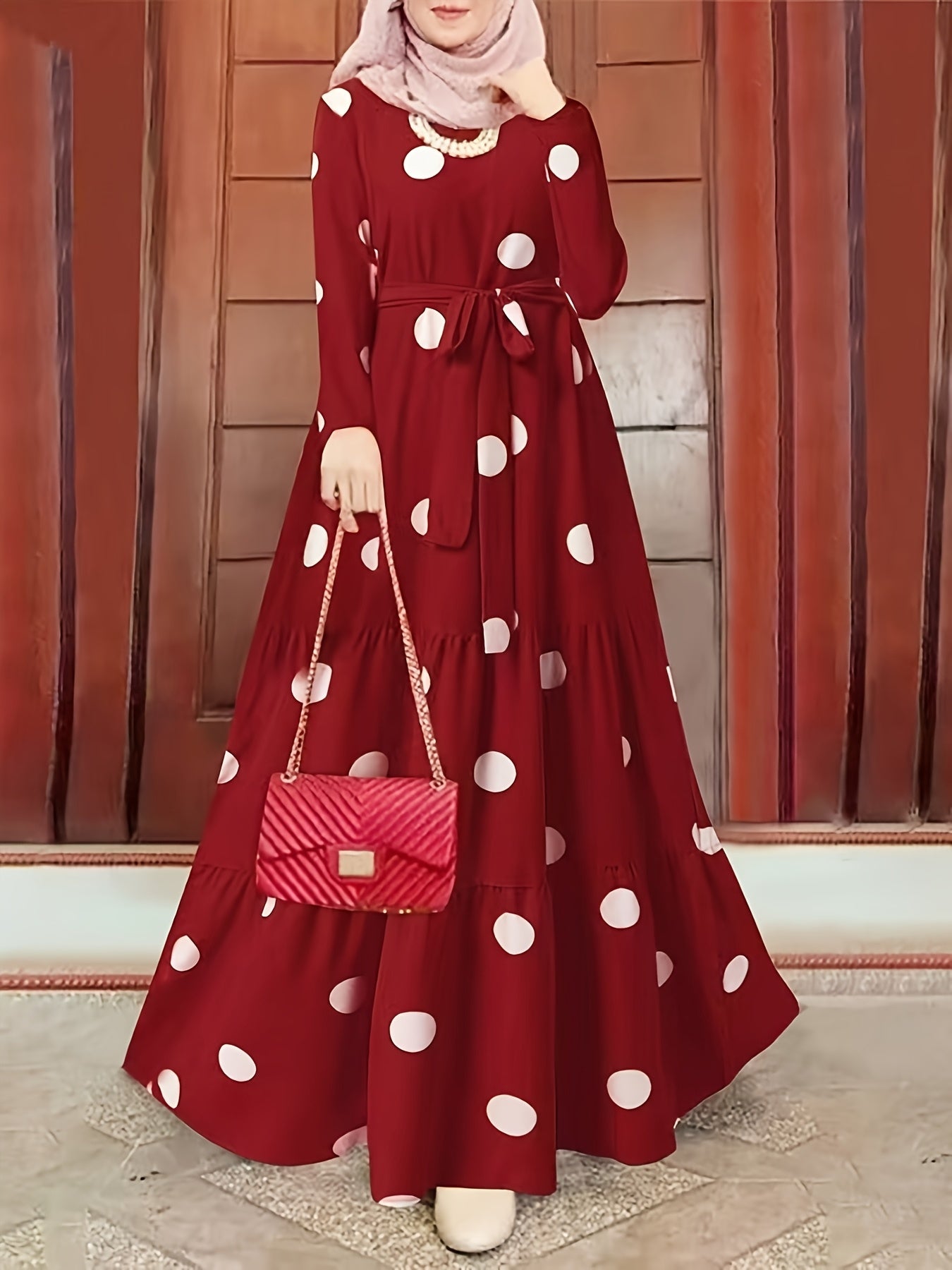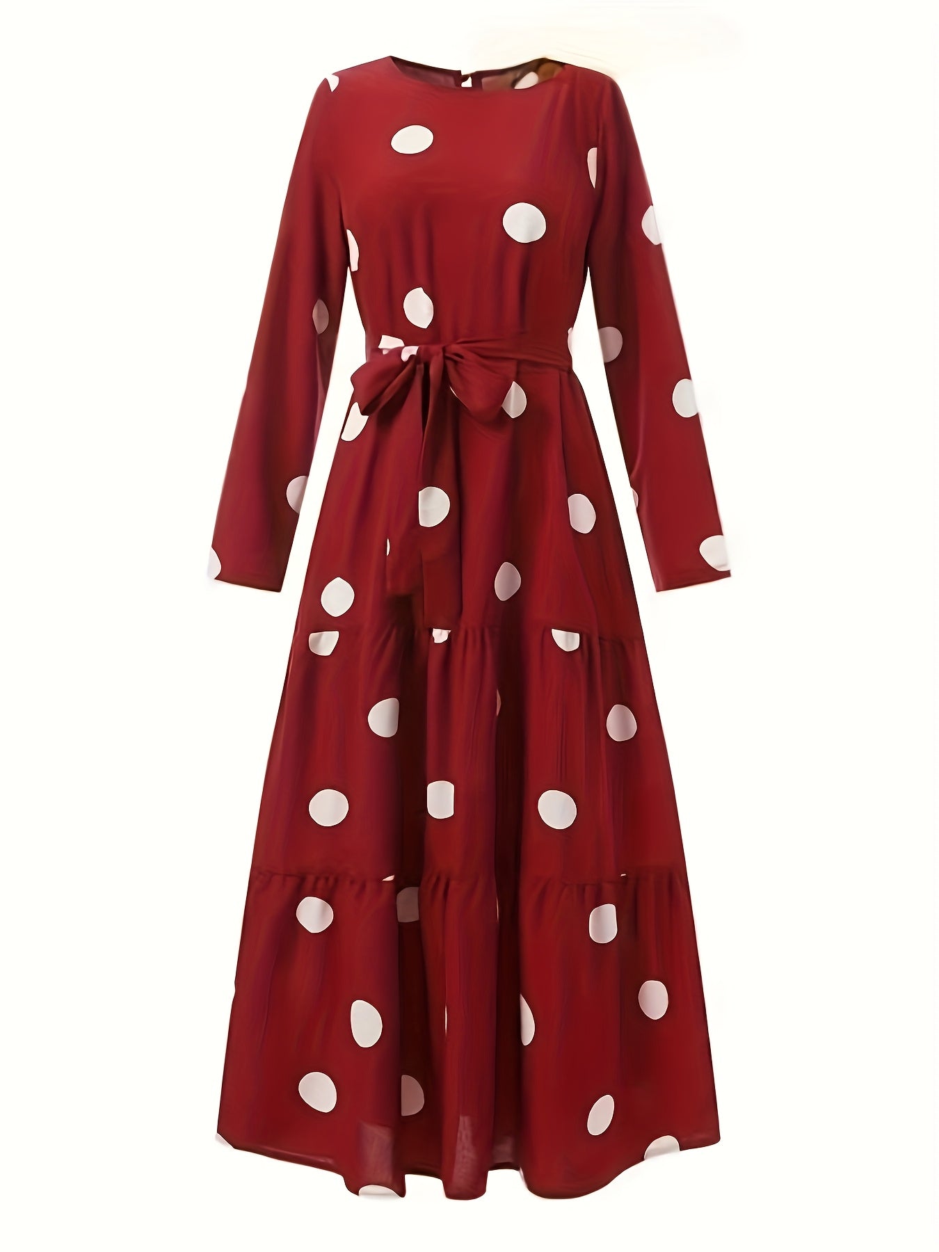 Vintage Red & White Polka Dot Middle Eastern Sun Dress - Long Sleeve Belted Loose Fit Maxi Dress with Round Neck, Machine Washable All-Season Traditional Attire, Retro Dresses, Cultural Fashion Wear, Flowy Fabric Gown