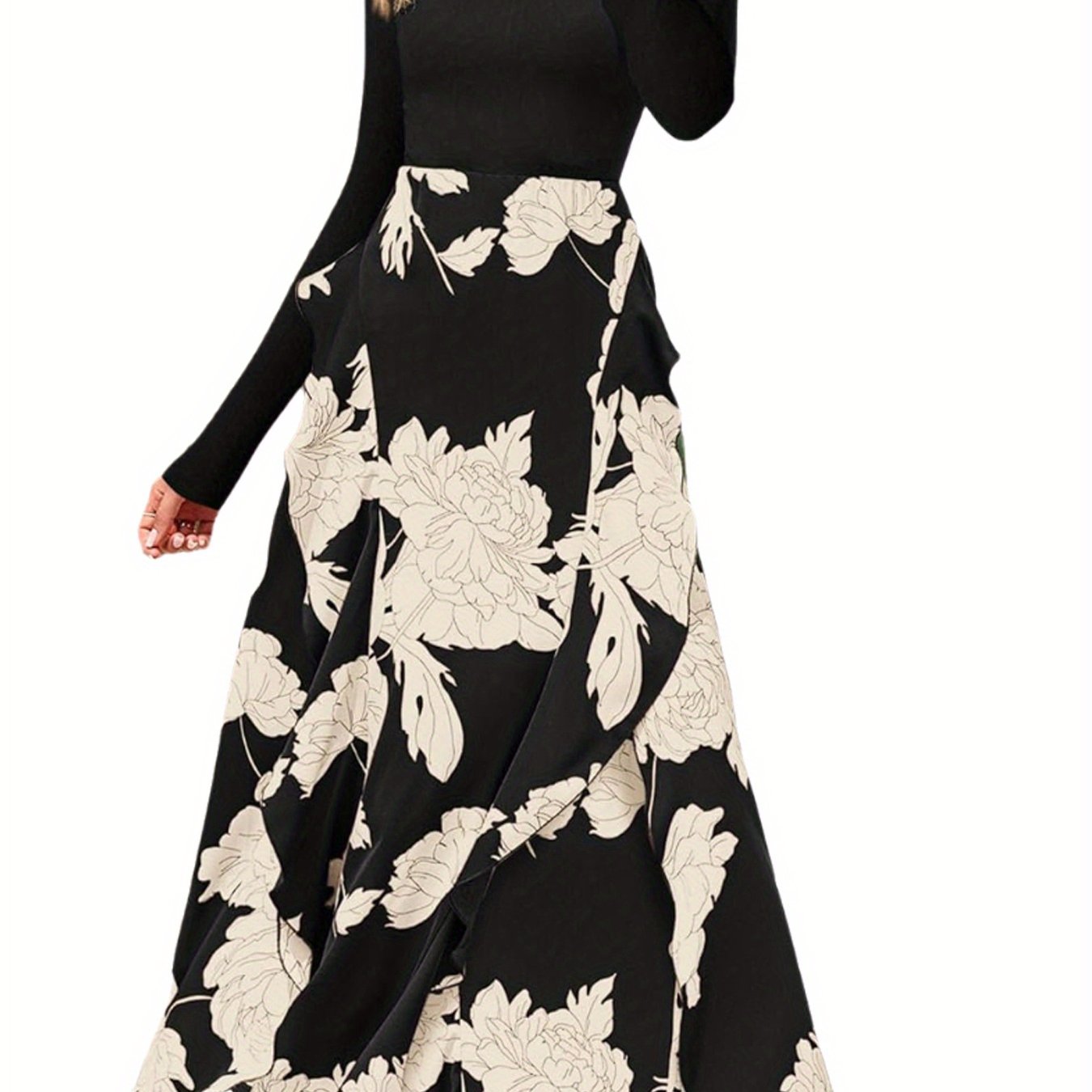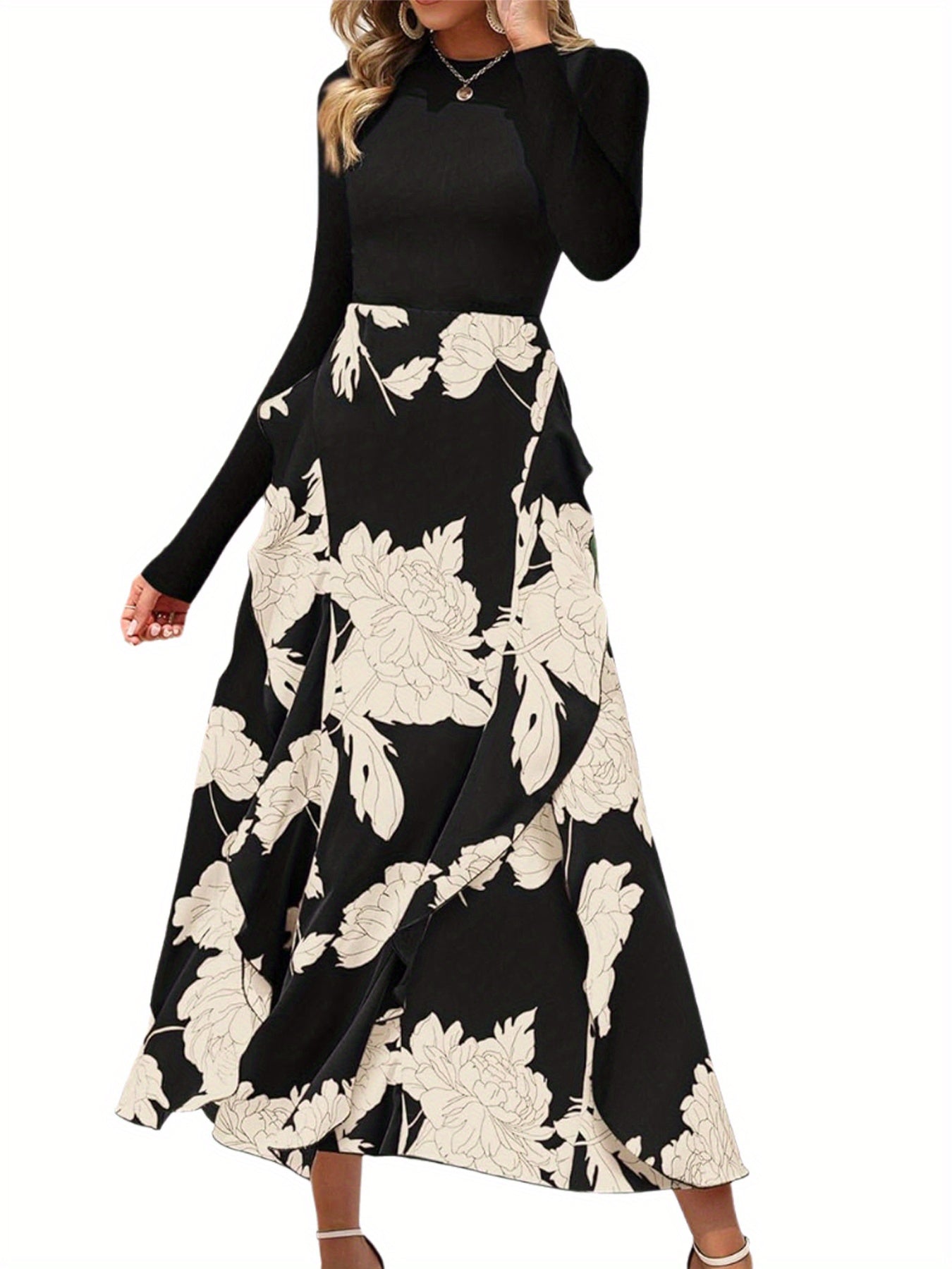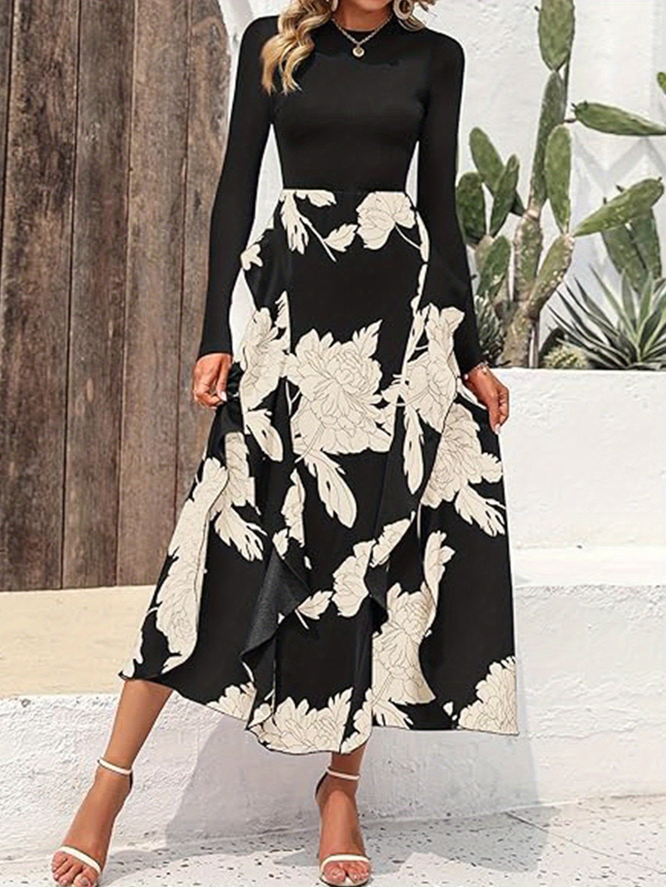 Women Fall Fashion Floral Long Dress, Crew neck Long Sleeve Ruffle Dress, Wedding Party Elegant Dress