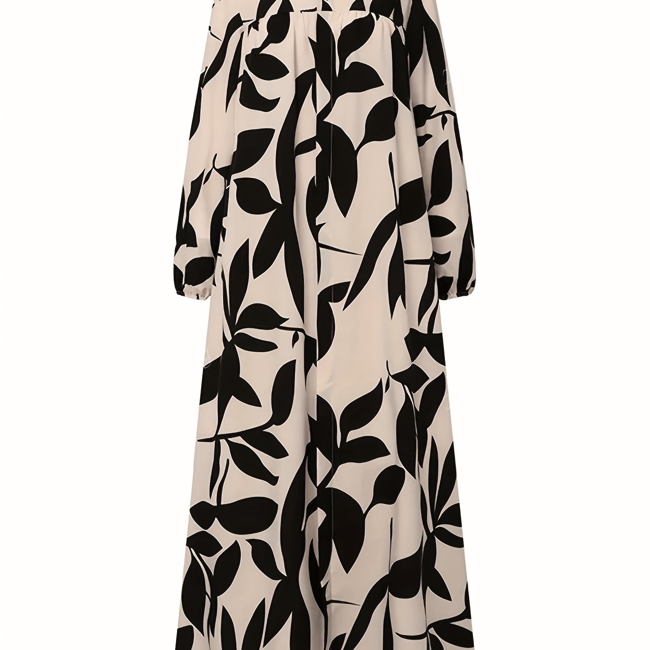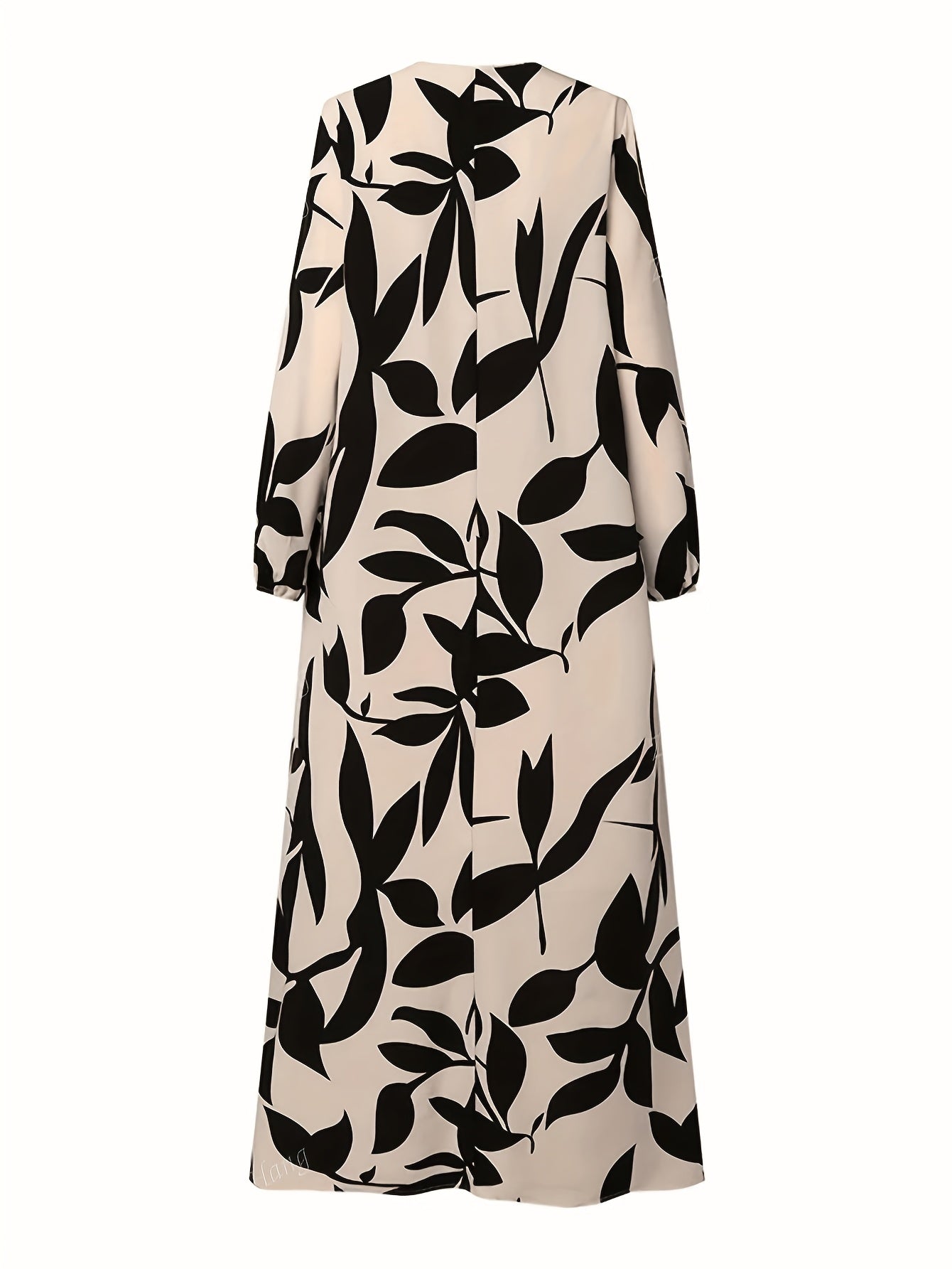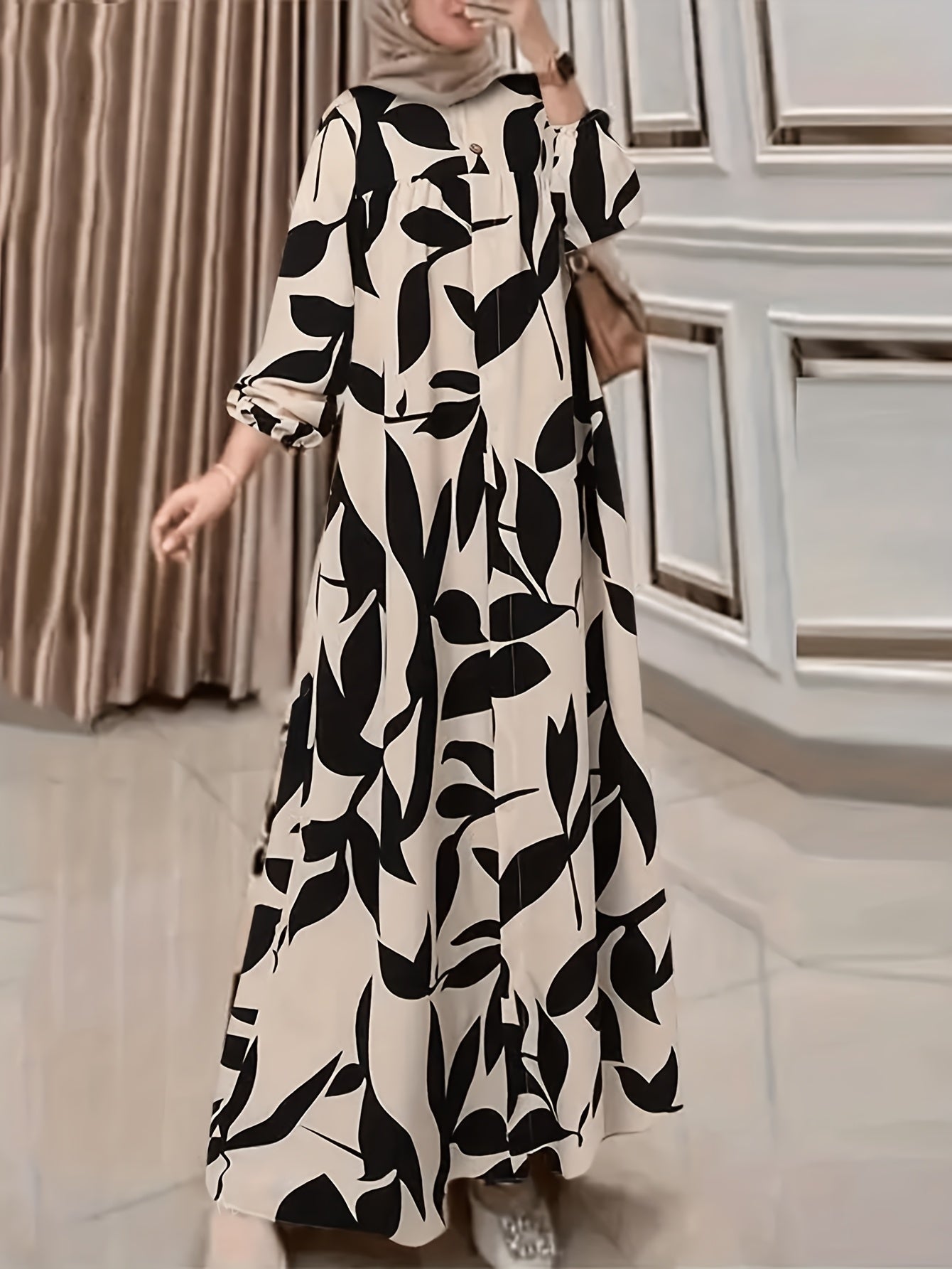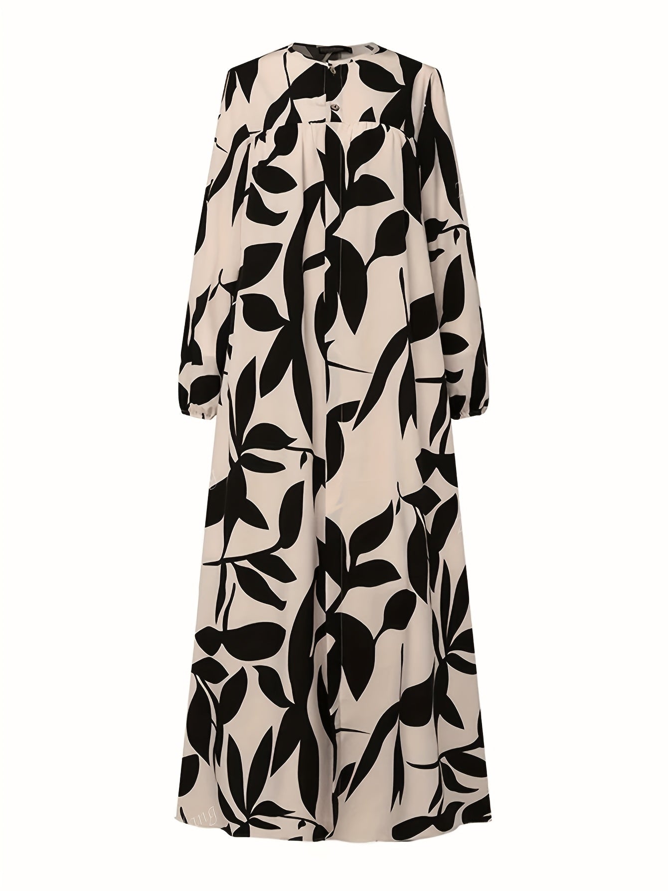 Women's Arabian-Style Plant Print Lantern Sleeve Maxi Dress - Black & Loose Fit A-Line Traditional Dress, Machine Washable All-Season Long Dress for Casual & Formal Occasions