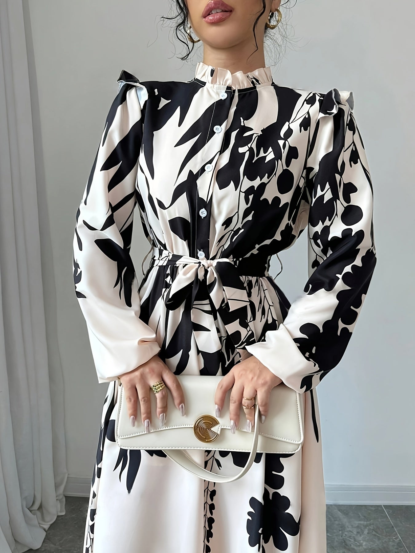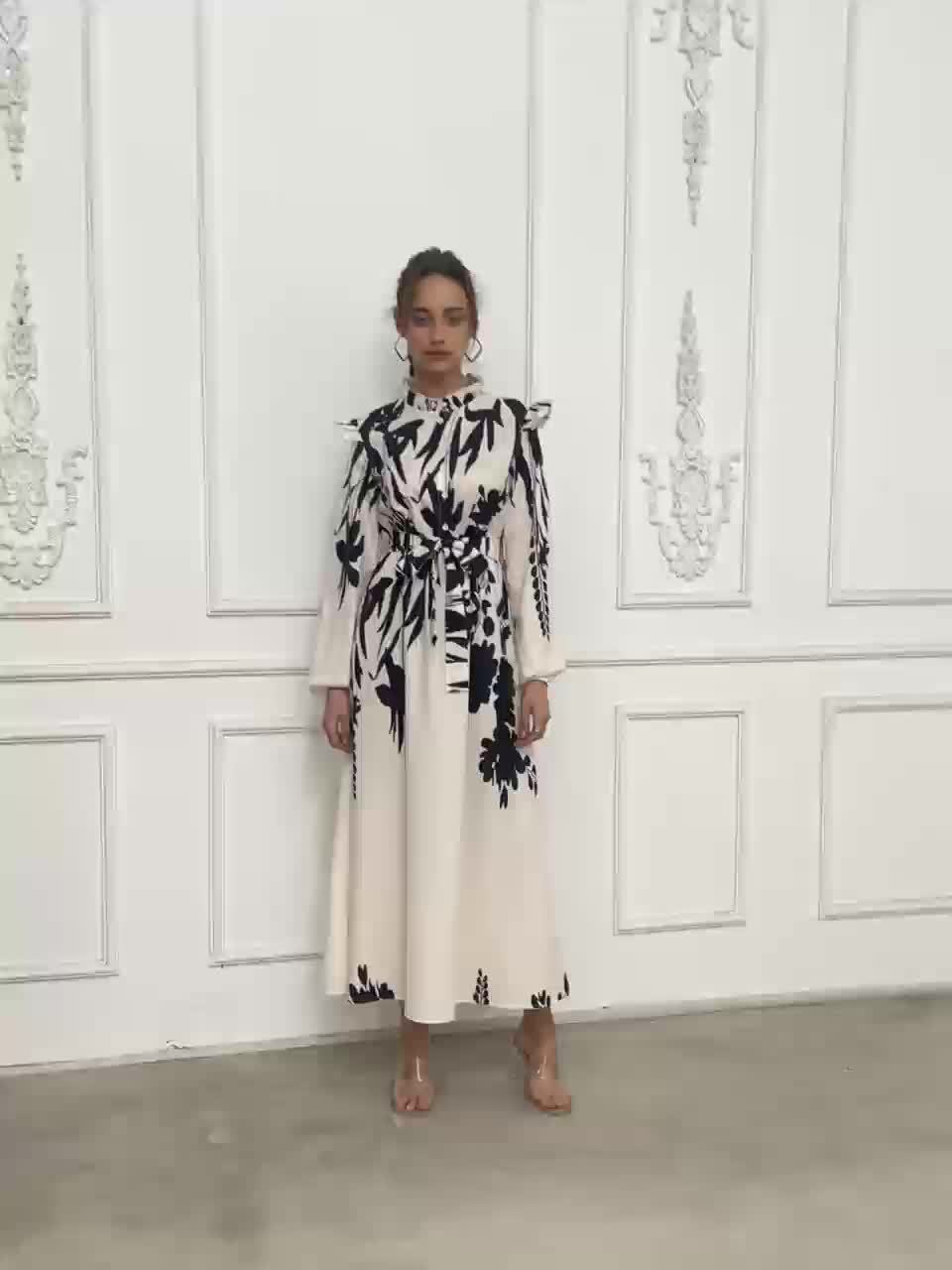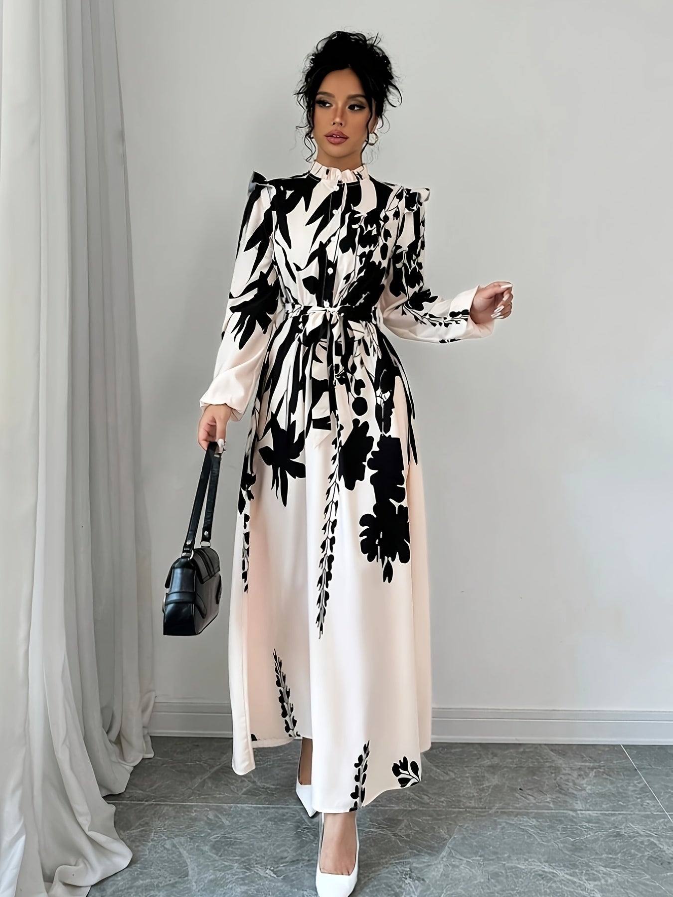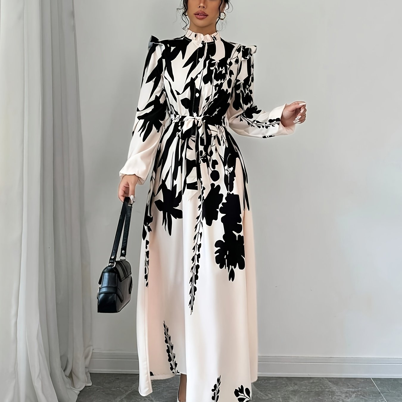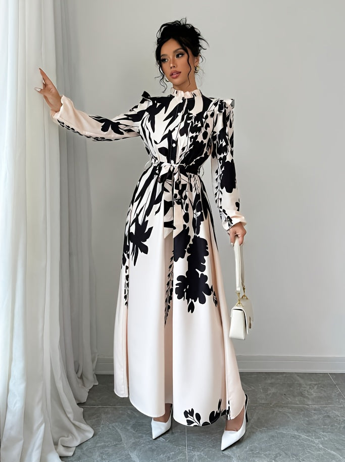 Women's Floral Print A-Line Dress with Puff Sleeves & Cinched Waist - Semi-Sheer Long Dress, Black & Floral Pattern, Stand-Up Collar, Machine Washable for Spring/Fall, Elegant Office to Party Wear, Floral Print Dress, Spring