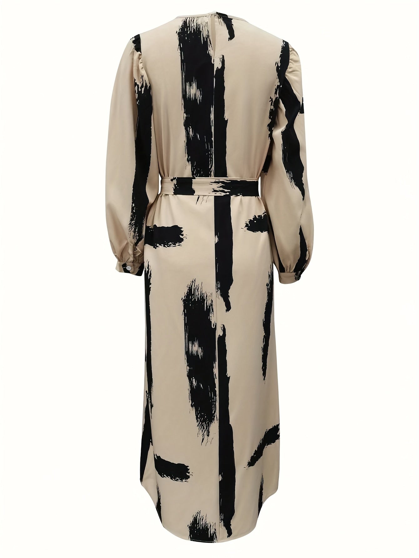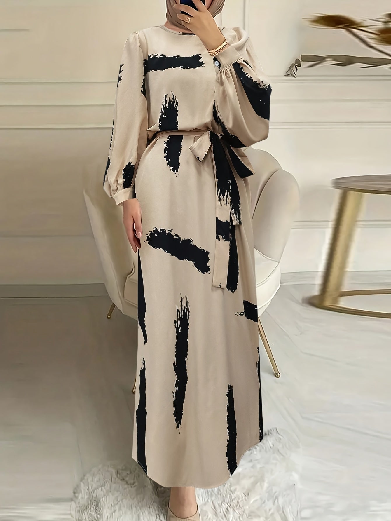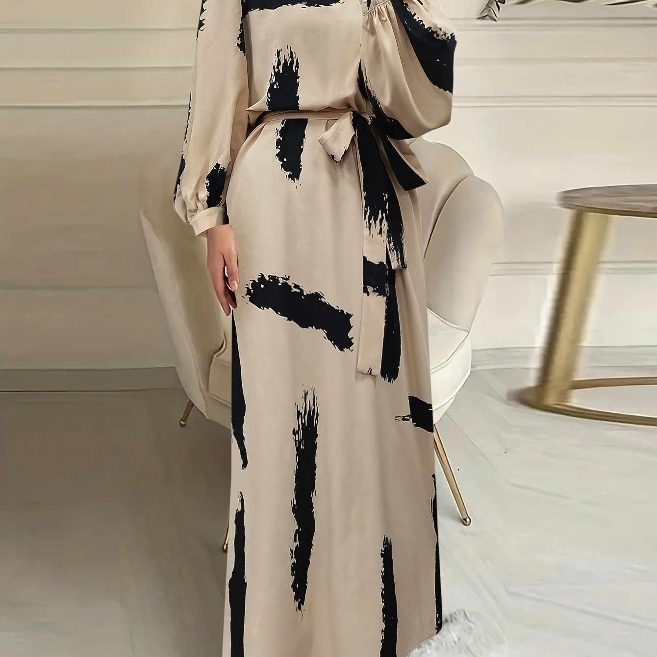 Women's Middle Eastern-Inspired Abaya Robe with Adjustable Waist Belt - Long Sleeve Full-Body Print, Machine Washable Lightweight Fabric, Beige & Black All-Season Modest Cover Dress, Modest Apparel, Flowy Silhouette
