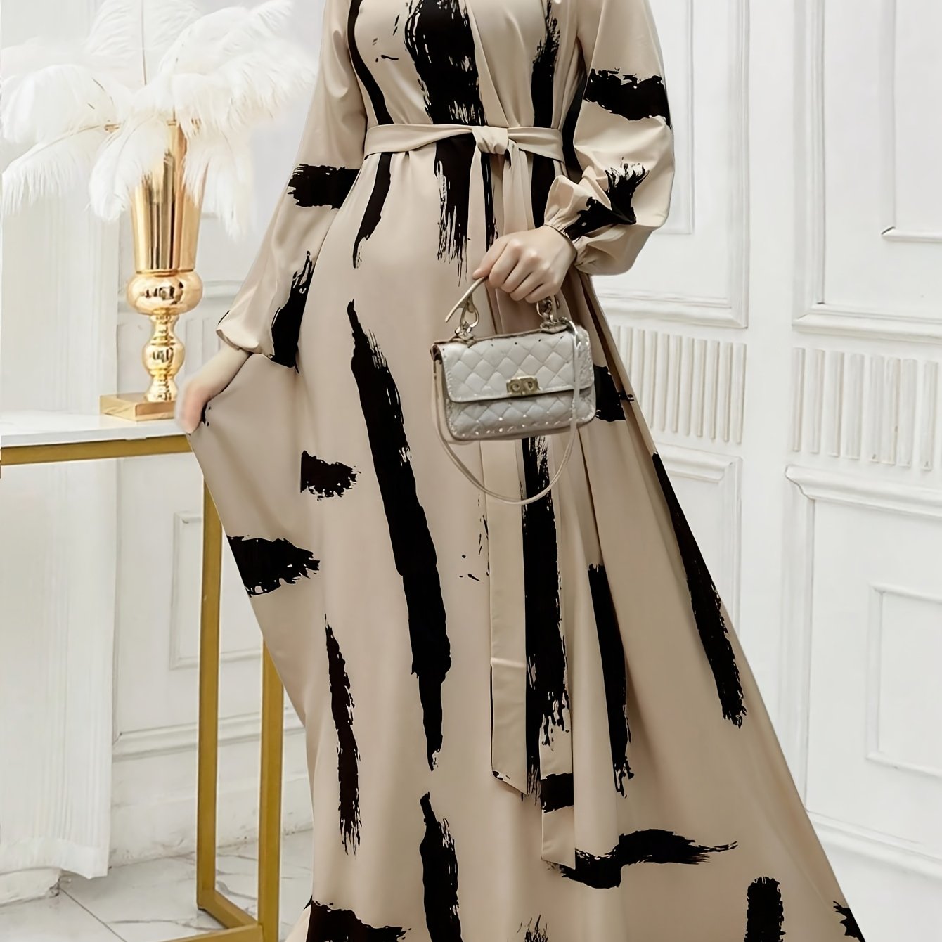 Women's Middle Eastern Ramadan Dress - Elegant Beige & black Islamic Formal attire with Tie Waist Belt, Long Sleeve Non-Stretch Dress for Ramadan, Weddings, Cultural Events - Machine Washable Modest Outfit, Muslim Dress, Reli