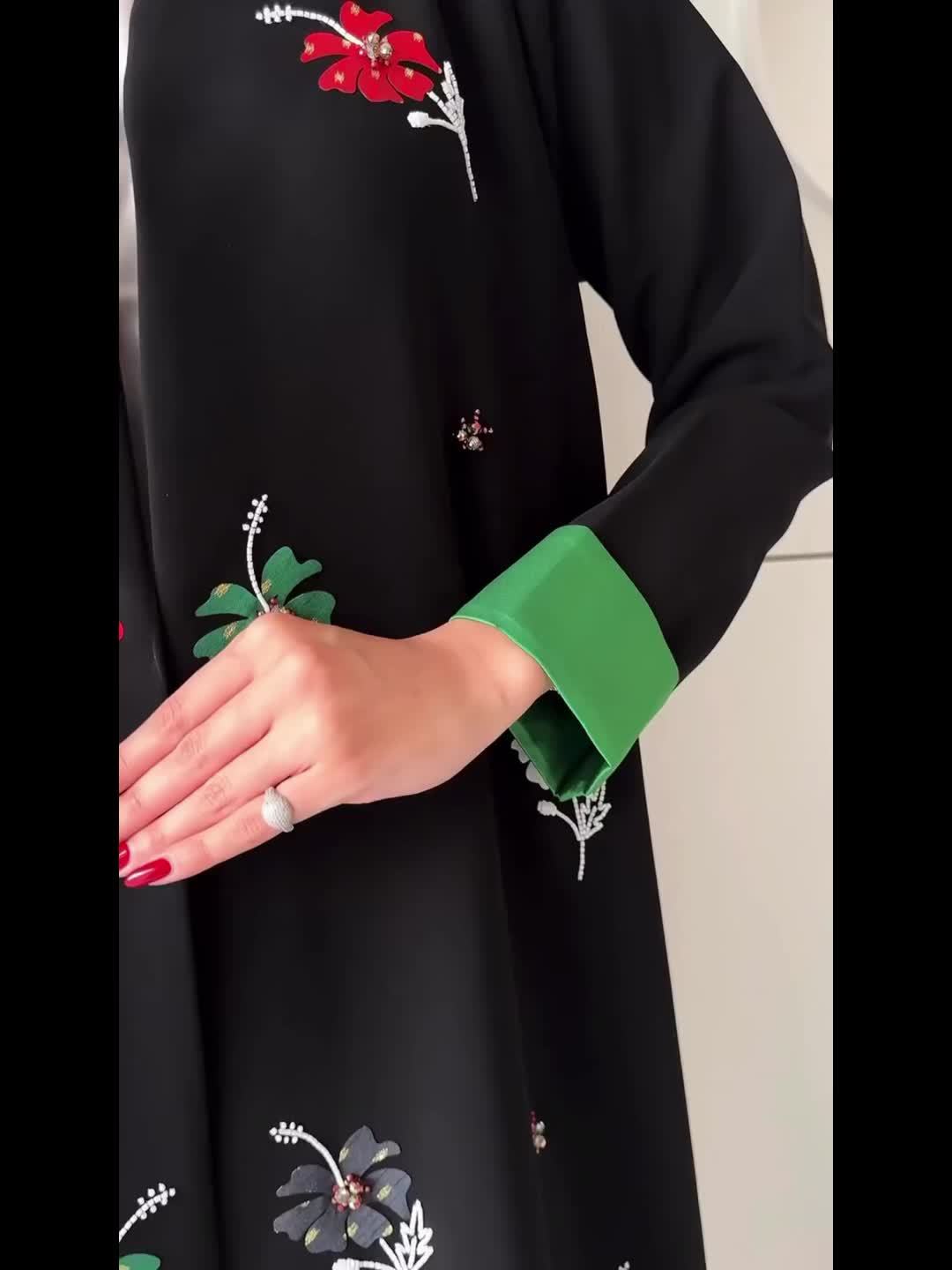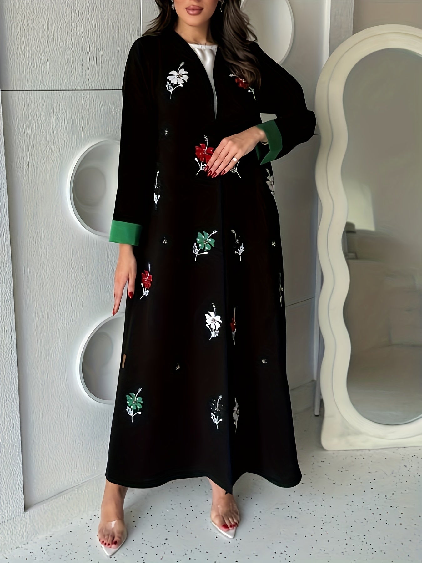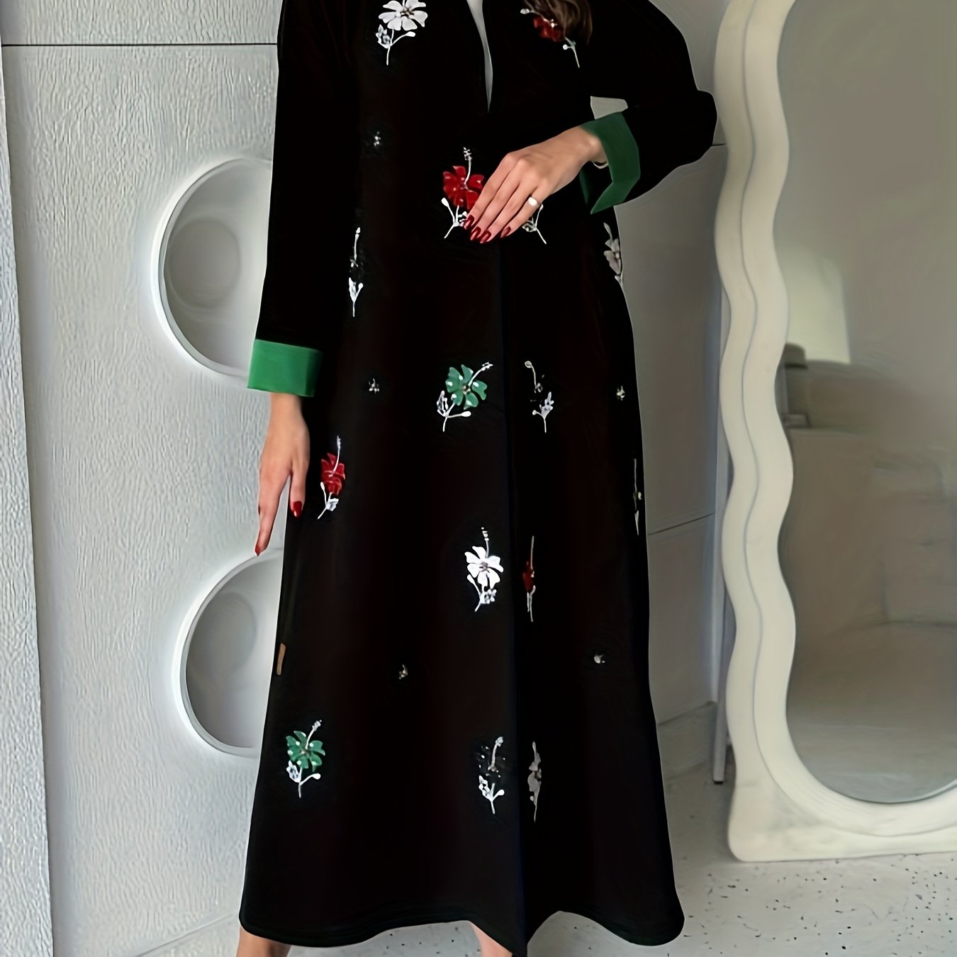 Women's Middle Eastern Turkish Kaftan Dress - Floral Print with Contrast Green Sleeves, Open Collar Long Sleeve Floor-Length Machine Washable Elegant Abaya for Casual & Formal Occasions, Nontransparent Fabric