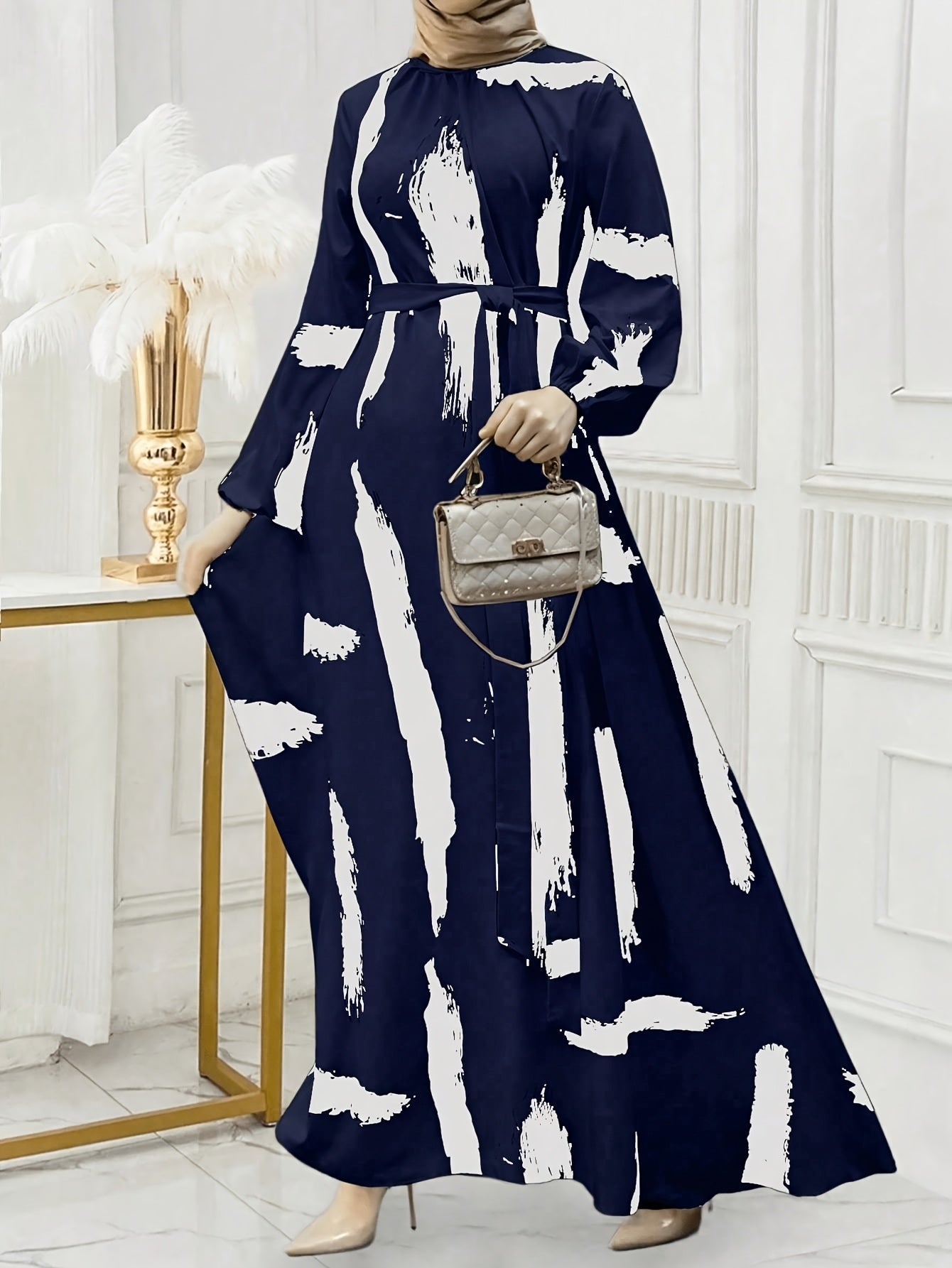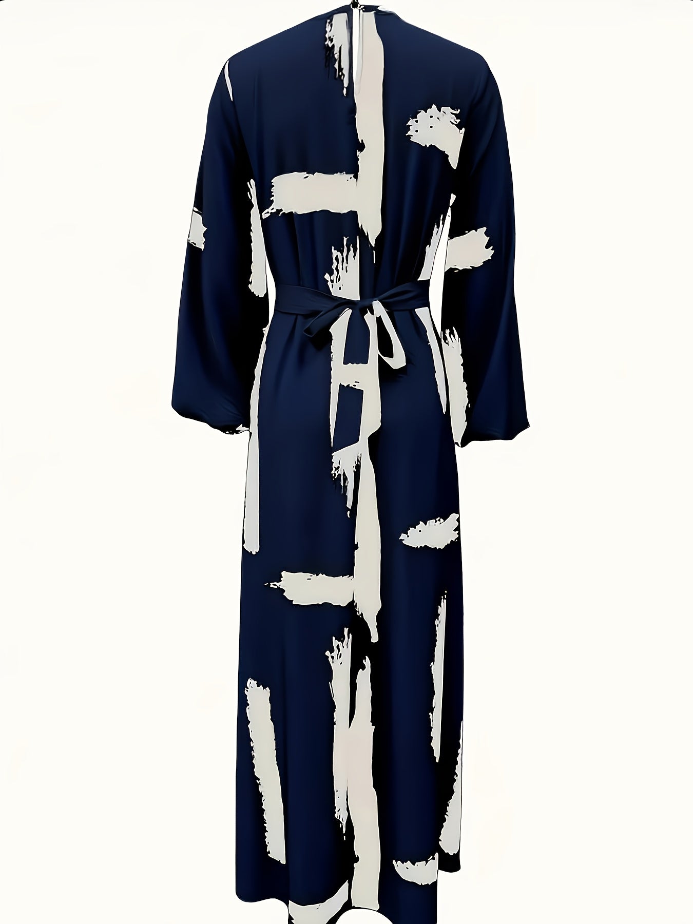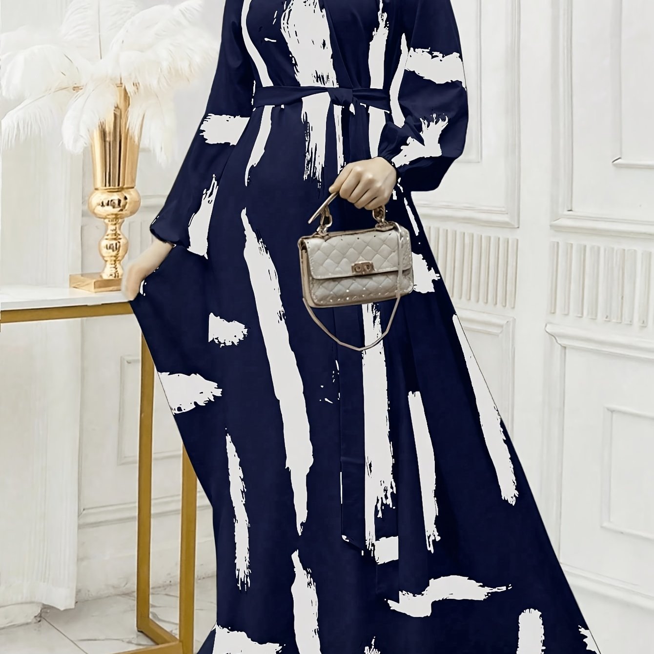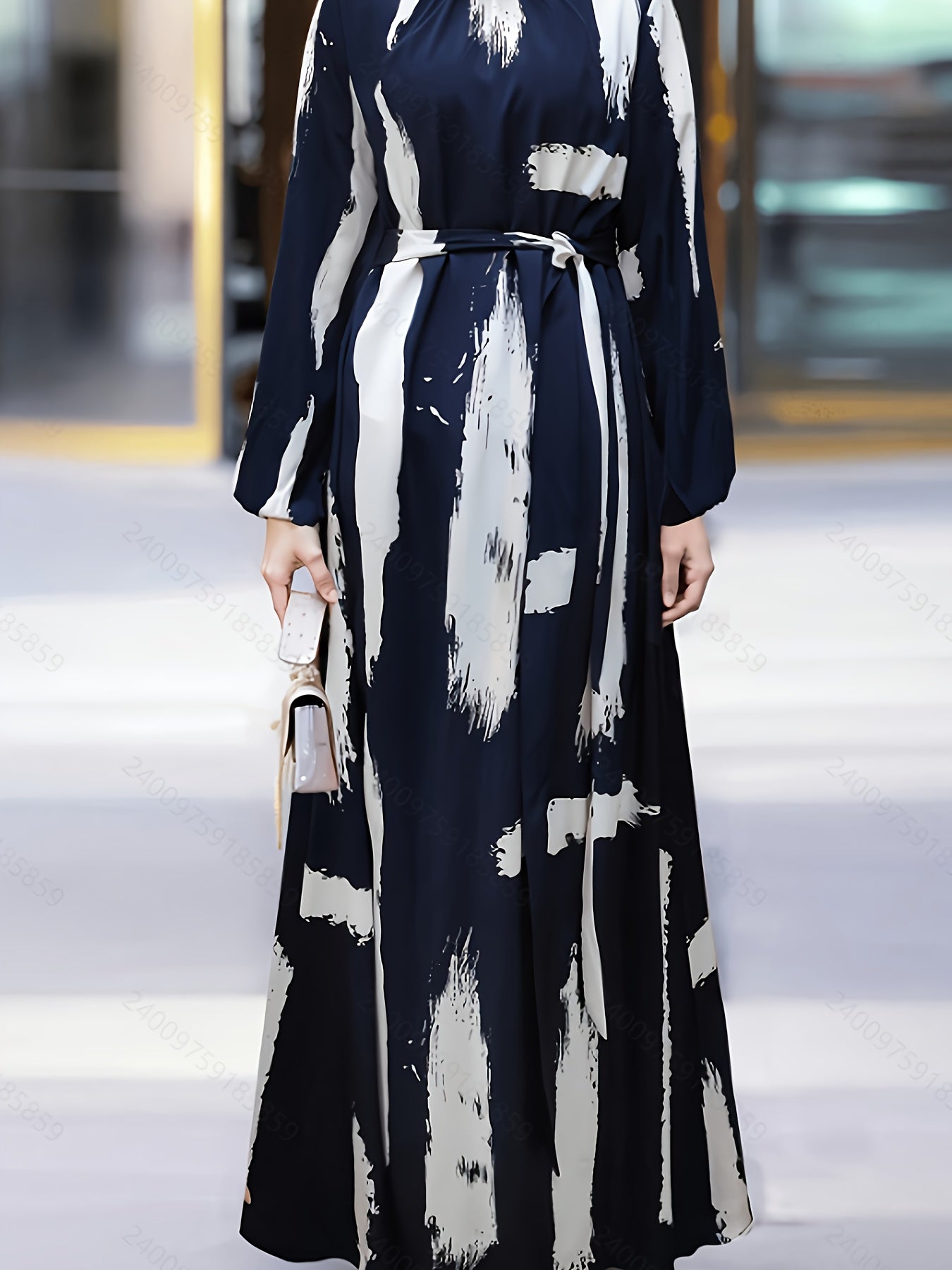 Women's Turkish Kaftan Dress - Navy & White Abstract Print Long Sleeve Midi Dress with Stand-Up Collar & Adjustable Waist Belt, Machine Washable All-Season Traditional Elegance for Casual or Formal Occasions
